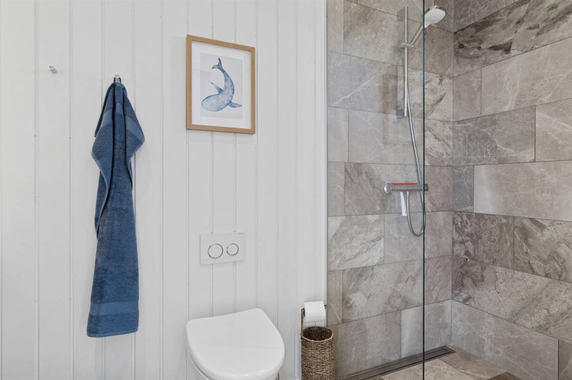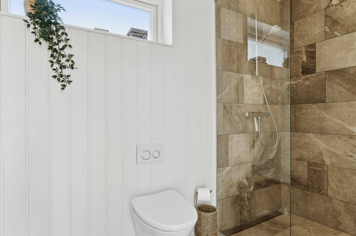 Große Glasfronten und Terrassentüren lassen die Natur herein, während elegante Materialien, italienischer Marmor und durchdachte Ausstattung von Svane eine Atmosphäre von Komfort und Qualität schaffen. Das Haus verfügt über drei Schlafzimmer und zwei Badezimmer im Haupthaus, und ein gemütliches Gästehaus mit zwei zusätzlichen Zimmern bietet ausreichend Platz für die ganze Familie.