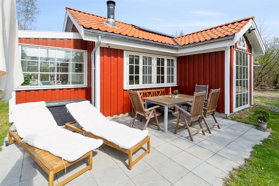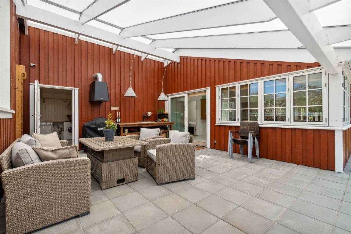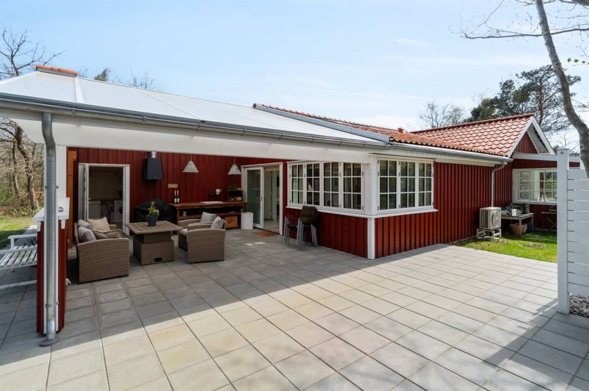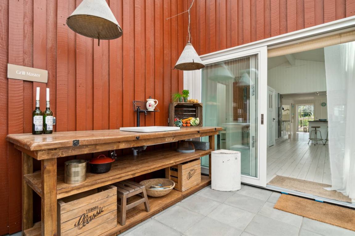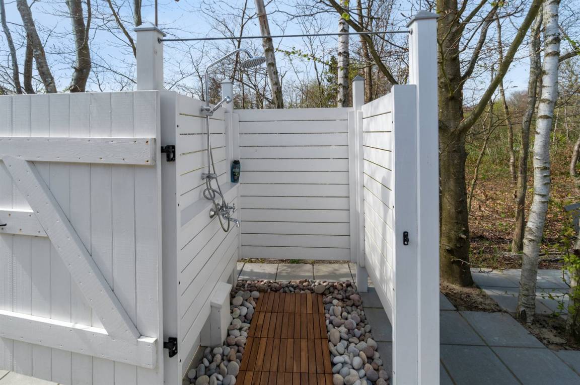Das Haus ist mit Terrassen nach Osten, Süden und Westen ausgestattet. Es gibt zwei offene Terrassen sowie eine große, schöne überdachte Terrasse von 30 Quadratmetern, sodass Sommerregen dem Familiengemütlichkeit keinen Abbruch tut. Hier findest du auch die Außenküche mit Warmwasser. Auf der Westterrasse befindet sich ebenfalls eine Außendusche mit Warmwasser. Das Haus ist mit einem 110-Liter-Warmwassertank ausgestattet.
