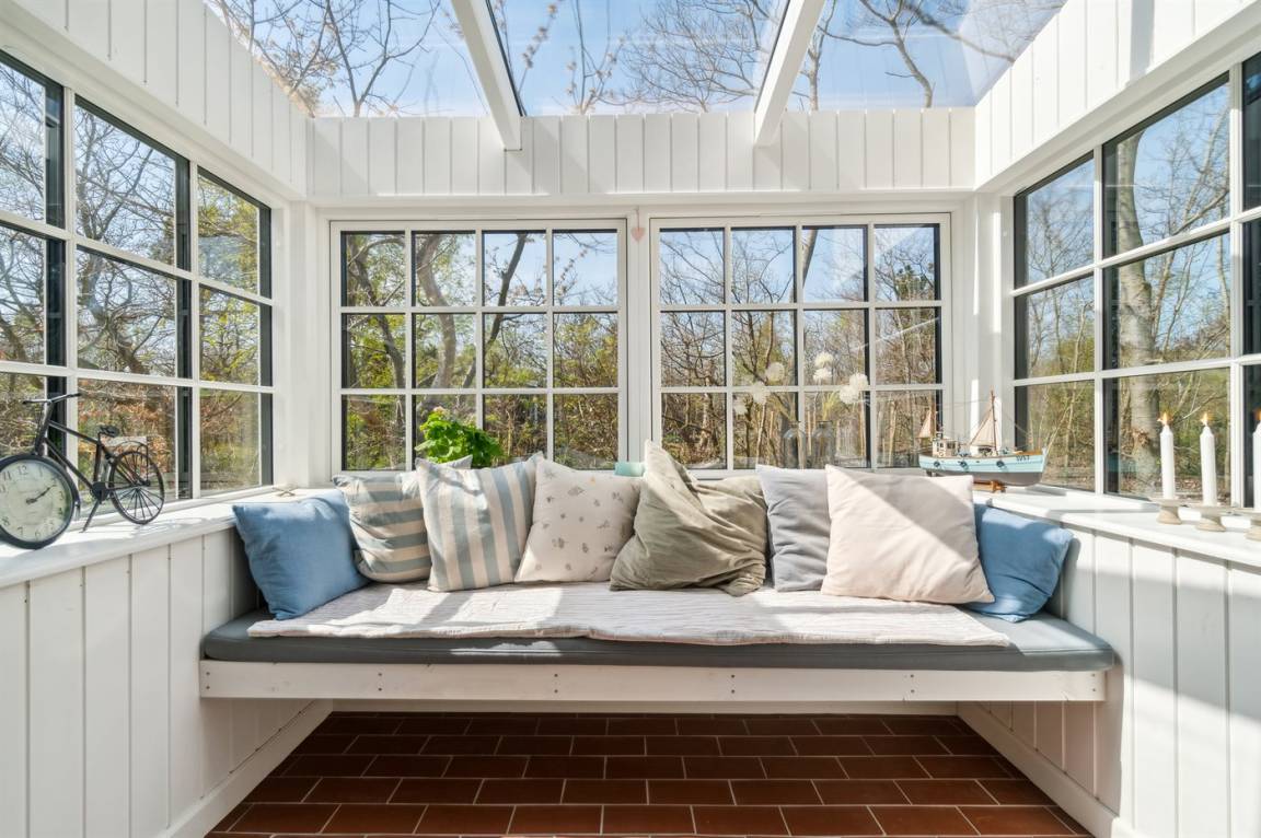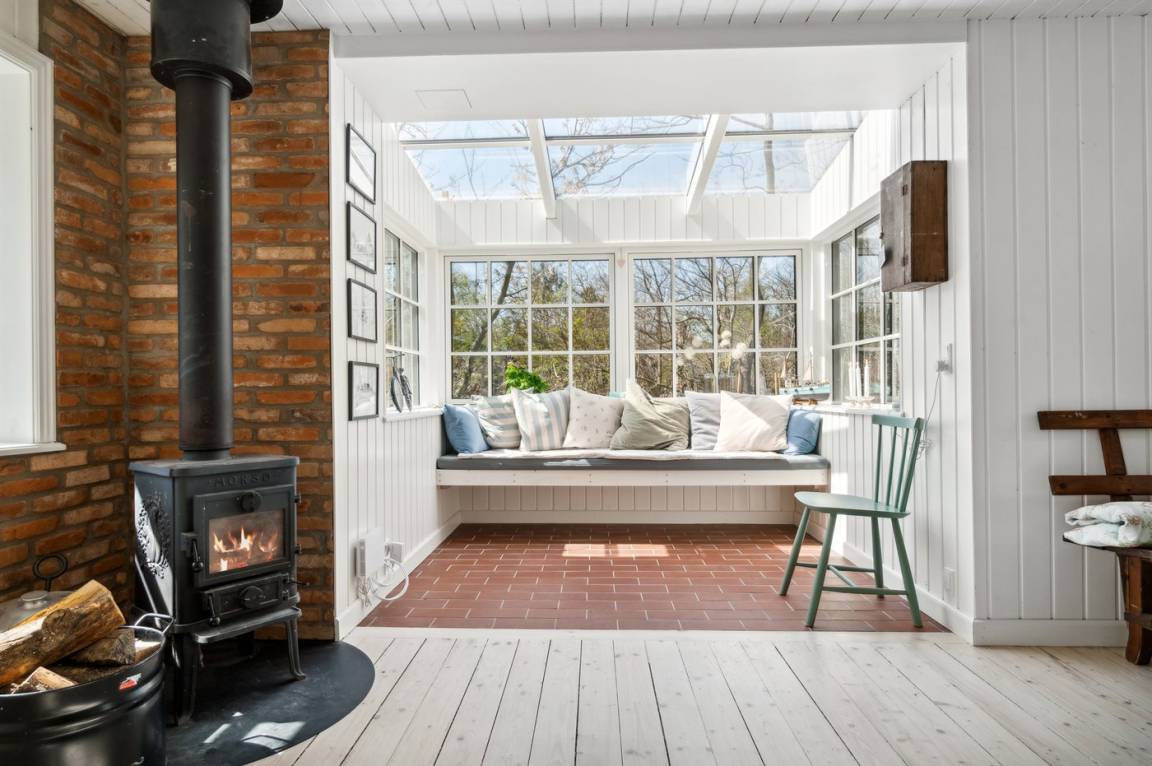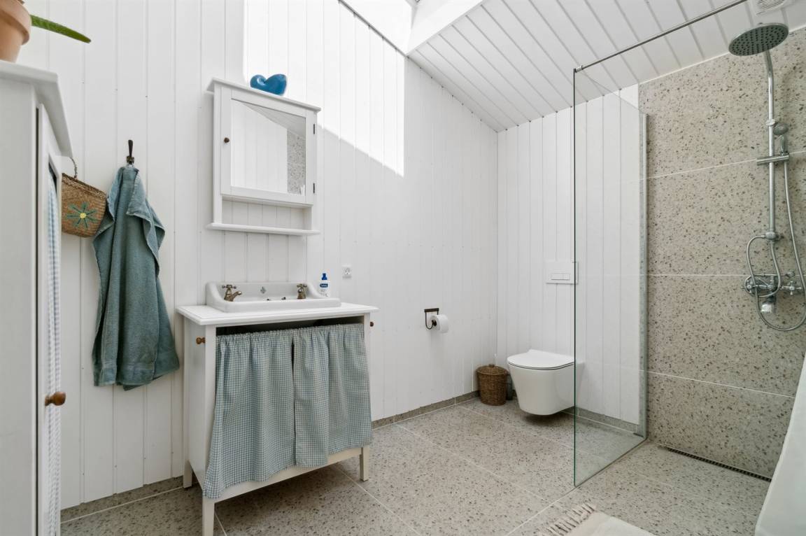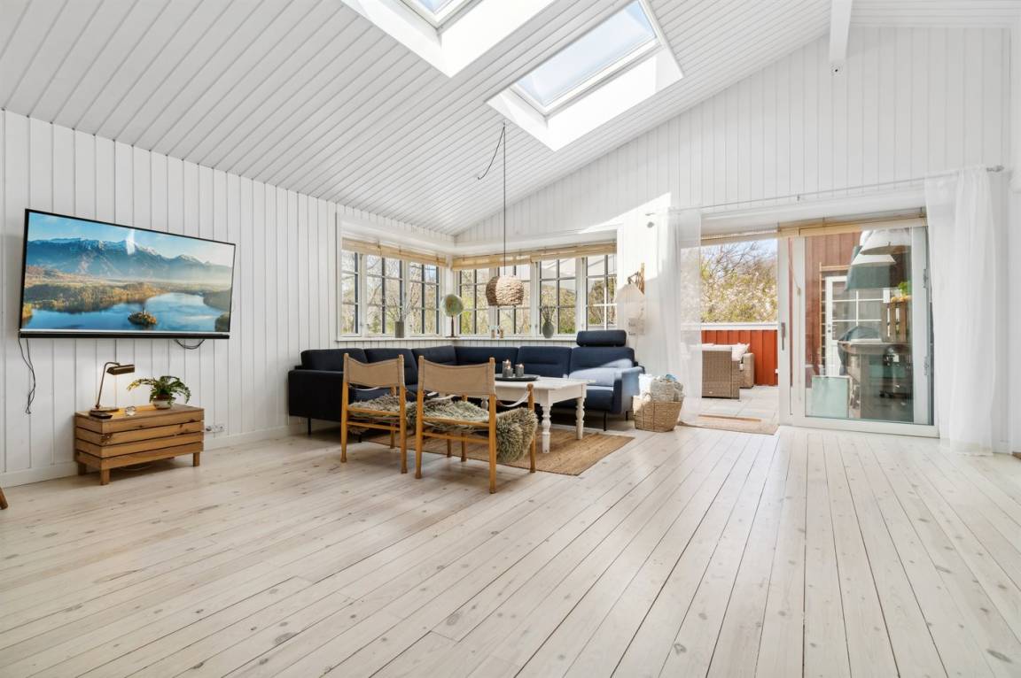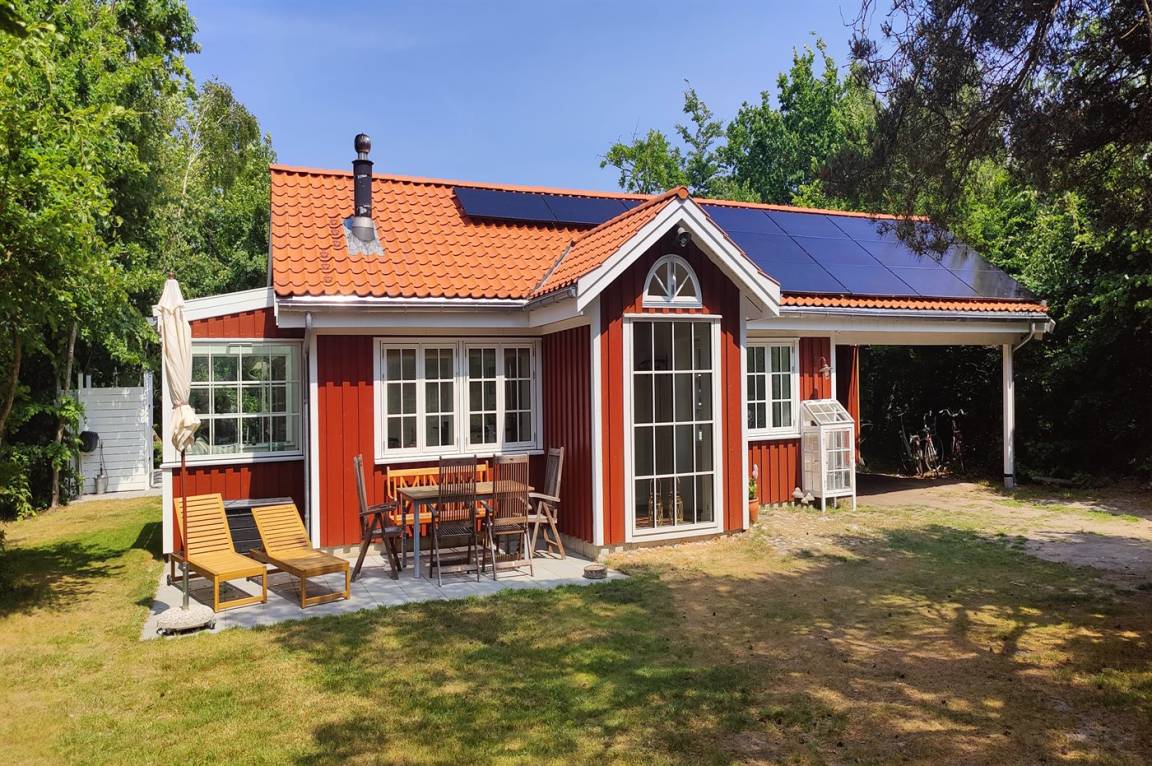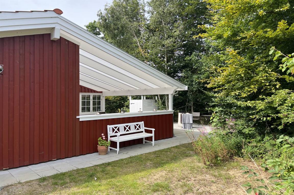 Das Haus ist mit Terrassen nach Osten, Süden und Westen ausgestattet. Es gibt zwei offene Terrassen sowie eine große, schöne überdachte Terrasse von 30 Quadratmetern, sodass Sommerregen dem Familiengemütlichkeit keinen Abbruch tut. Hier findest du auch die Außenküche mit Warmwasser. Auf der Westterrasse befindet sich ebenfalls eine Außendusche mit Warmwasser. Das Haus ist mit einem 110-Liter-Warmwassertank ausgestattet.