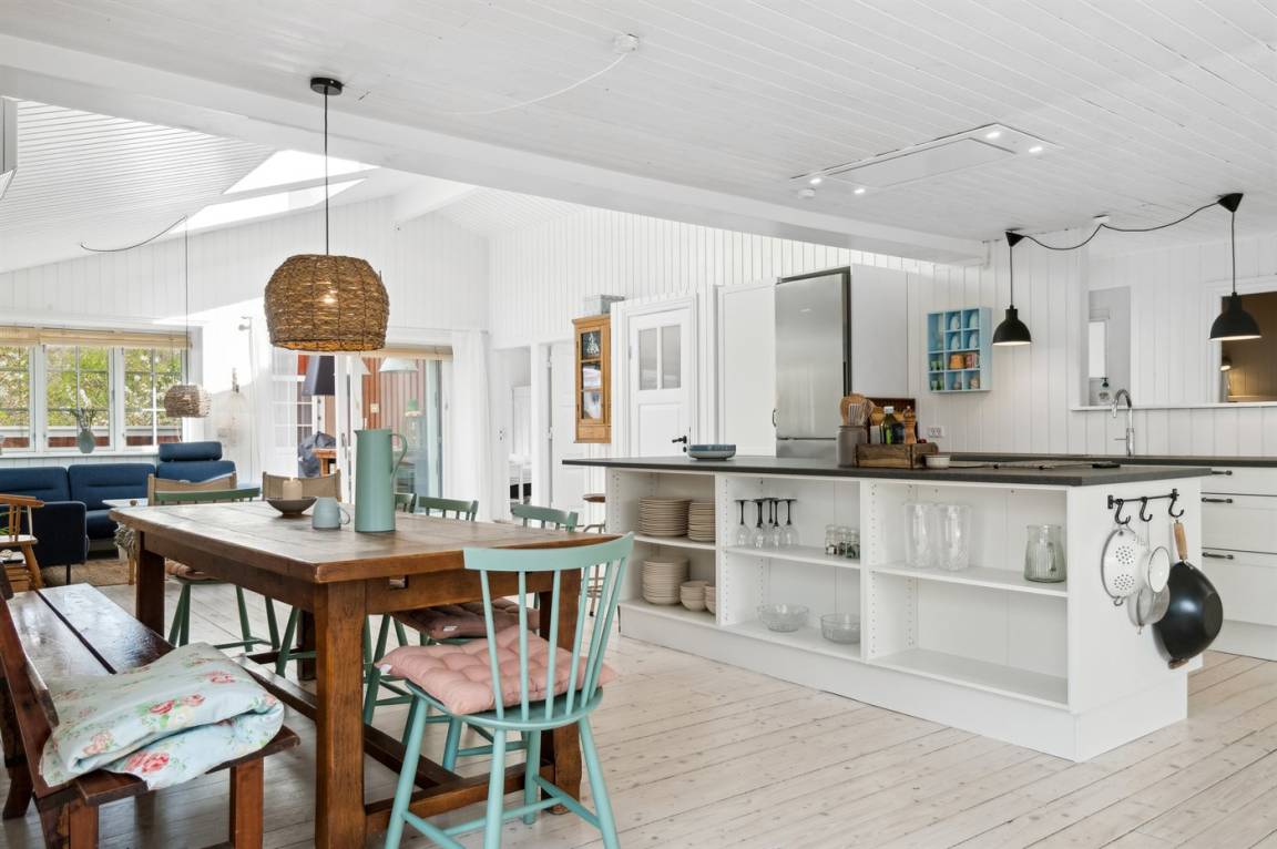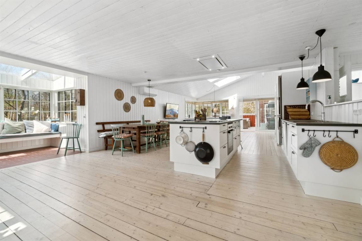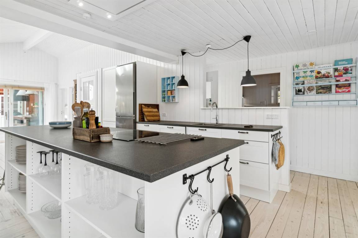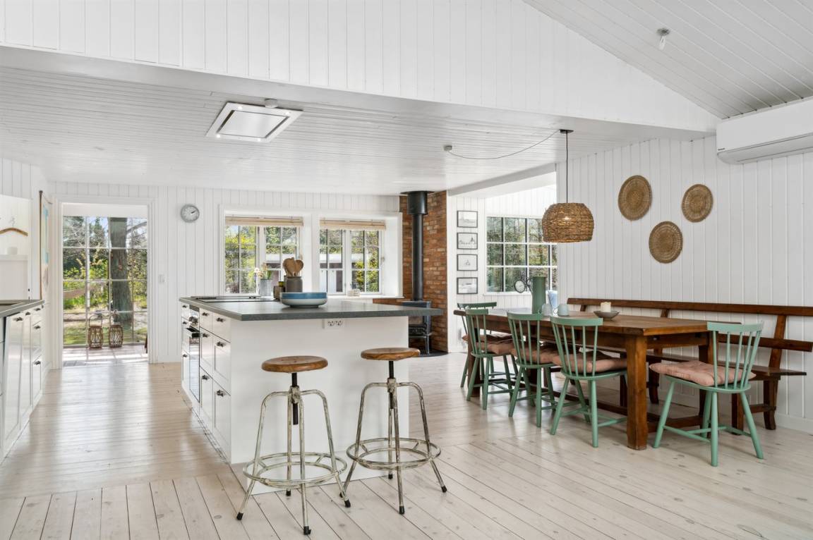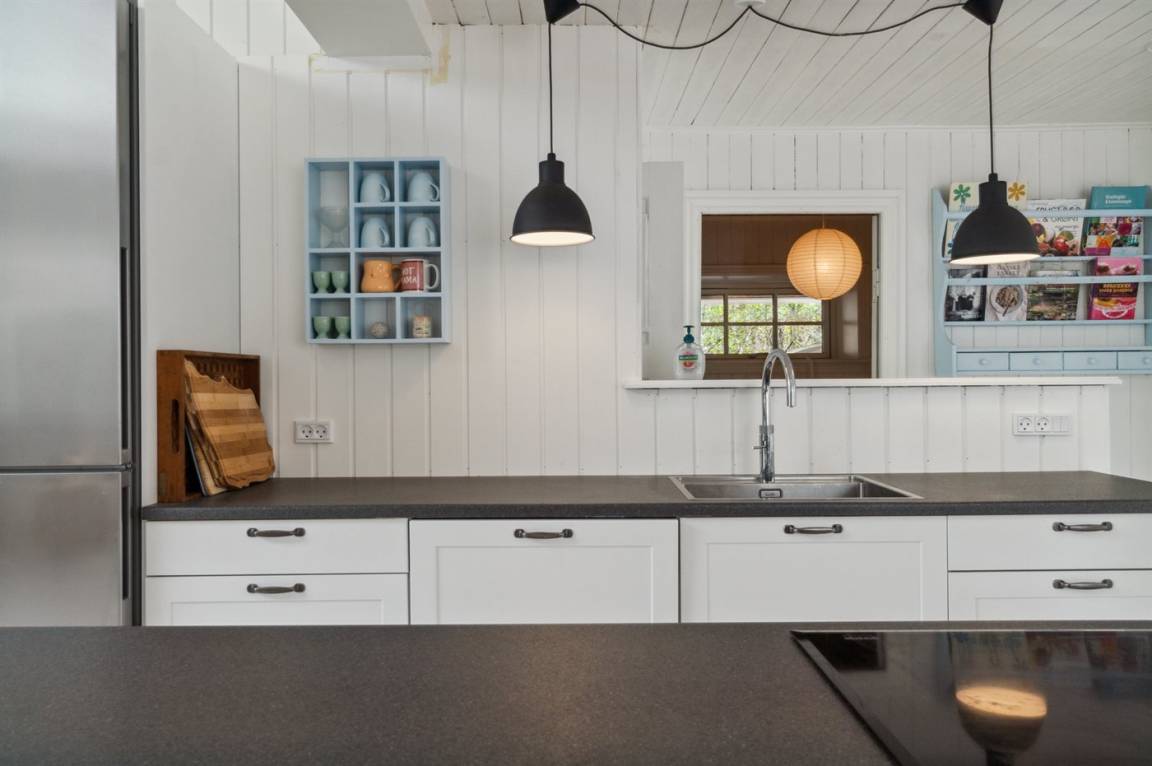 Das Ferienhaus verfügt über eine neue und funktionale Küche mit einem Quooker und anderen modernen Annehmlichkeiten. Die Küche ist offen gestaltet und verbindet sich mit dem Ess- und Wohnbereich, der viel Platz und Licht bietet, um köstliche Mahlzeiten mit den regionalen Produkten von Bornholm zuzubereiten und gleichzeitig Entspannung im Wohnzimmer zu genießen. Wenn du dich zurückziehen möchtest, ist die Fensternische ein perfekter Ort. Die Dachfenster in zwei der Schlafzimmer sind mit außenliegenden Rollläden ausgestattet, damit du tagsüber ungestört ruhen kannst. Das große Schlafzimmer verfügt über verstellbare Betten.