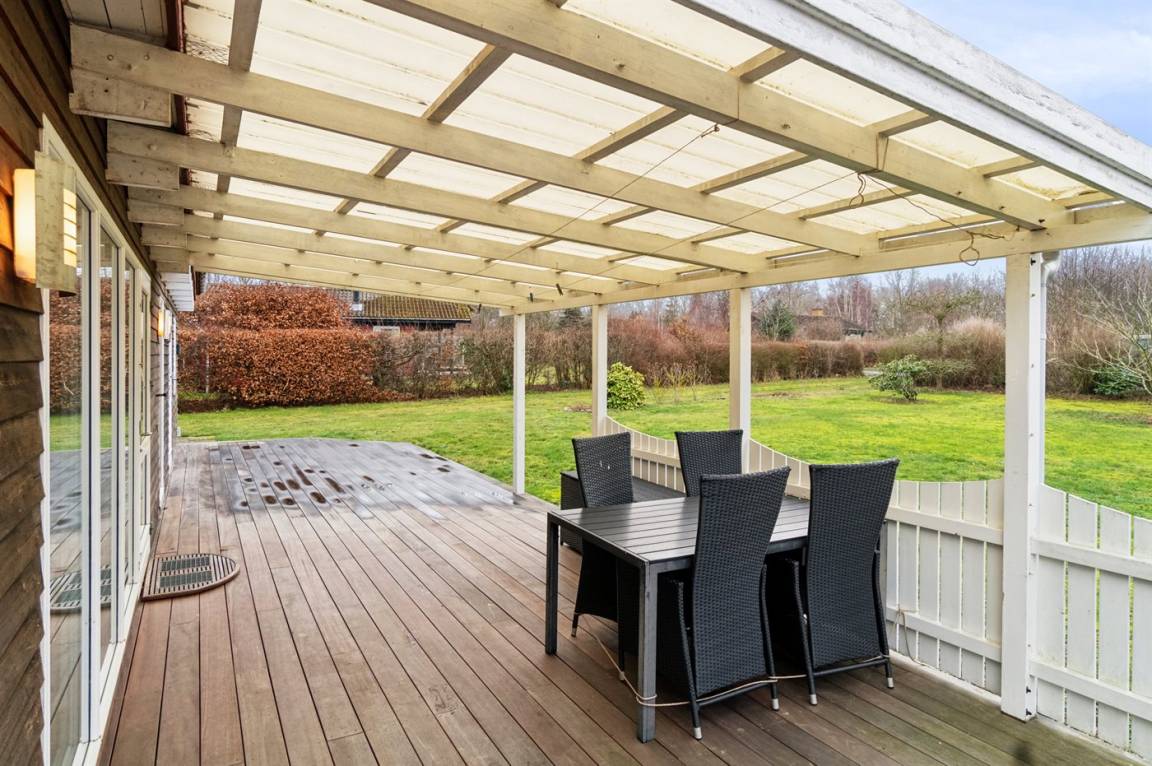 Die Außenwände des Hauses sind mit Holz verkleidet, was dem Haus einen ganz besonderen Charakter verleiht. Es gibt eine offene und schöne, überdachte Terrasse, die zu Stunden im Freien einlädt, wo du die Sonne, ein gutes Buch oder einfach die Aussicht auf die Umgebung genießen kannst.