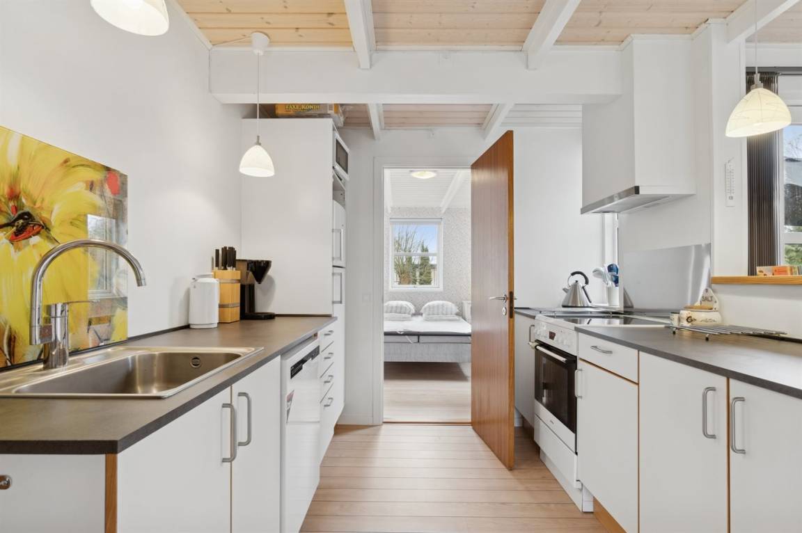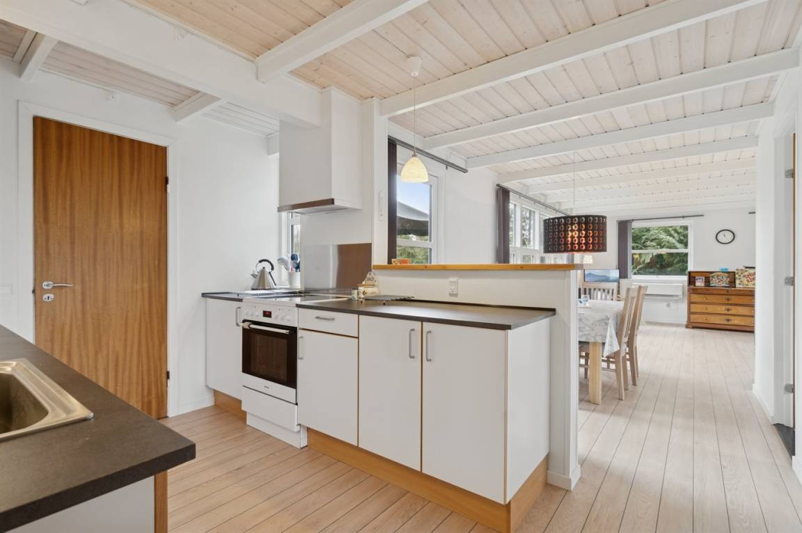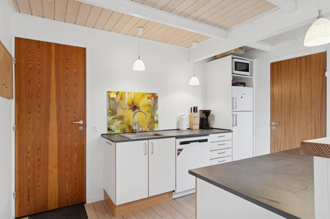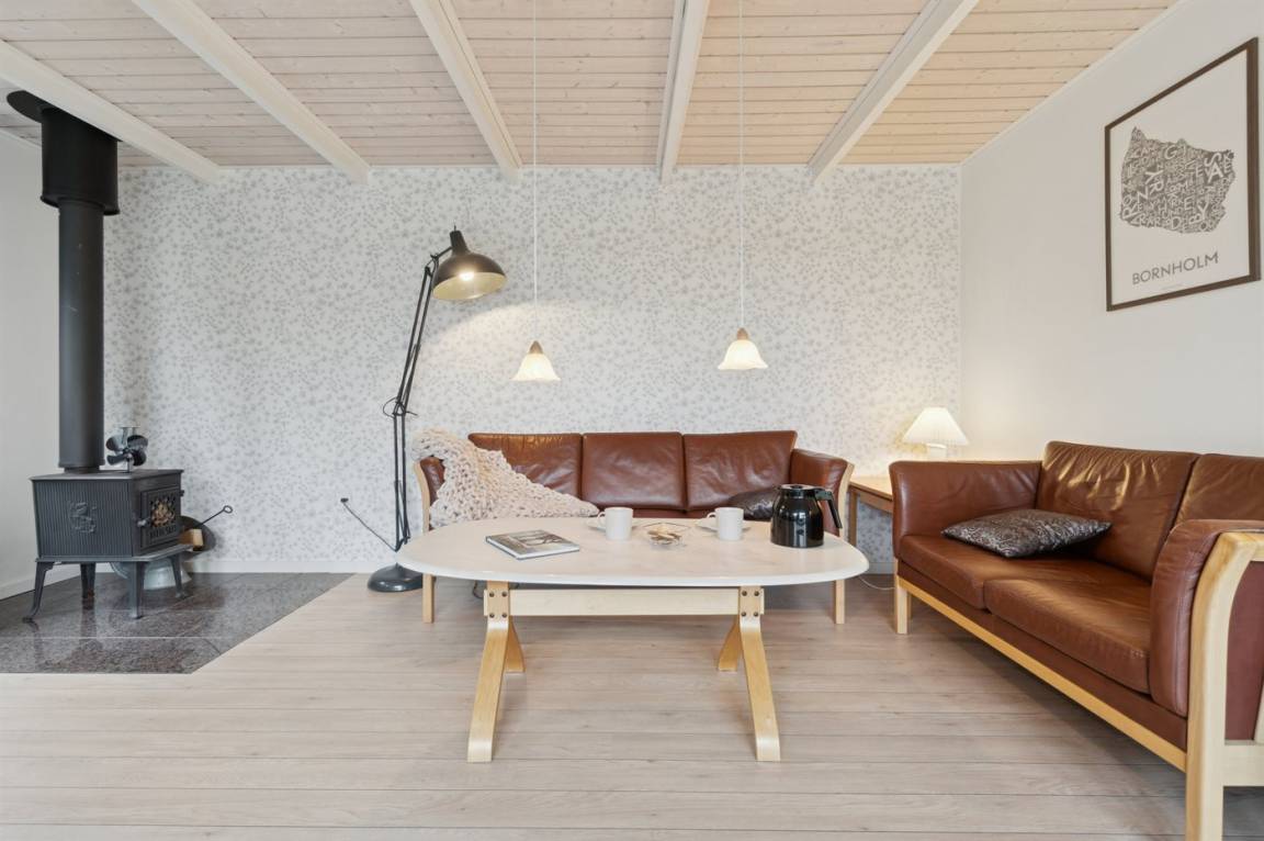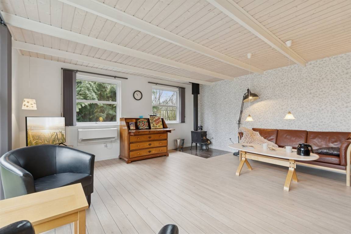 Das große Wohnzimmer des Ferienhauses hat einen direkten Zugang zur Steinterrasse, wo du – wenn das Wetter es zulässt – dein Mittagessen genießen kannst. Innen erwarten dich helle Wände, aufgehellte Holzdecken und ein schöner Holzfußboden. Neben der Wärmepumpe kannst du auch den Kaminofen nutzen, um die große Wohnküche zu beheizen. Zusätzlich zu den drei Schlafzimmern gibt es einen Hauswirtschaftsraum, der mit dem Eingangsbereich kombiniert ist. Ein separater kleiner Raum mit Waschmaschine ist ebenfalls vorhanden. Das Badezimmer ist gepflegt und modern.