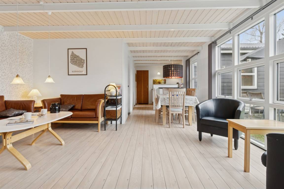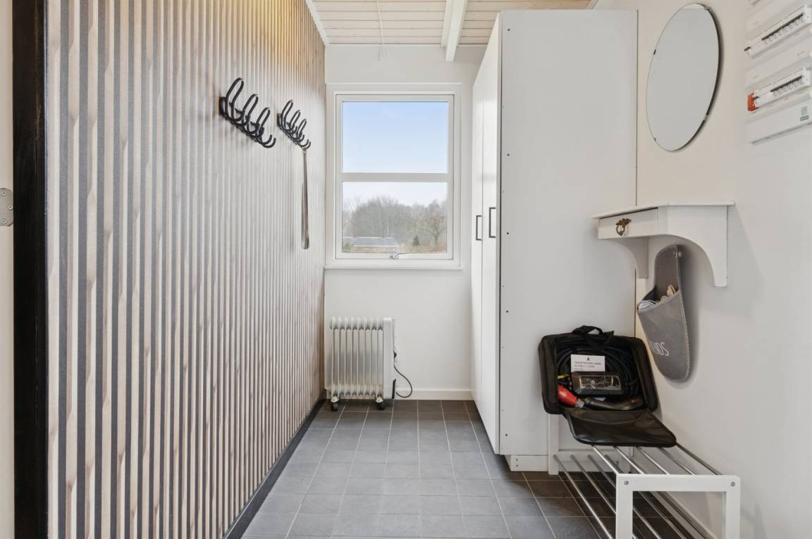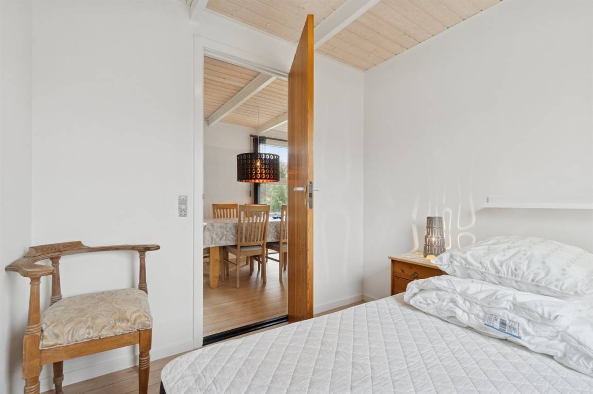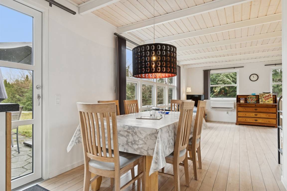 Das große Wohnzimmer des Ferienhauses hat einen direkten Zugang zur Steinterrasse, wo du – wenn das Wetter es zulässt – dein Mittagessen genießen kannst. Innen erwarten dich helle Wände, aufgehellte Holzdecken und ein schöner Holzfußboden. Neben der Wärmepumpe kannst du auch den Kaminofen nutzen, um die große Wohnküche zu beheizen. Zusätzlich zu den drei Schlafzimmern gibt es einen Hauswirtschaftsraum, der mit dem Eingangsbereich kombiniert ist. Ein separater kleiner Raum mit Waschmaschine ist ebenfalls vorhanden. Das Badezimmer ist gepflegt und modern.