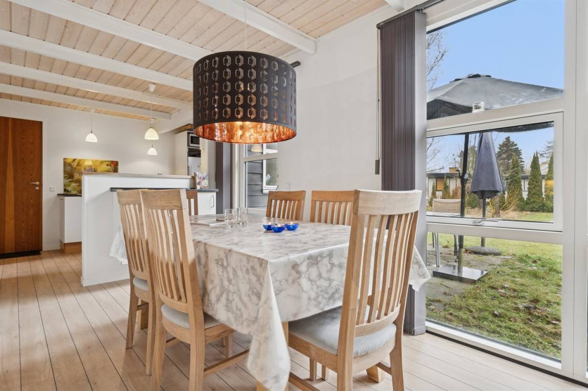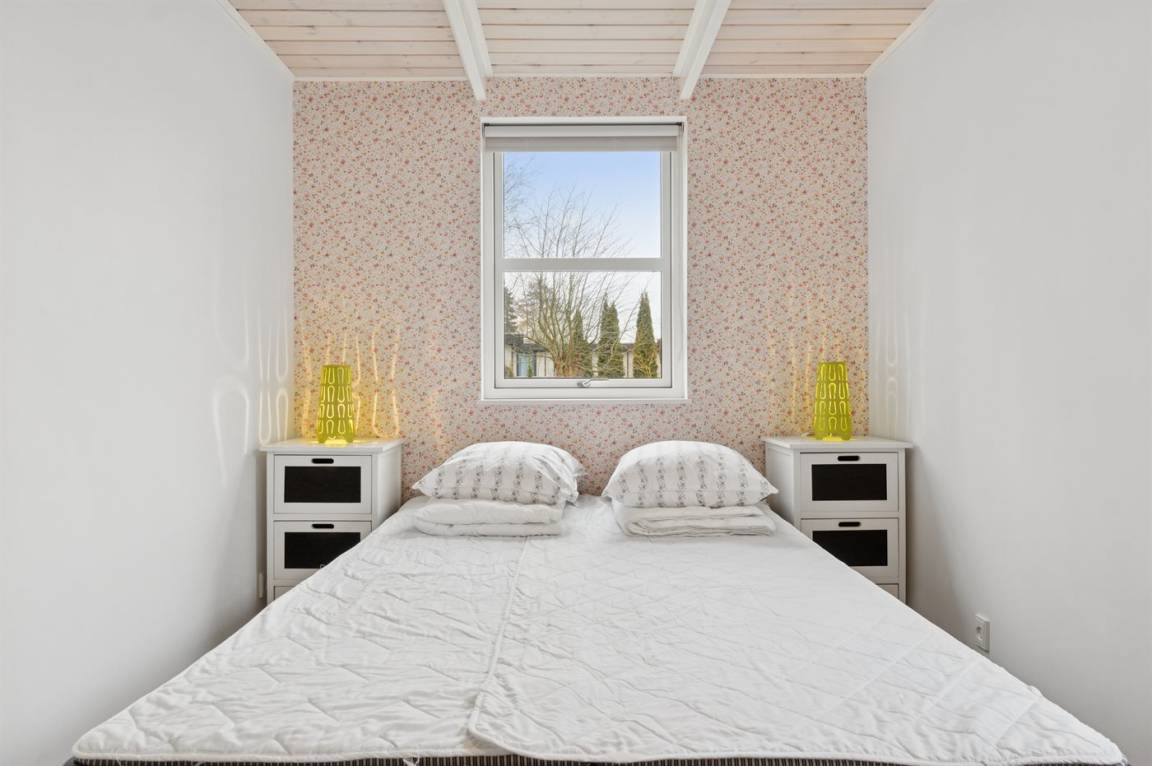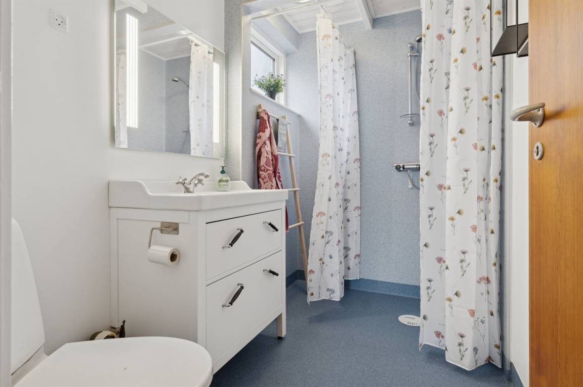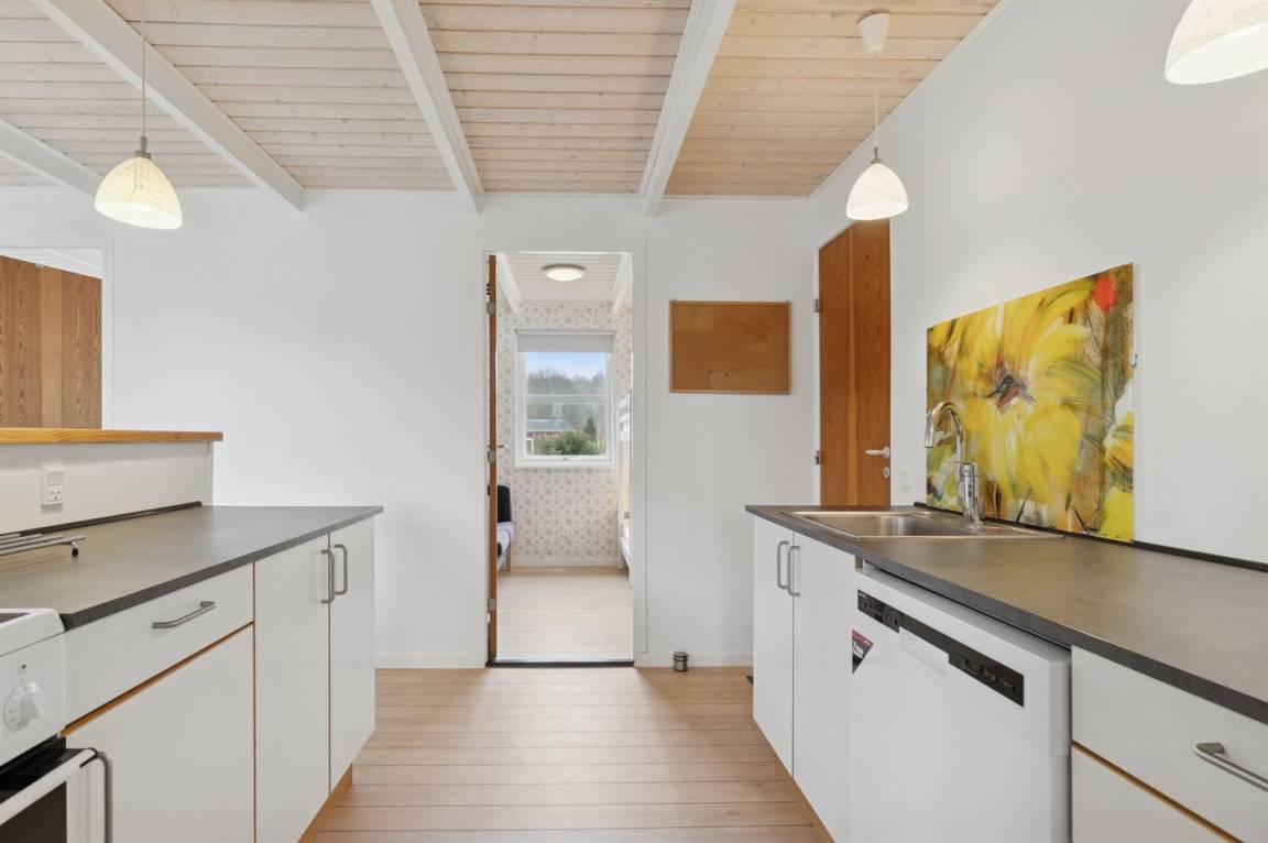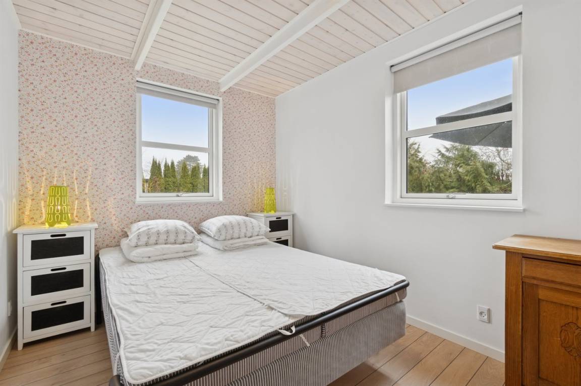 Das große Wohnzimmer des Ferienhauses hat einen direkten Zugang zur Steinterrasse, wo du – wenn das Wetter es zulässt – dein Mittagessen genießen kannst. Innen erwarten dich helle Wände, aufgehellte Holzdecken und ein schöner Holzfußboden. Neben der Wärmepumpe kannst du auch den Kaminofen nutzen, um die große Wohnküche zu beheizen. Zusätzlich zu den drei Schlafzimmern gibt es einen Hauswirtschaftsraum, der mit dem Eingangsbereich kombiniert ist. Ein separater kleiner Raum mit Waschmaschine ist ebenfalls vorhanden. Das Badezimmer ist gepflegt und modern.