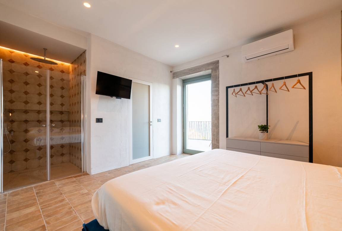 The two double bedrooms, both with air conditioning and TV, are cozy, but the concept of their "en suite" bathrooms is really stunning. Except for the toilets, they are integrated into the rooms. In the bedroom which opens onto one of the two terraces (ca. 12 m²), it is a large walk-in shower.