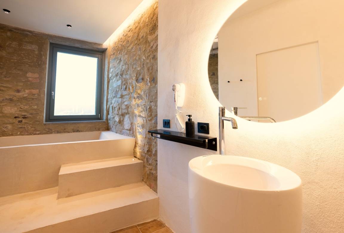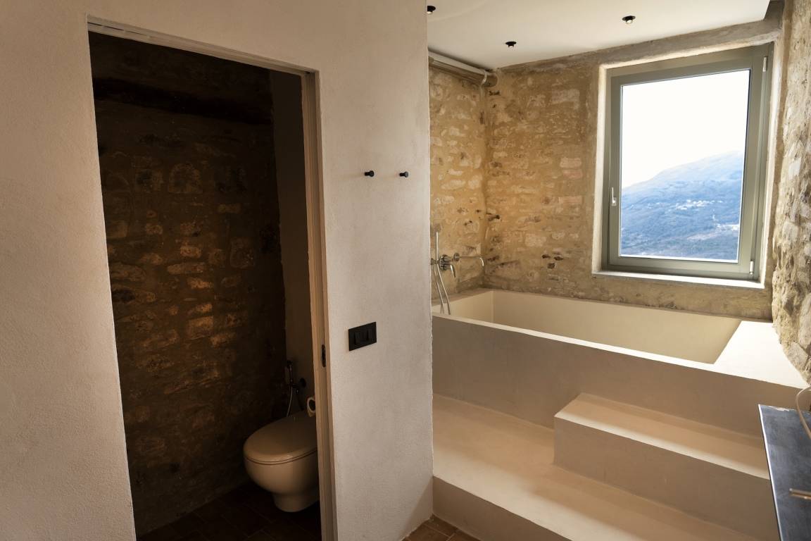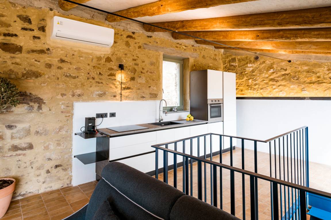Exposed stone walls add a special touch to the rooms, a touch which in the living area is complemented by chestnut wood beams on the ceiling. The large floor-to-ceiling windows/French doors on the attic floor let in a lot of light and enable you to admire the beautiful panorama from almost everywhere in the room.