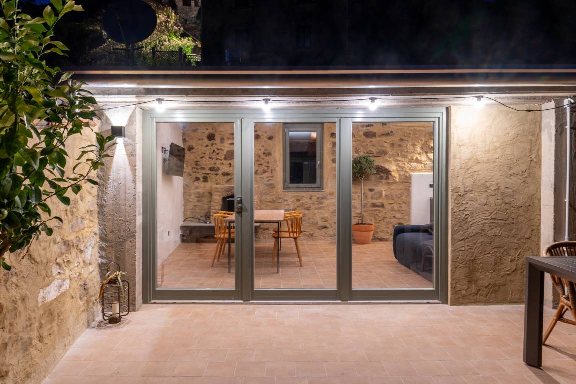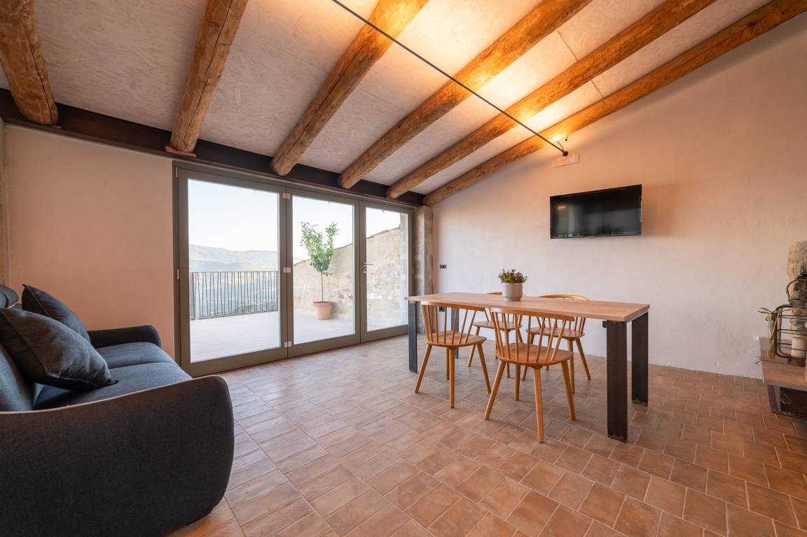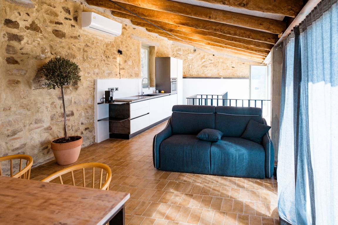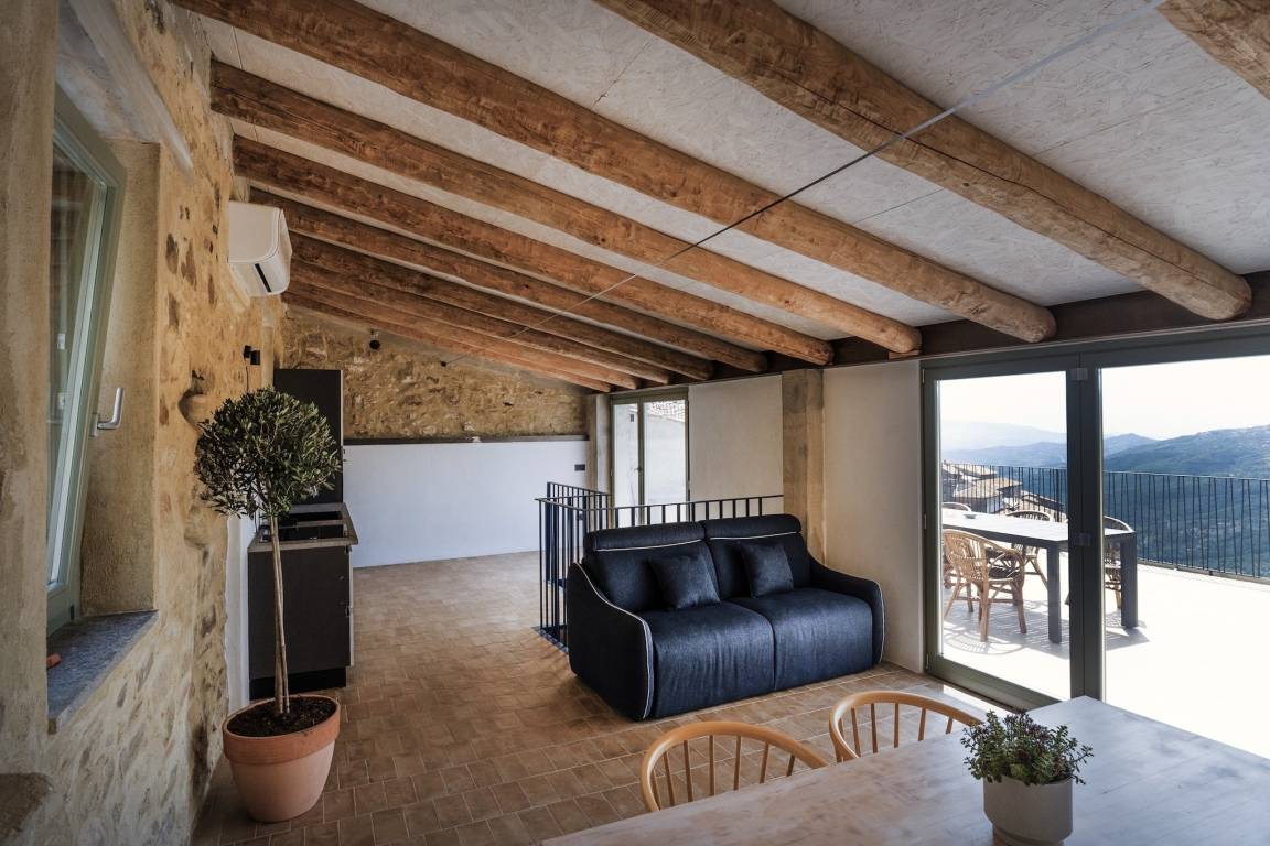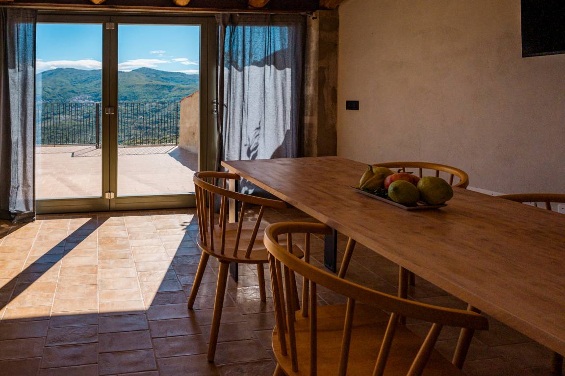 Die teils freigelegten Steinmauern und die Holzbalkendecke aus Kastanie sorgen insbesondere im Wohnbereich für Flair. Hinzu kommt hier die große Fensterfront, die viel Licht ins Innere lässt und nichts von dem schönen Panorama nimmt, das man sowohl vom Esstisch als auch vom Sofa und der Küche aus bewundern kann.