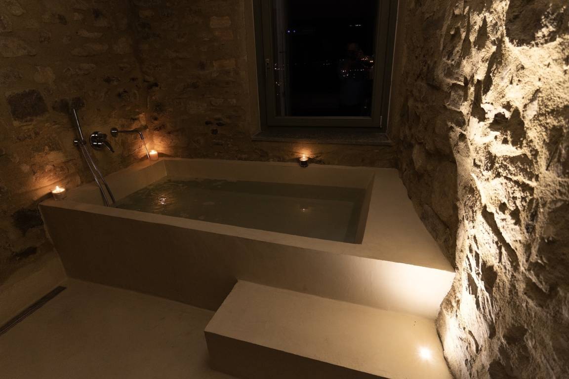 Im zweiten Schlafzimmer befindet sich unterhalb des Fensters mit Bergblick eine große Badewanne in moderner Betonoptik sowie, ein wenig versteckt, eine separate Dusche. Ein Hingucker ist auch das freistehende Waschbecken im Zimmer.