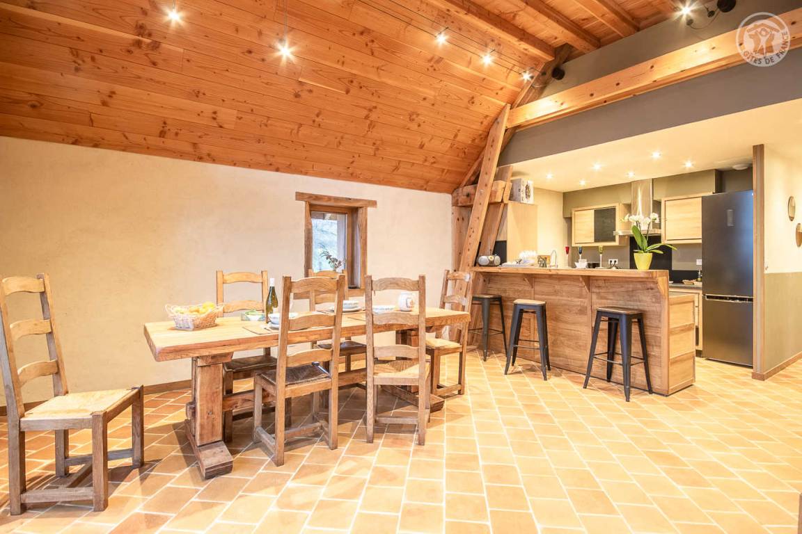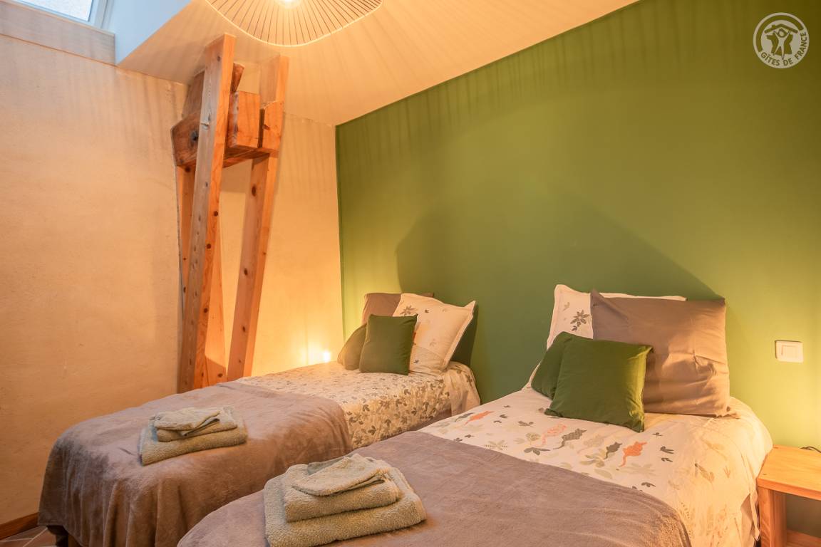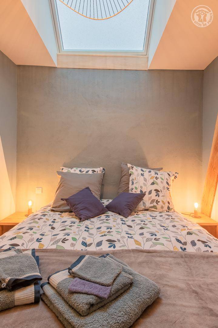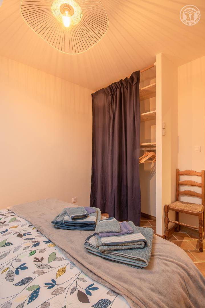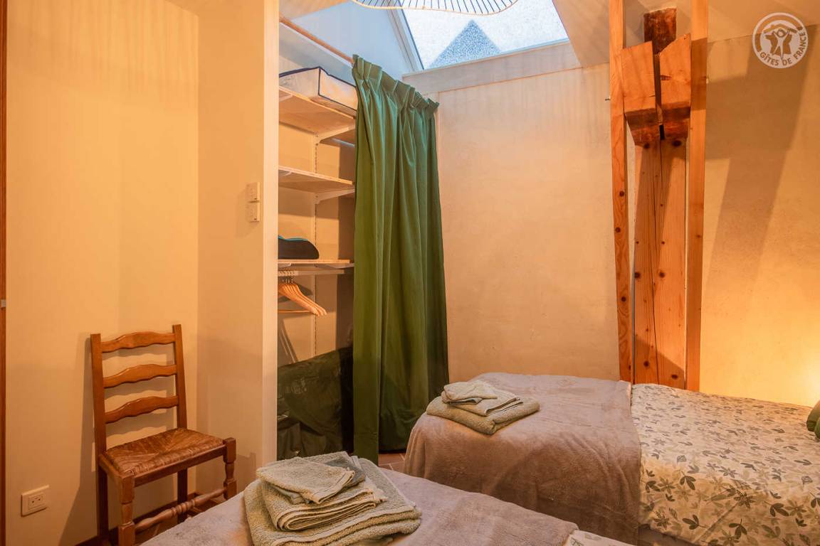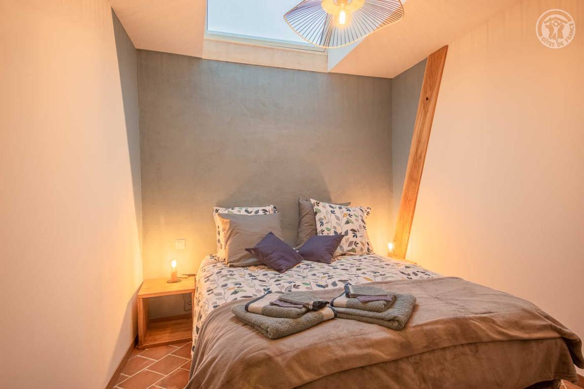 Ferienhaus in einem Haus, das an das der Eigentümer grenzt, mit unabhängigem Zugang (3 Stufen), bestehend aus einer Eingangshalle, einem Wohnzimmer-Küchen-Loungebereich (Bluetooth-Lautsprecher), 3 Schlafzimmern (1 Doppelbett 160 x 200 cm / 1 Doppelbett 160 x 200 cm / 2 Einzelbetten 90x200 cm, die zu 1 Doppelbett 180x200 cm zusammengestellt werden können), ein Badezimmer (ebenerdige Dusche), separates WC (Waschbecken). Überdachte Terrasse 30 m². Ladesteckdose für Elektrofahrzeuge (7,2 KWH).