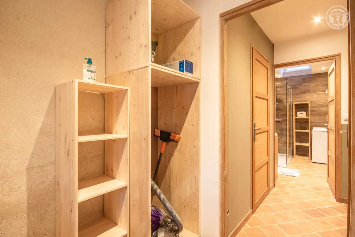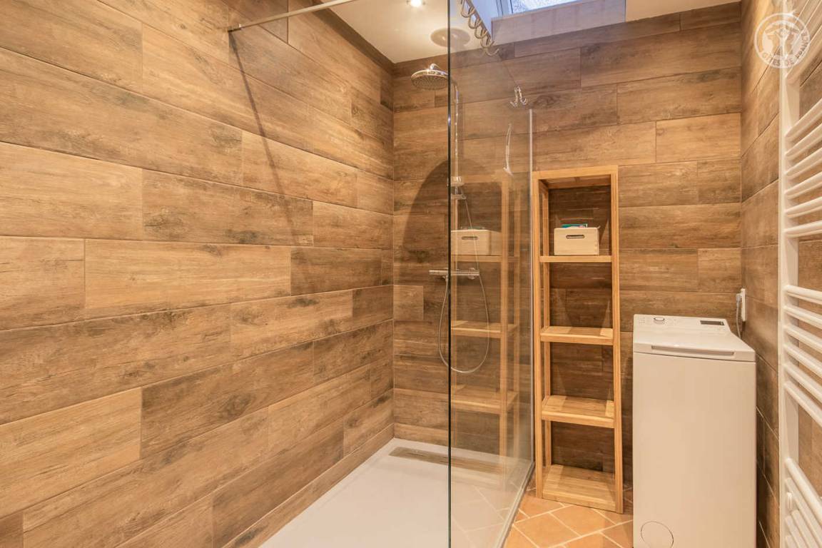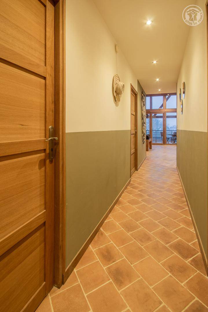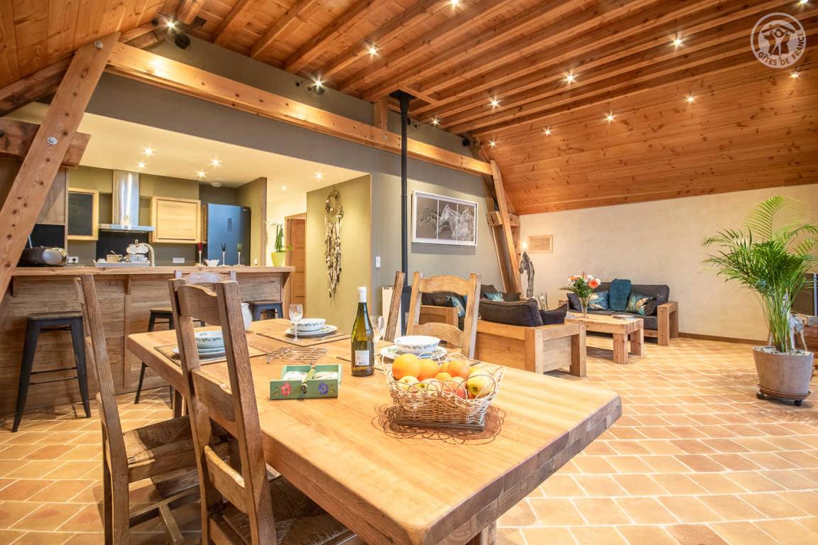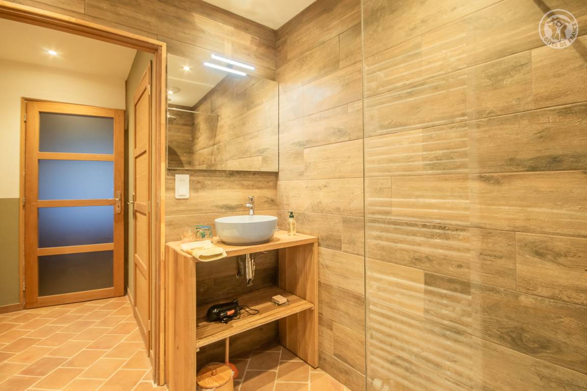 Ferienhaus in einem Haus, das an das der Eigentümer grenzt, mit unabhängigem Zugang (3 Stufen), bestehend aus einer Eingangshalle, einem Wohnzimmer-Küchen-Loungebereich (Bluetooth-Lautsprecher), 3 Schlafzimmern (1 Doppelbett 160 x 200 cm / 1 Doppelbett 160 x 200 cm / 2 Einzelbetten 90x200 cm, die zu 1 Doppelbett 180x200 cm zusammengestellt werden können), ein Badezimmer (ebenerdige Dusche), separates WC (Waschbecken). Überdachte Terrasse 30 m². Ladesteckdose für Elektrofahrzeuge (7,2 KWH).