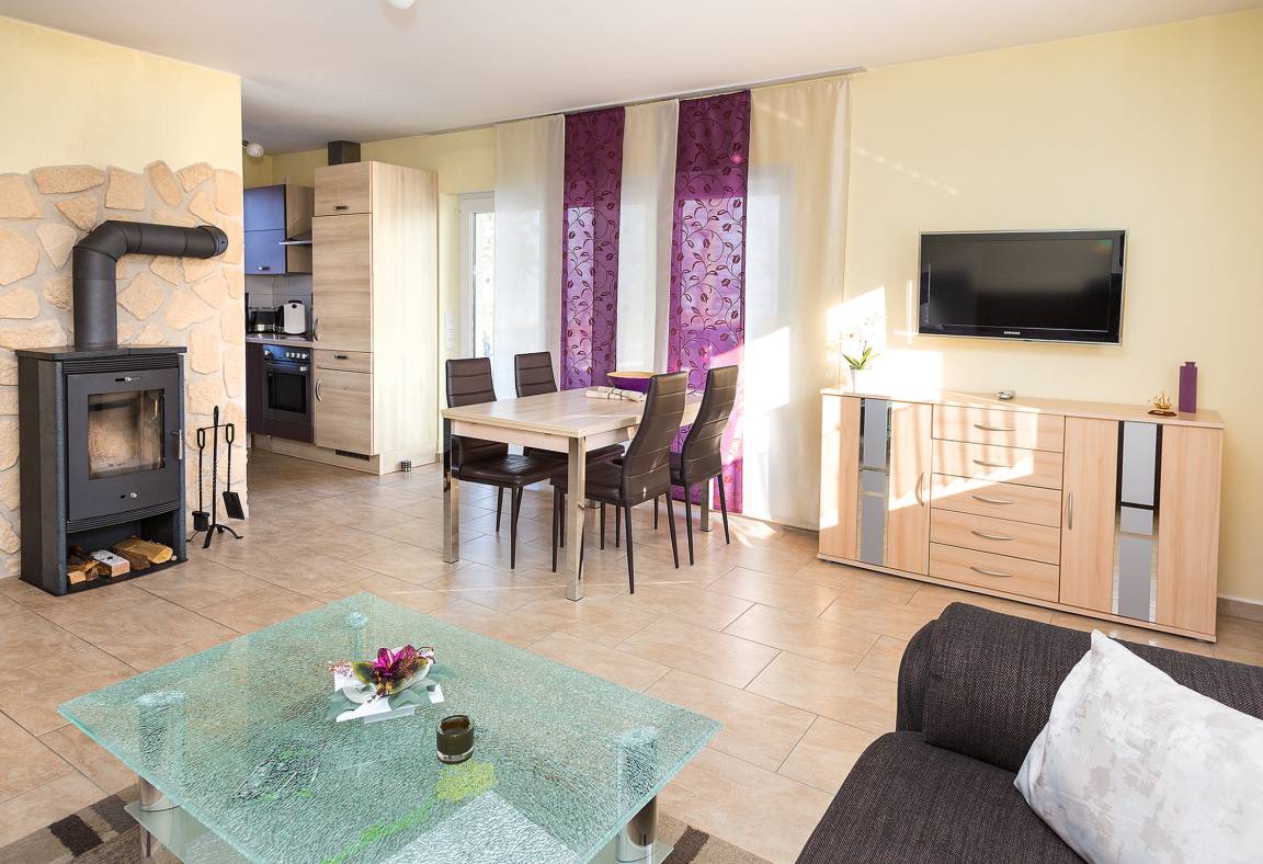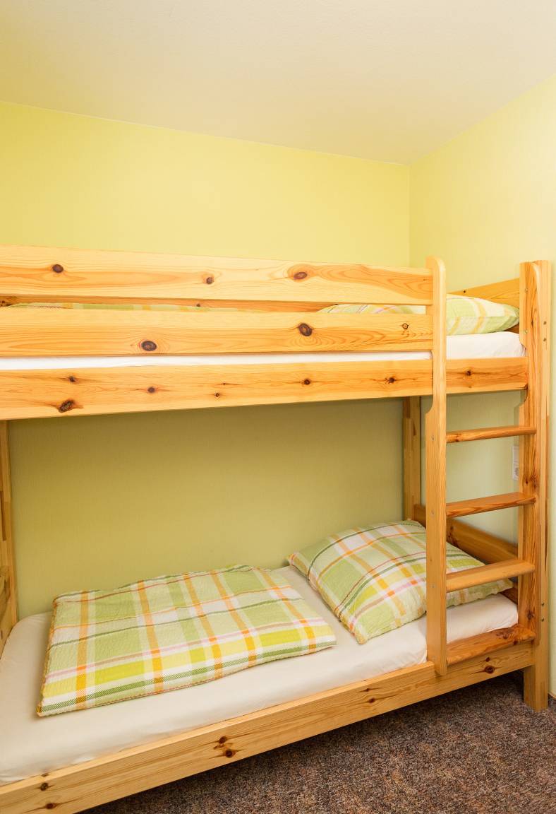 Die Wohnung verfügt über 2 Schlafzimmer (eines mit Doppelbett, ein weiteres mit Etagenbett), Bad mit Dusche und WC. Der Wohnraum mit Essplatz besitzt eine Aufbettungsmöglichkeit auf der Schlafcouch. An kühleren Tagen können Sie gemütliche Stunden am Kaminofen verbringen.