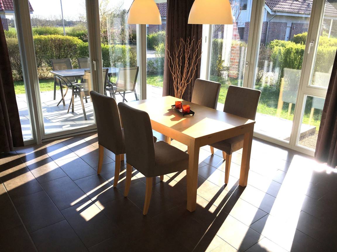 Das Ferienhaus befindet sich in einer ruhigen Lage und ist in der Nähe von einer großzügigen Wiese und vereinzelten Bäumen umgeben. Das große und schön eingewachsene Grundstück ist mit Vogelschutzhecken abgegrenzt und schafft so einen natürlichen und privaten Schutzraum. Die große Terrasse und der Garten sorgen dafür, dass ganz viel Urlaubszeit im Freien verbracht werden kann. Sowohl Gartenmöbel, Grill und Gartenliegen als auch ein Sonnenschirm stehen hier zur Verfügung und machen die Stunden an der frischen Luft besonders komfortabel.