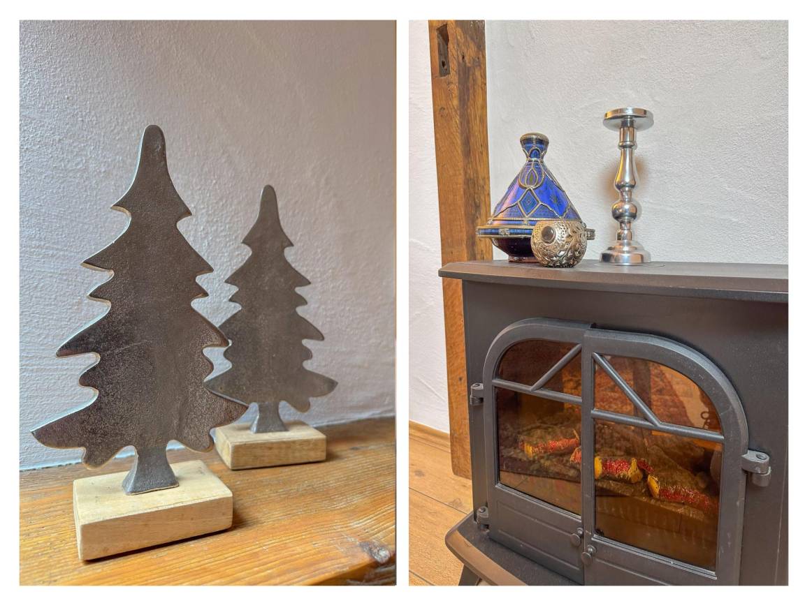 In der 1. Etage(über steile Treppe): Wohnzimmer mit TV, Dekokamin, Sitzecke , Küche mit Esstisch, Wasserkocher, Toaster, Kochherd(4 Kochplatten), Dunstabzugshaube, Kaffeemaschine(Filter), Backofen, Geschirrspüler, Kühlschrank(+ Gefrierfach) , Schlafzimmer mit Doppelbett(140 x 200 cm) , Schlafzimmer mit Doppelbett(180 x 200 cm) , Badezimmer mit Badewanne, Dusche, Waschbecken, Toilette