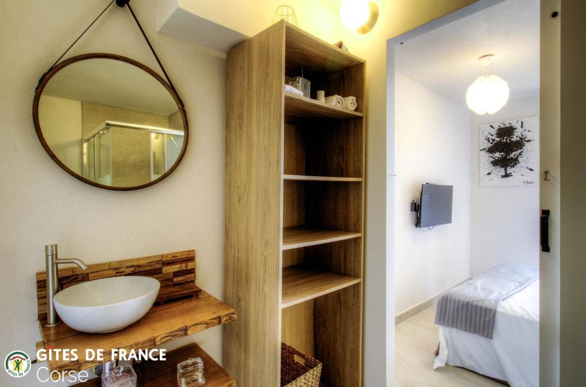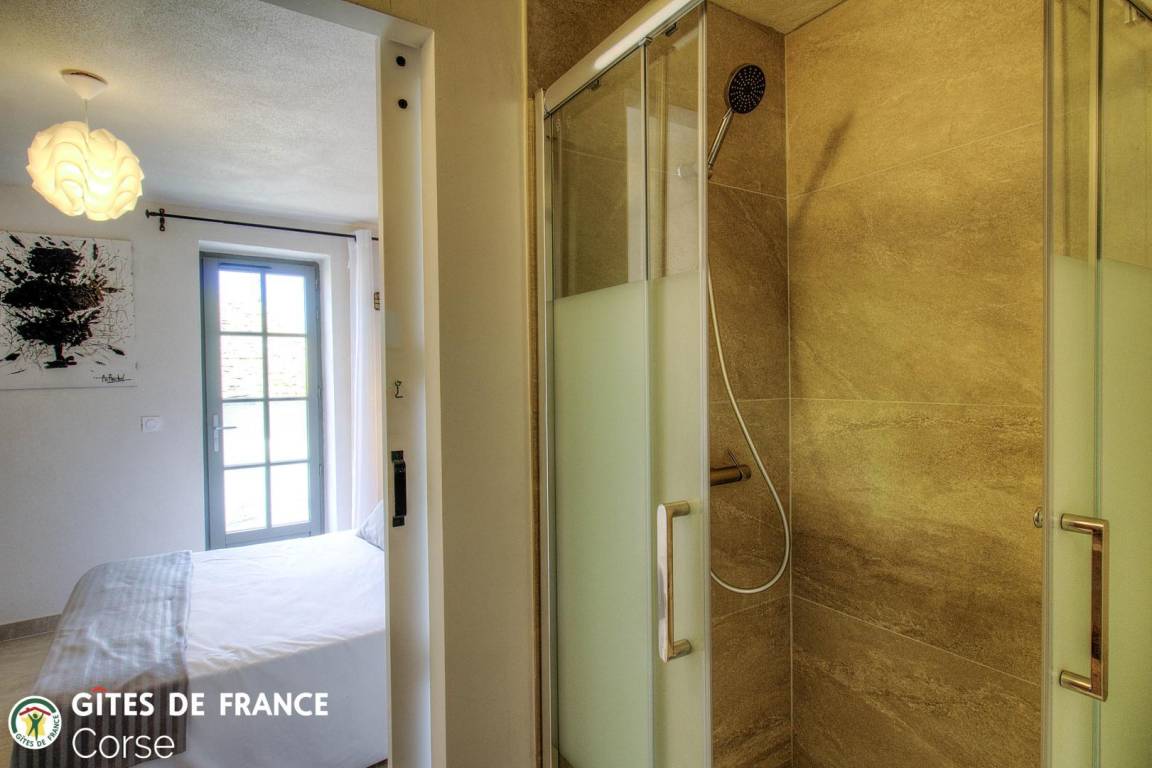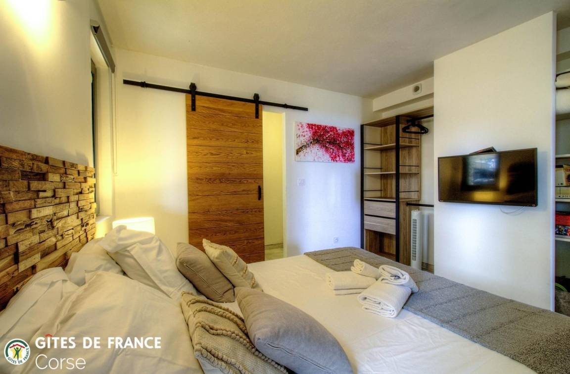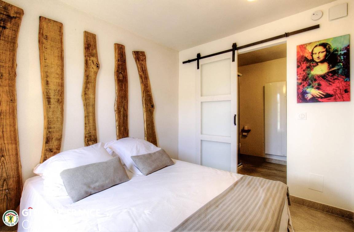 - 1 Schlafzimmer (7,6 m²) mit einem Bett (140 x 190 cm) und eigenem Duschbad/WC mit Flügeltüren