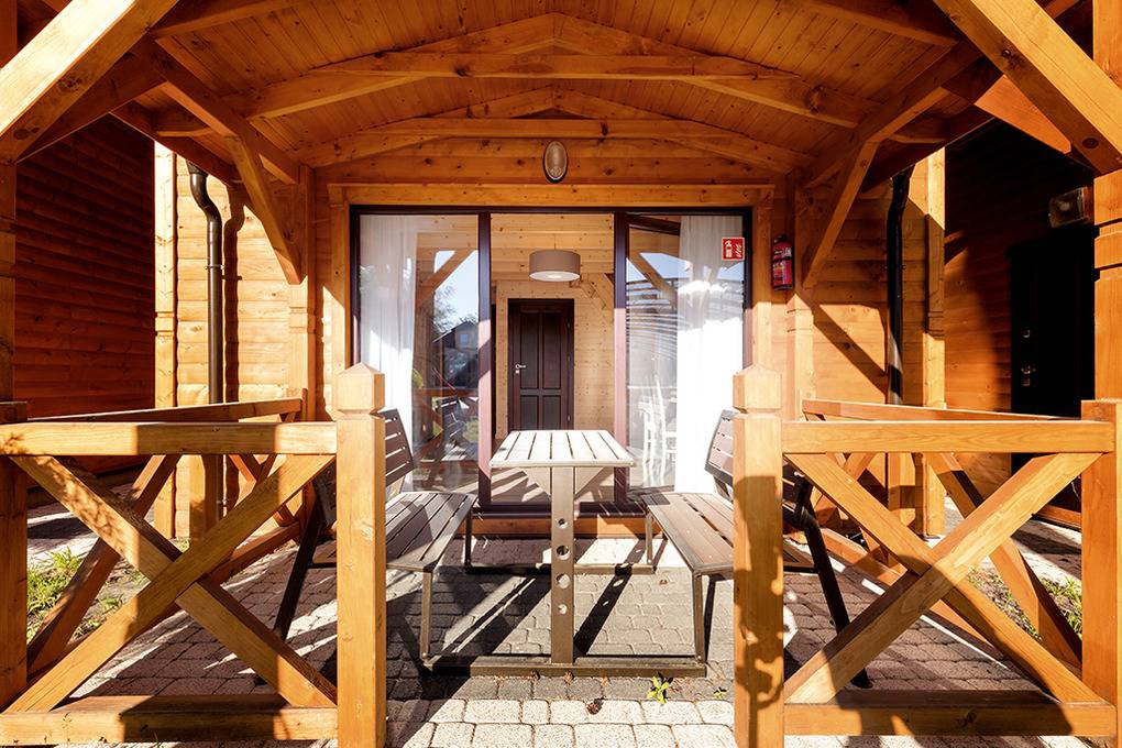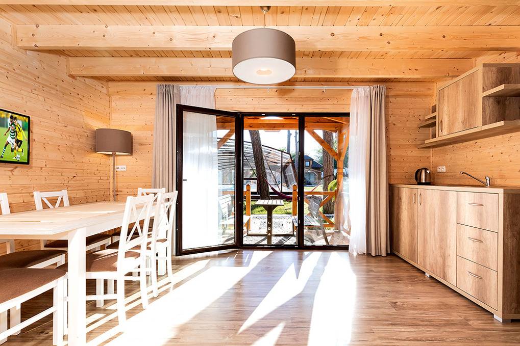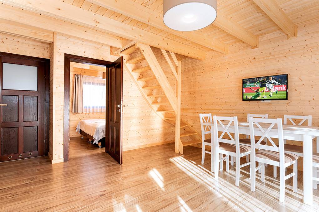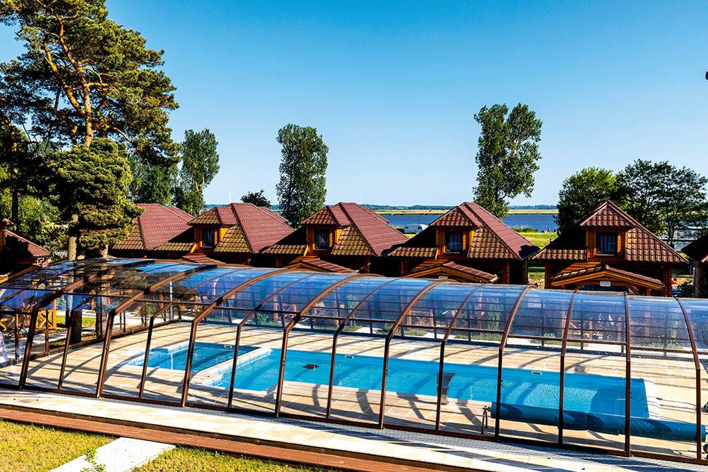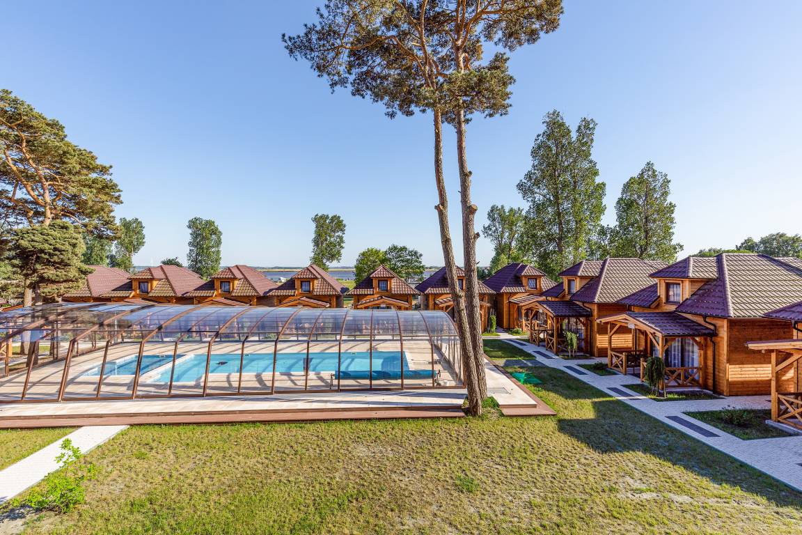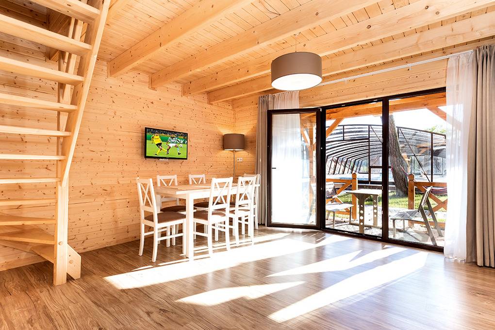 Haus: Kleine Ferienhaussiedlung mit 13 schönen, niveauvollen Holzblockhäusern auf weitläufigem, eingezäunten Grundstück. In der Anlage: Rezeption. Überdachter, beheizter Außenpool (3 x 10 m mit Babybecken, Mai-Sept.). Restaurant, Frühstück, Halbpension, Vollpension auf Wunsch gegen Gebühr (vor Ort buchbar nur Mitte Juni -August). Fahrradverleih (Gebühr). Großer Grillplatz zur gemeinschaftlichen Nutzung. Lagerfeuerstelle. Großer Kinderspielplatz mit Schaukeln, Rutschen, Wippen, Klettergerüst, Sandkasten, Trampolin. Umfangreiche Sportmöglichkeiten: Fußball-, Volleyball-, Basketballfeld. Tischtennis.