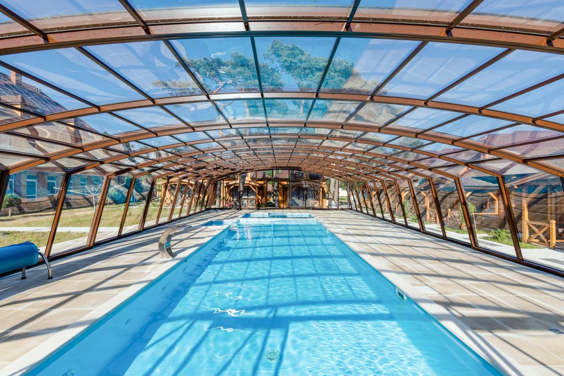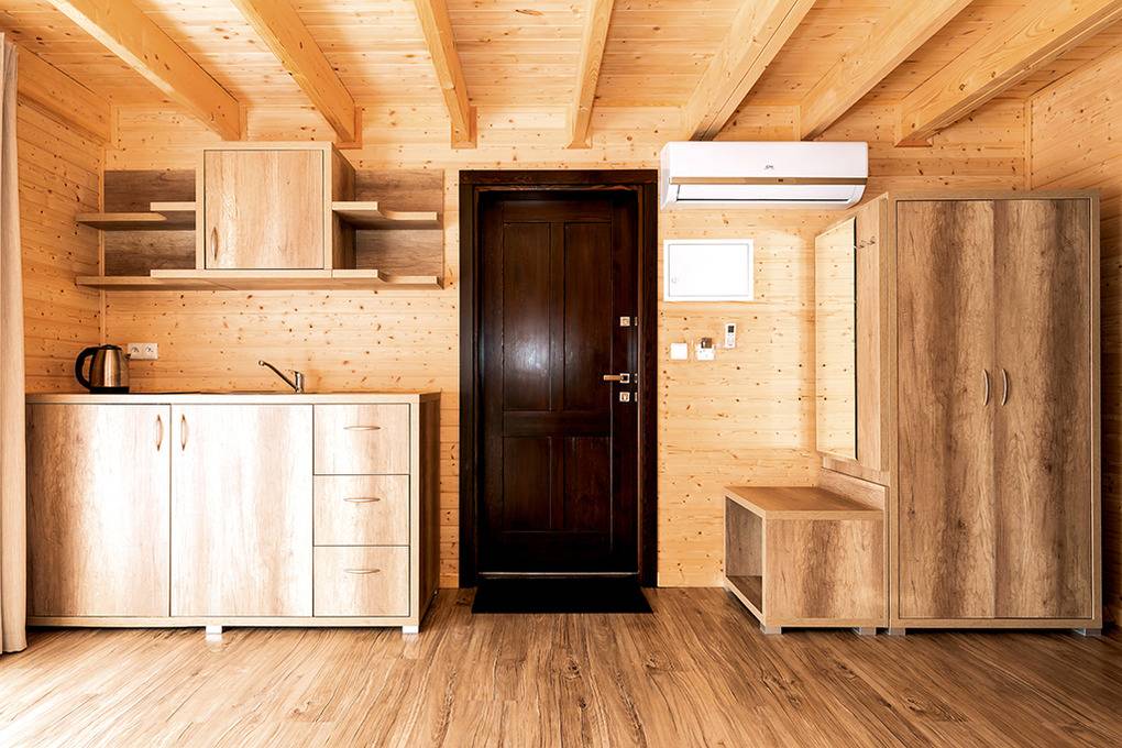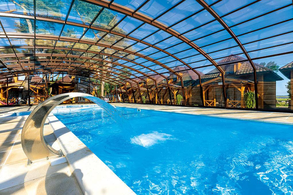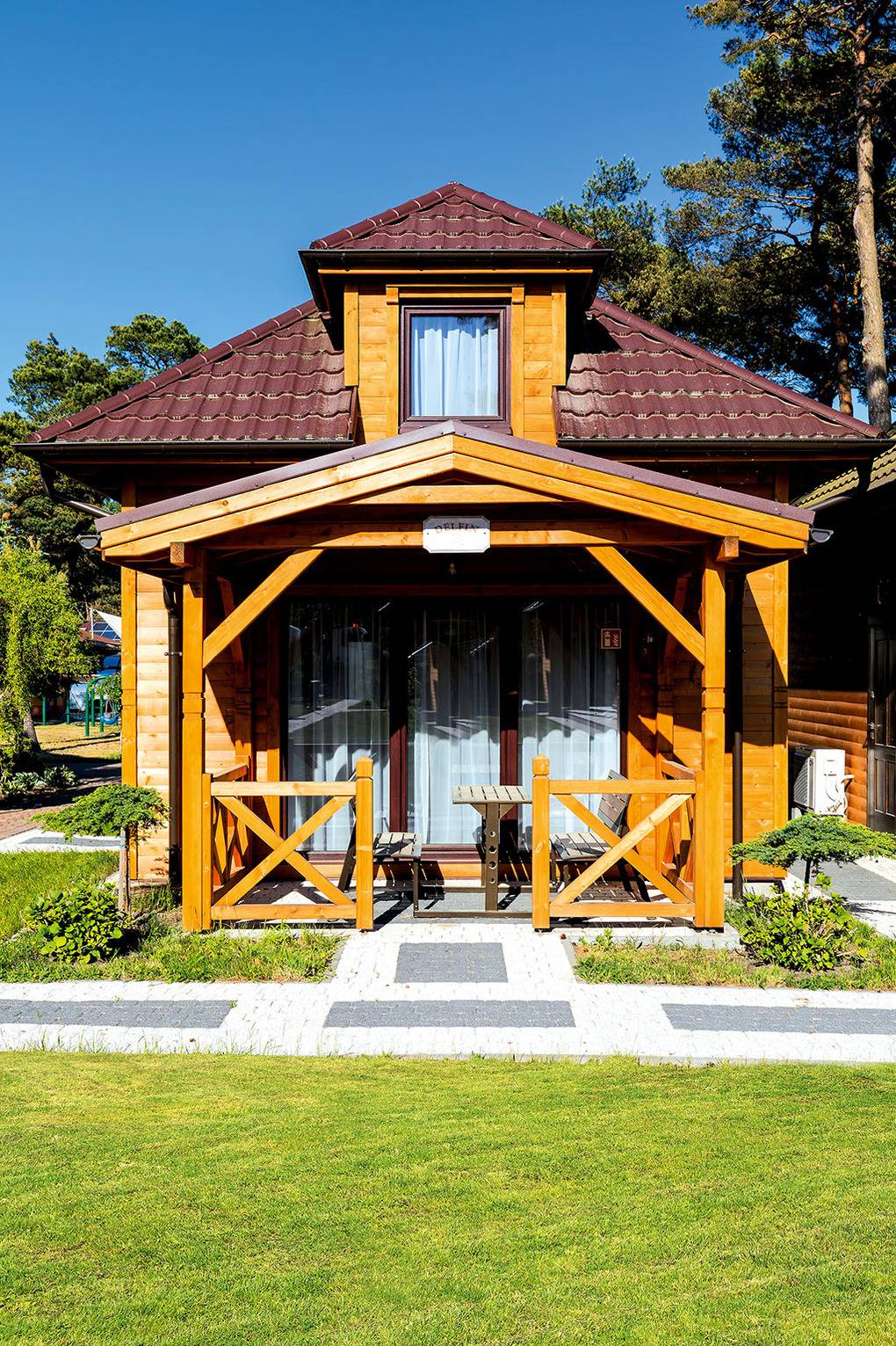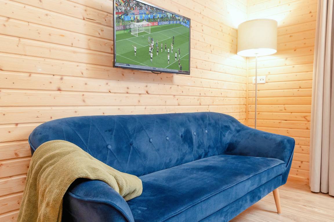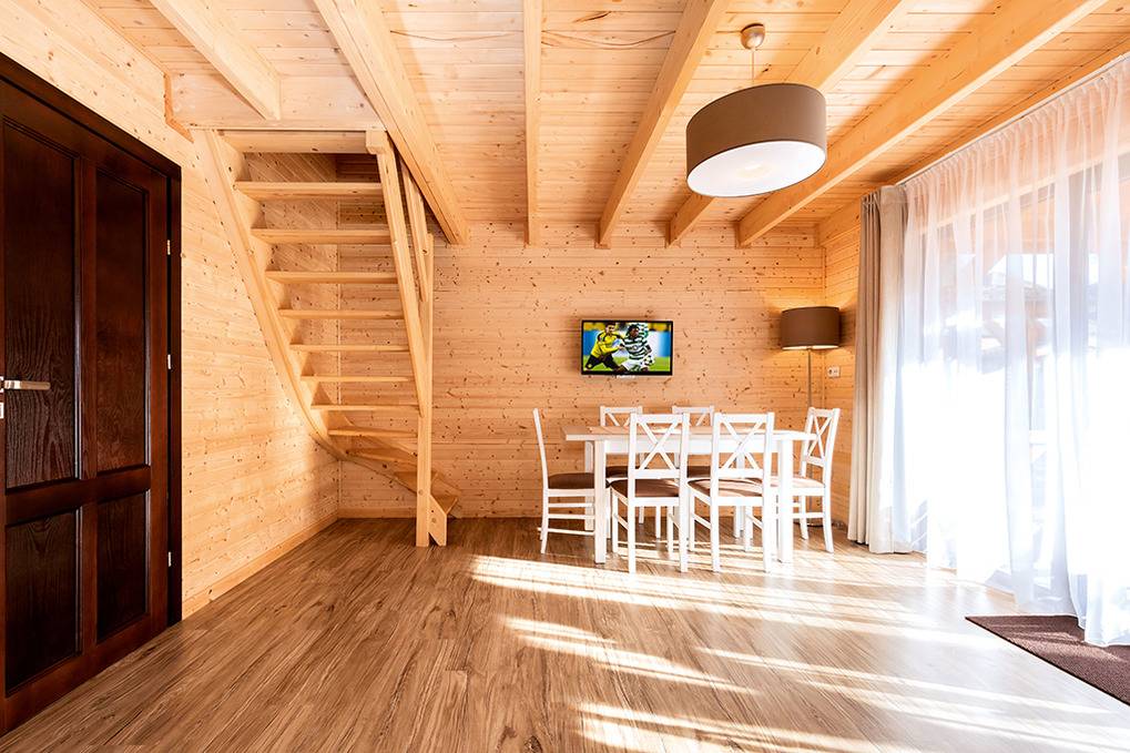 Haus: Kleine Ferienhaussiedlung mit 13 schönen, niveauvollen Holzblockhäusern auf weitläufigem, eingezäunten Grundstück. In der Anlage: Rezeption. Überdachter, beheizter Außenpool (3 x 10 m mit Babybecken, Mai-Sept.). Restaurant, Frühstück, Halbpension, Vollpension auf Wunsch gegen Gebühr (vor Ort buchbar nur Mitte Juni -August). Fahrradverleih (Gebühr). Großer Grillplatz zur gemeinschaftlichen Nutzung. Lagerfeuerstelle. Großer Kinderspielplatz mit Schaukeln, Rutschen, Wippen, Klettergerüst, Sandkasten, Trampolin. Umfangreiche Sportmöglichkeiten: Fußball-, Volleyball-, Basketballfeld. Tischtennis.