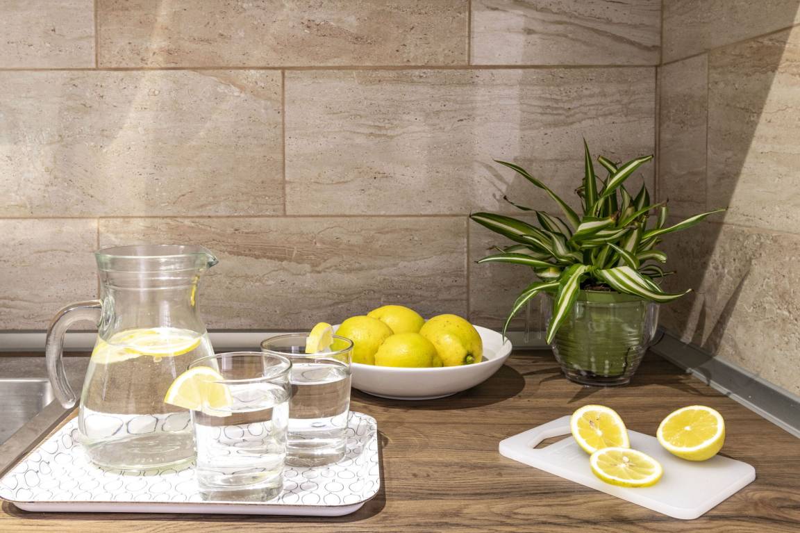 Wohnküche: gut ausgestattete Küche, Esstisch, Kühlschrank, Tiefkühler, Herd, Ofen, Doppel-Schlafsofa, WiFi Internet, Klimaanlage, Satelliten-TV, Ausgang auf den Patio.