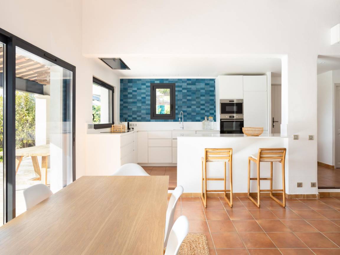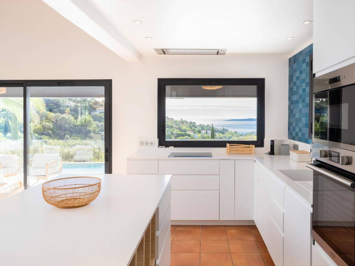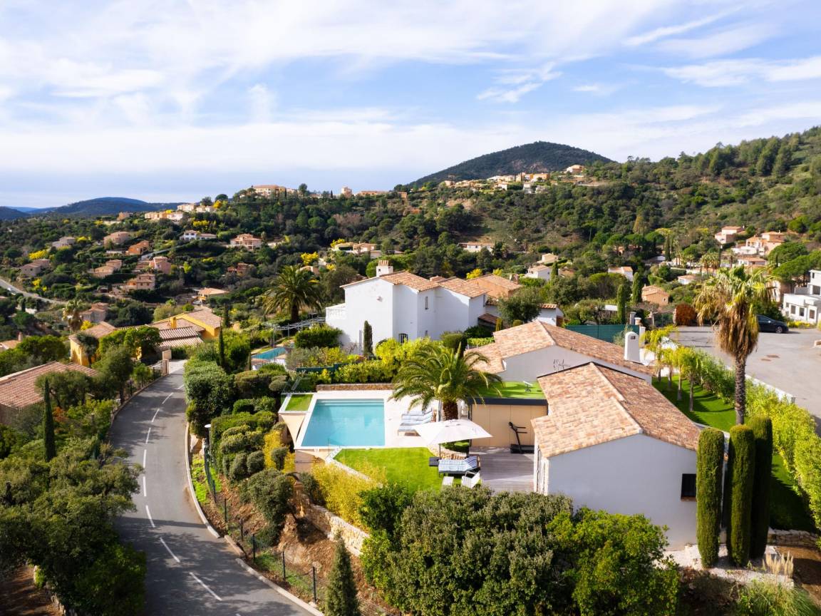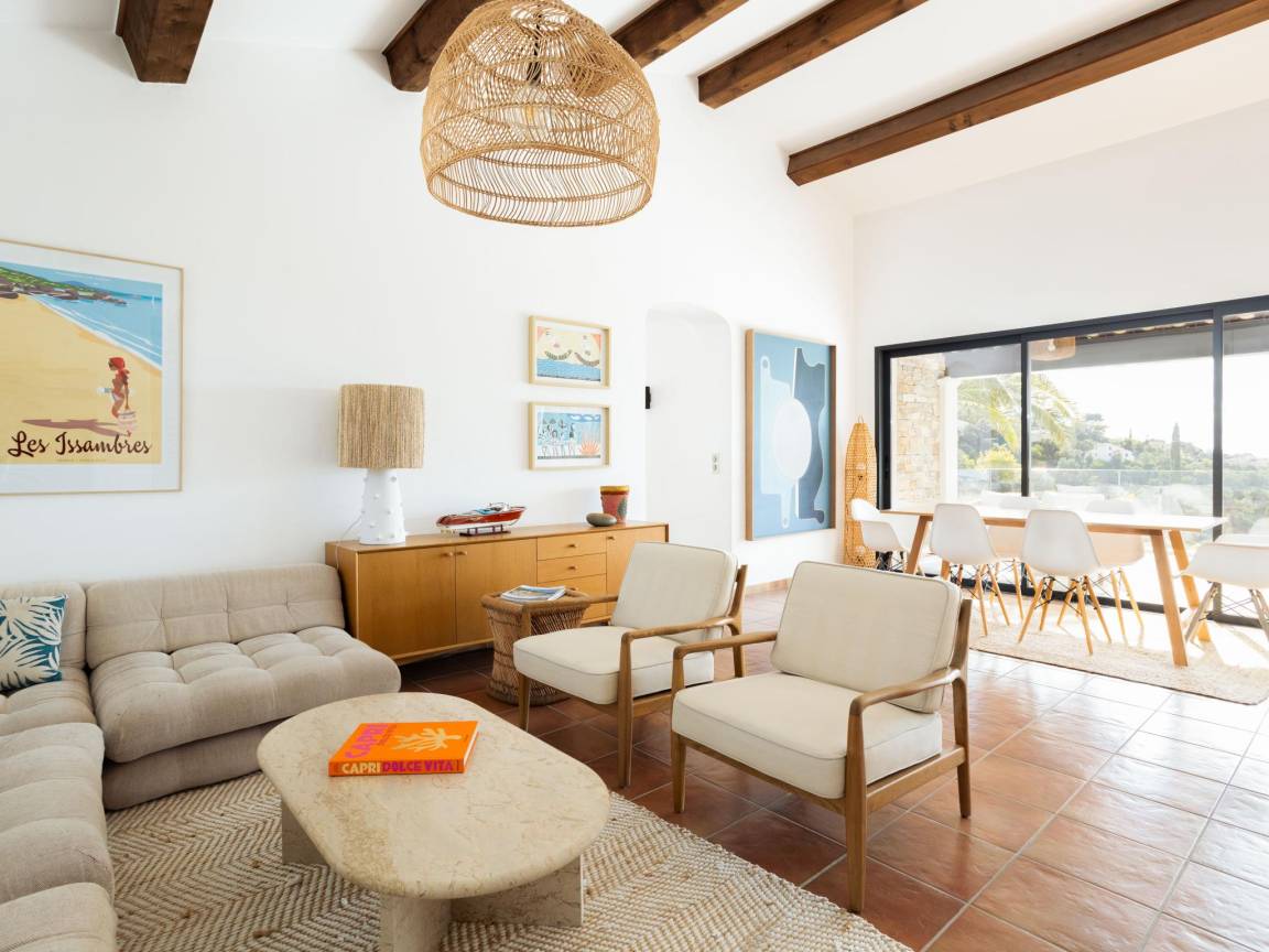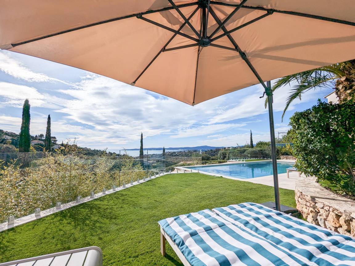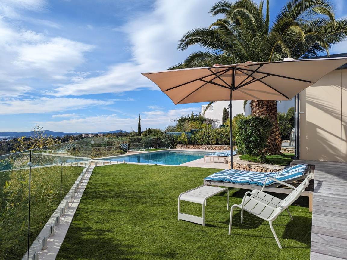 Hausbeschreibung : Schöne Villa 10 Minuten vom Strand entfernt, mit stilvollem Interieur und sehr schönem Meerblick. Alles ist ebenerdig und vom Wohnzimmer aus gehen Sie direkt auf die große, teilweise überdachte Terrasse. Genießen Sie ein Getränk im komfortablen Lounge-Set oder faulenzen Sie am Rande des (beheizten) Pools. Im Sommer ist es dank der Klimaanlage angenehm kühl im Haus. Außerhalb des Sommers können Kurzaufenthalte (min. 4 Nächte) gebucht werden. Herrlich im Frühling oder Herbst an die Côte d'Azur !