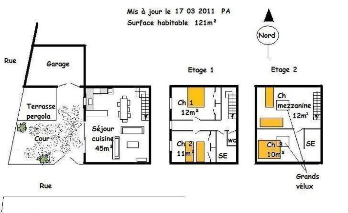Ferienhaus bestehend aus: Küche mit Blick auf die Terrasse, im Obergeschoss 2 Ch mit 1 Bett 140 und 2 Betten 90, SE, WC. Auf der 2. Etage 1 Ch geschlossen mit 1 Bett 140 und SE und Ch 1 mit 2 Betten 90 geöffnet. Zusätzliche elektrische Heizung.
