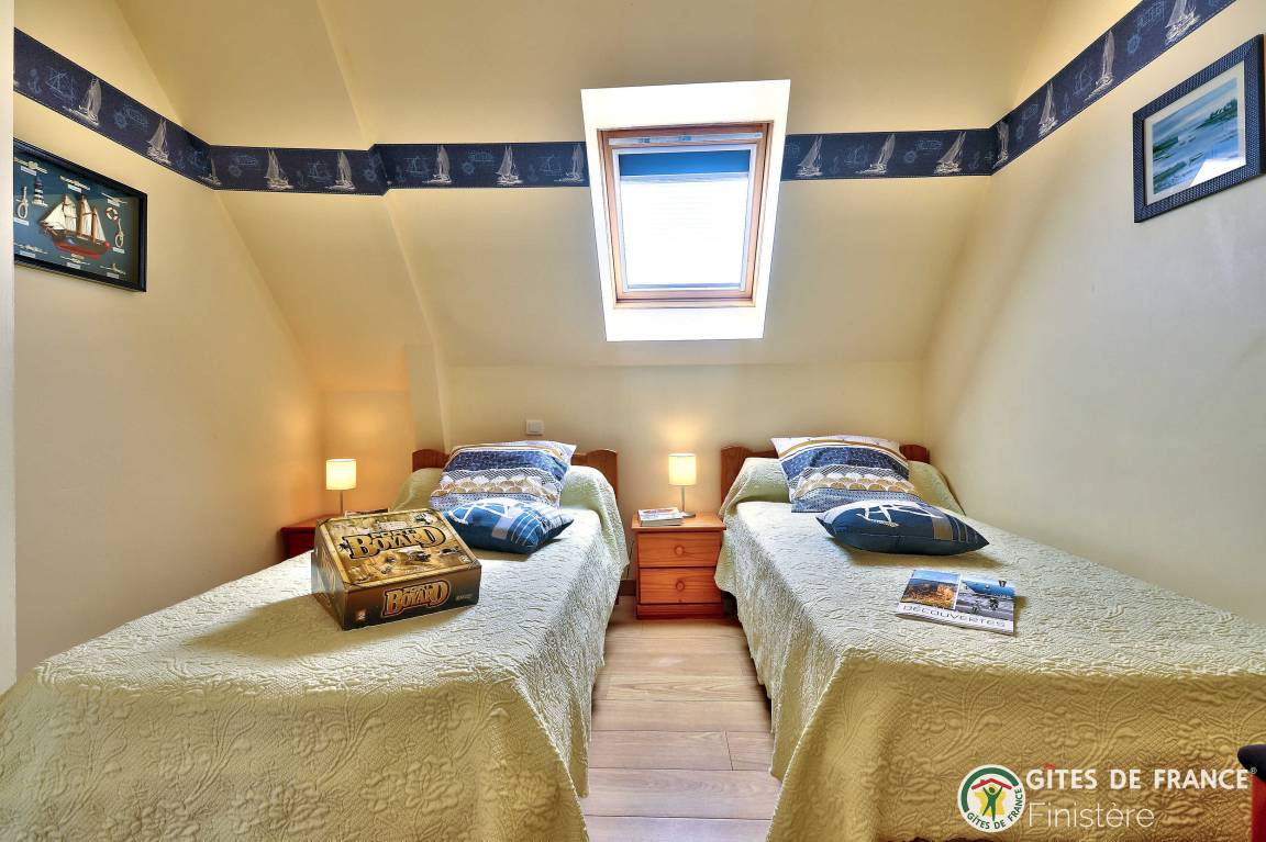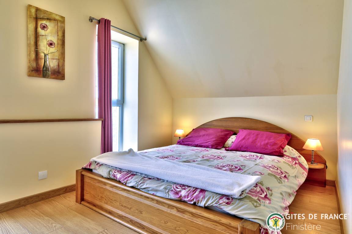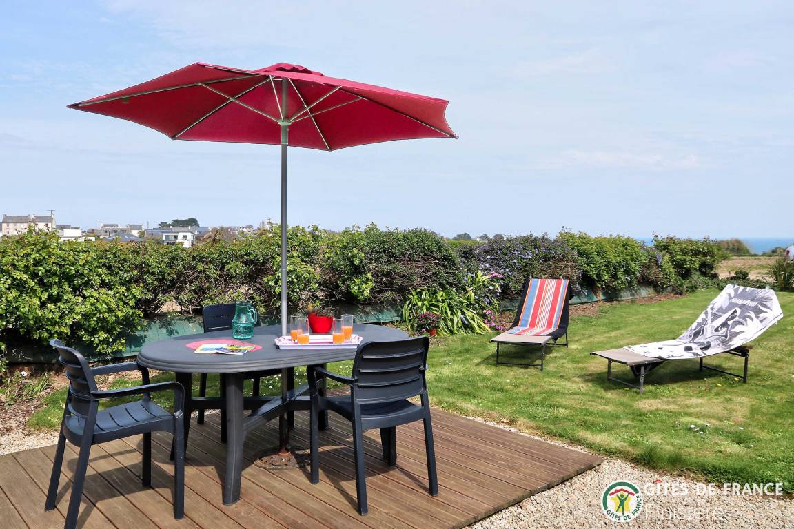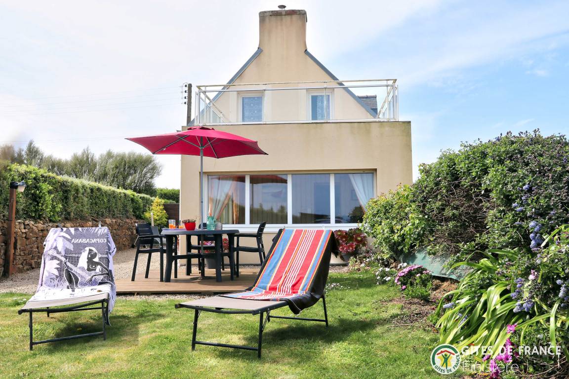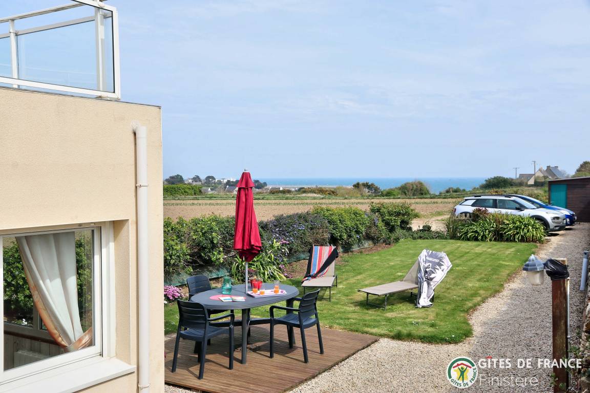 Dieses Haus mit Meerblick grenzt an einen weiteren Gîte an. EG: Eßzimmer mit Kochecke und Holzofen, Sitzecke, Dusche, sep. WC. 1.Stock: Doppelzimmer (Bettbreite: 1,60x2m) und Terrasse mit Meerblick, Zweibettzimmer (0,90x2m), Bad/WC. E-Heizung. Eigener Garten, Gartenmöbel, Grill. Wi-Fi.