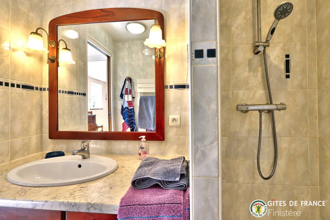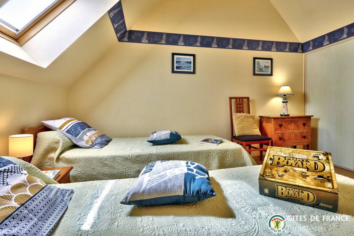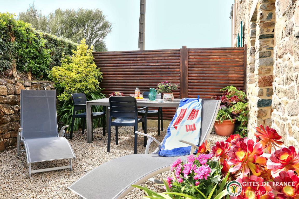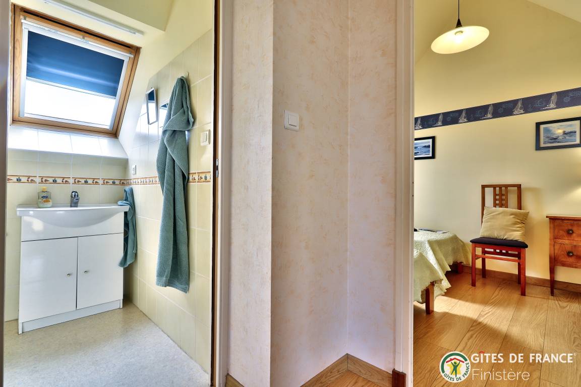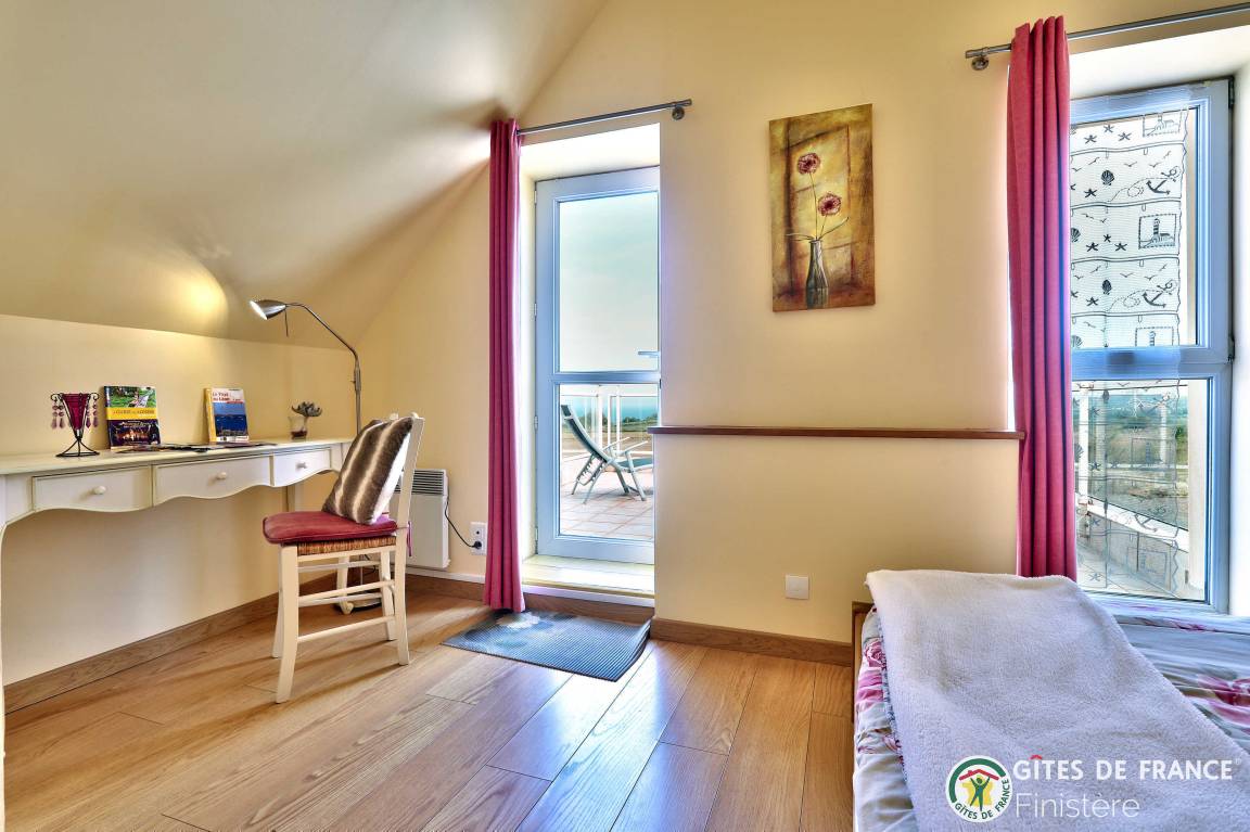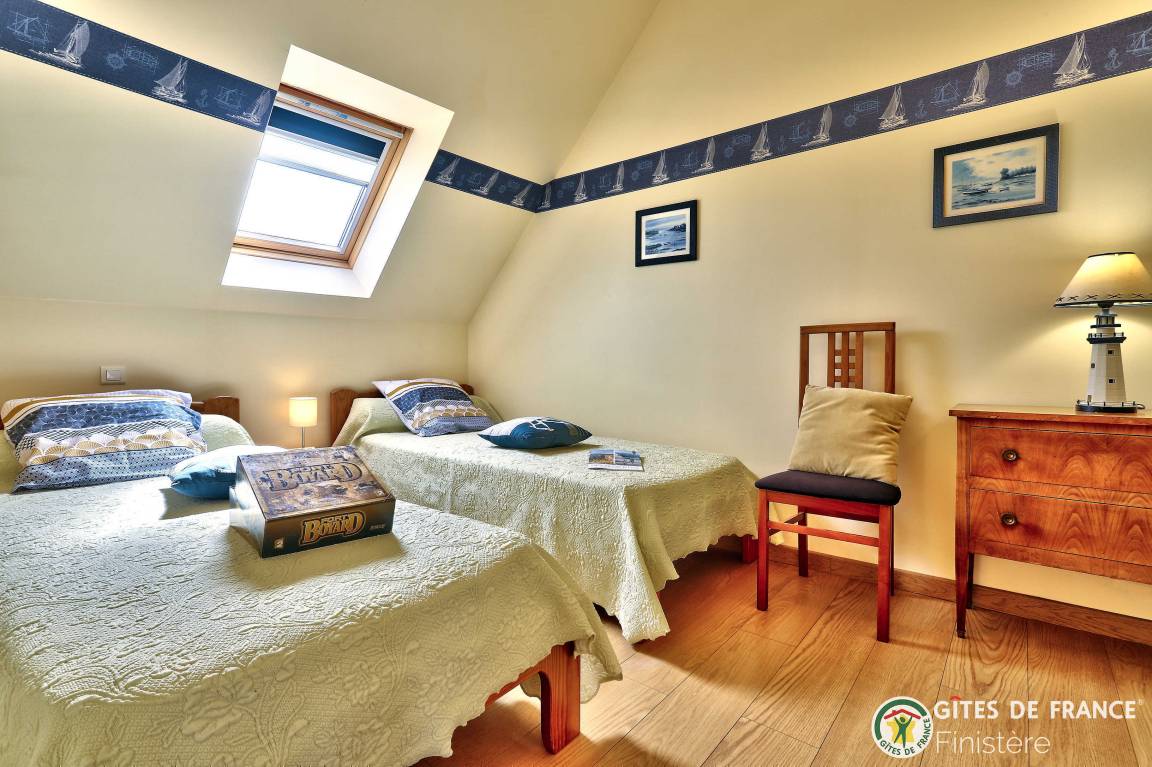 Dieses Haus mit Meerblick grenzt an einen weiteren Gîte an. EG: Eßzimmer mit Kochecke und Holzofen, Sitzecke, Dusche, sep. WC. 1.Stock: Doppelzimmer (Bettbreite: 1,60x2m) und Terrasse mit Meerblick, Zweibettzimmer (0,90x2m), Bad/WC. E-Heizung. Eigener Garten, Gartenmöbel, Grill. Wi-Fi.