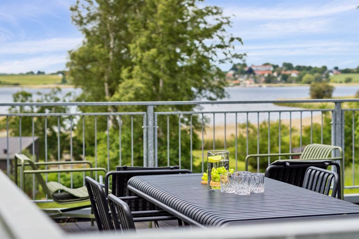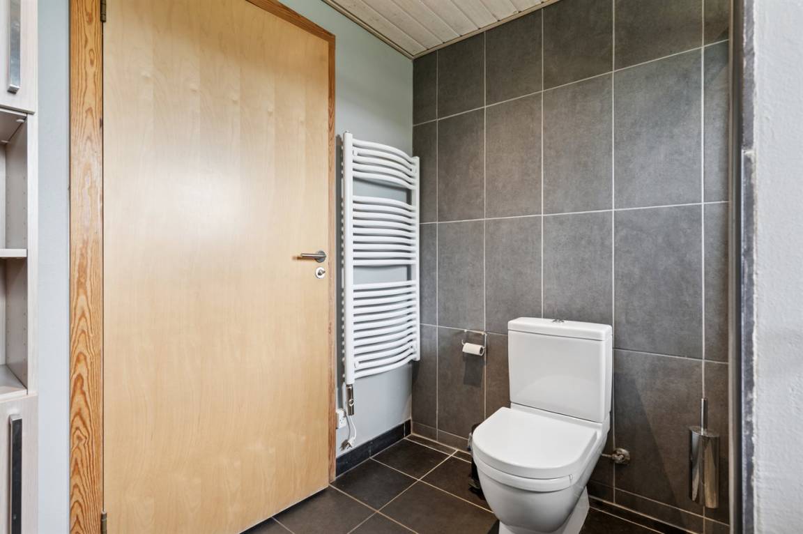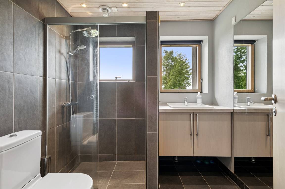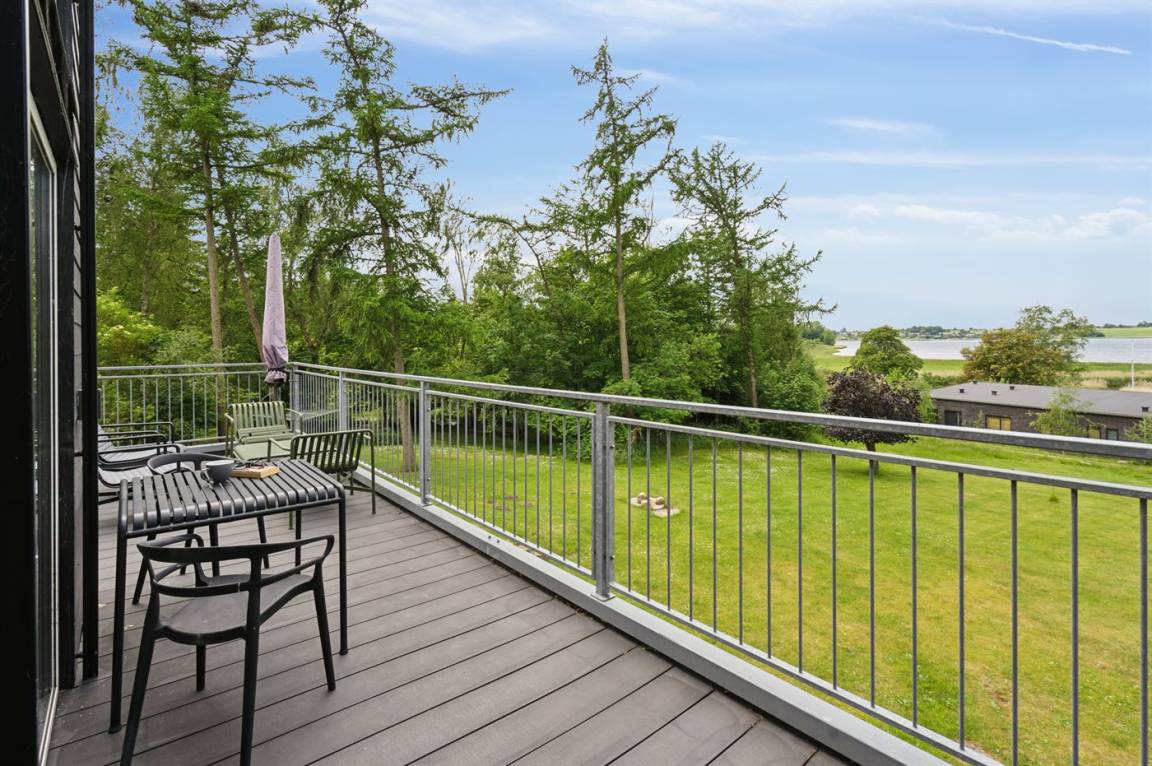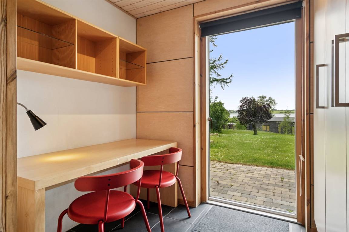 Zum Haus gehören 3 Terrassen, 1 große (50 m²) mit Aussicht auf den Fjord. Beheizbare Klinkerböden im ganzen Haus sowie energiesparende Wärmepumpe.