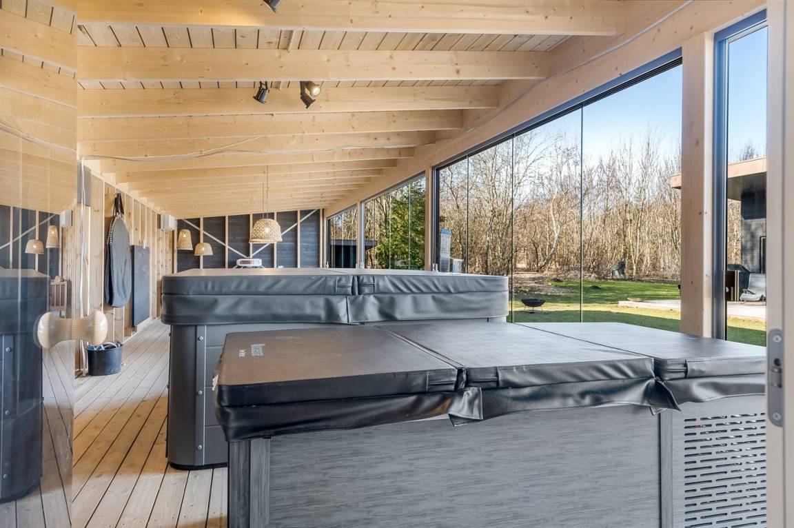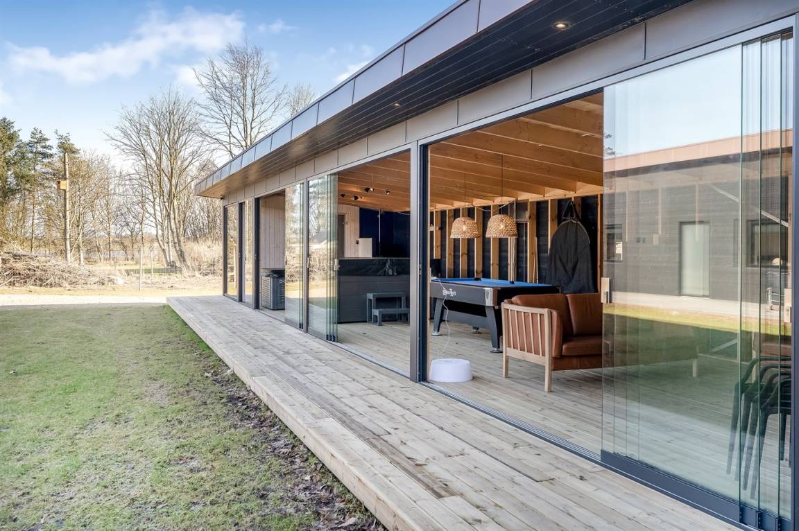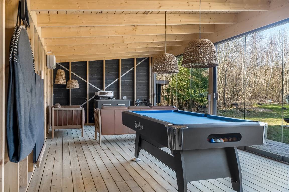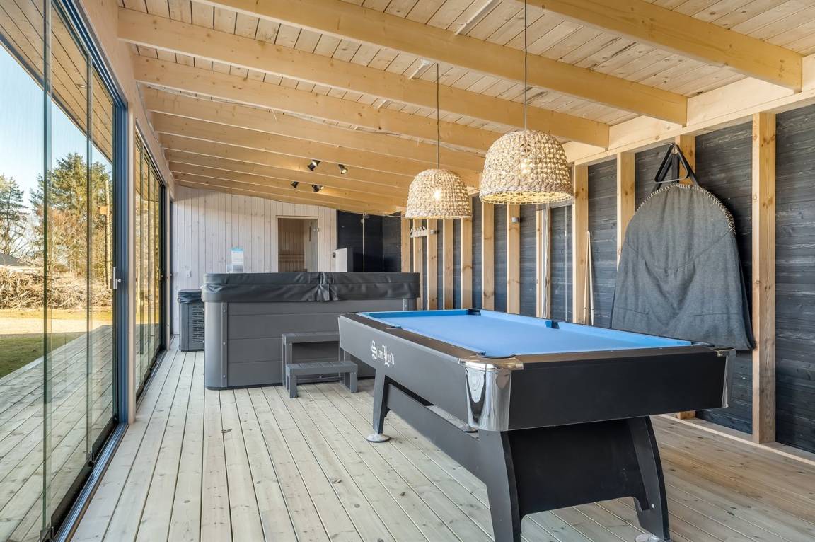 Es liegt auf einem großen Grundstück mit einem schönen Garten vor und hinter dem Haus, großen überdachten Terrassen und – am wichtigsten – direkt gegenüber von dem Ferienhaus findest du Unterhaltung für die ganze Familie mit Sauna, Kaltwasserbecken, Spa, Billard, Tischtennis und einer kleineren überdachten Küche mit Grill und Pizzaofen.