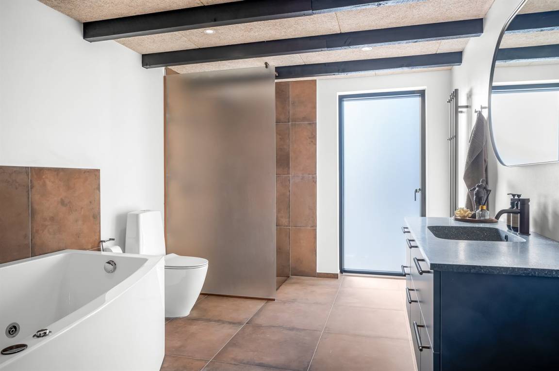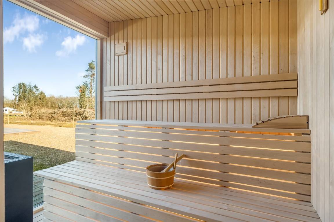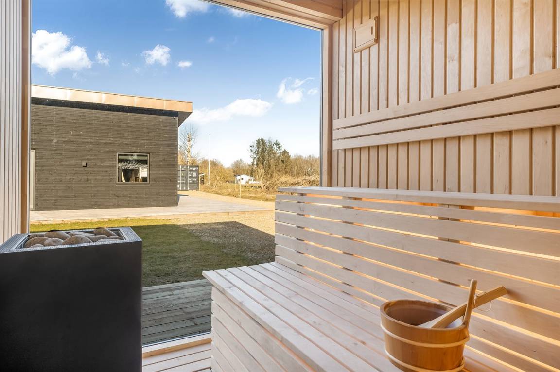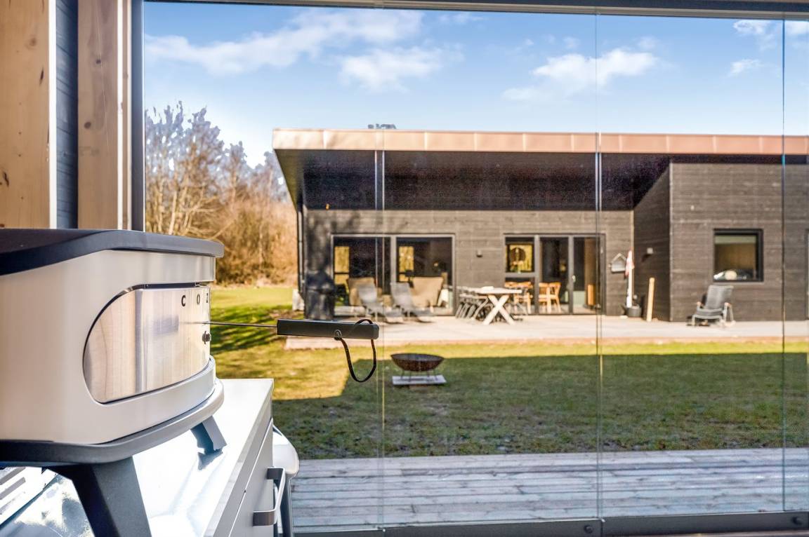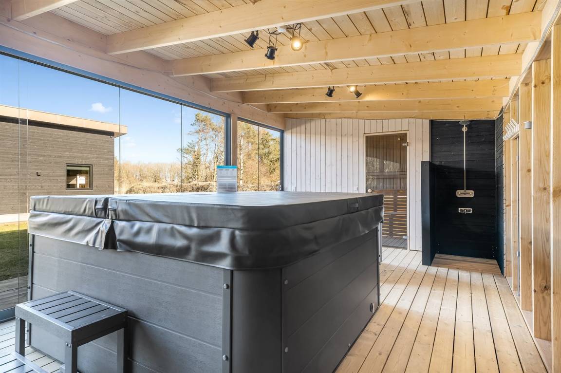 Es liegt auf einem großen Grundstück mit einem schönen Garten vor und hinter dem Haus, großen überdachten Terrassen und – am wichtigsten – direkt gegenüber von dem Ferienhaus findest du Unterhaltung für die ganze Familie mit Sauna, Kaltwasserbecken, Spa, Billard, Tischtennis und einer kleineren überdachten Küche mit Grill und Pizzaofen.