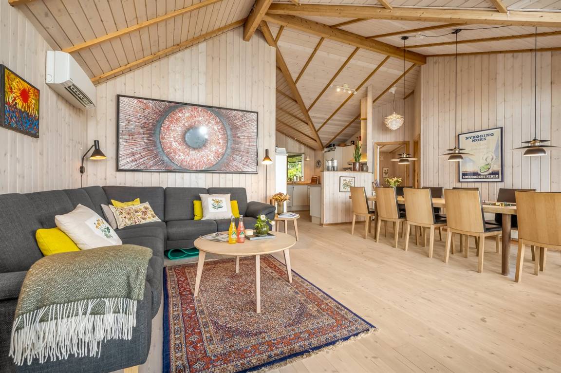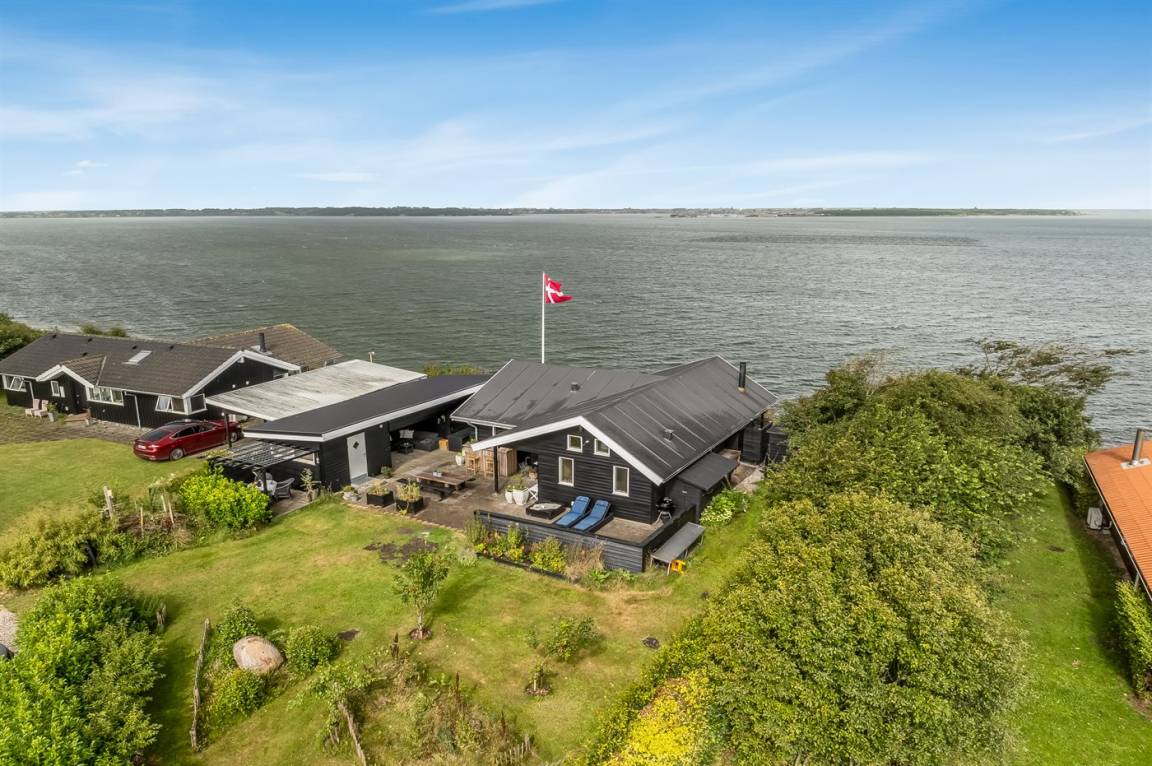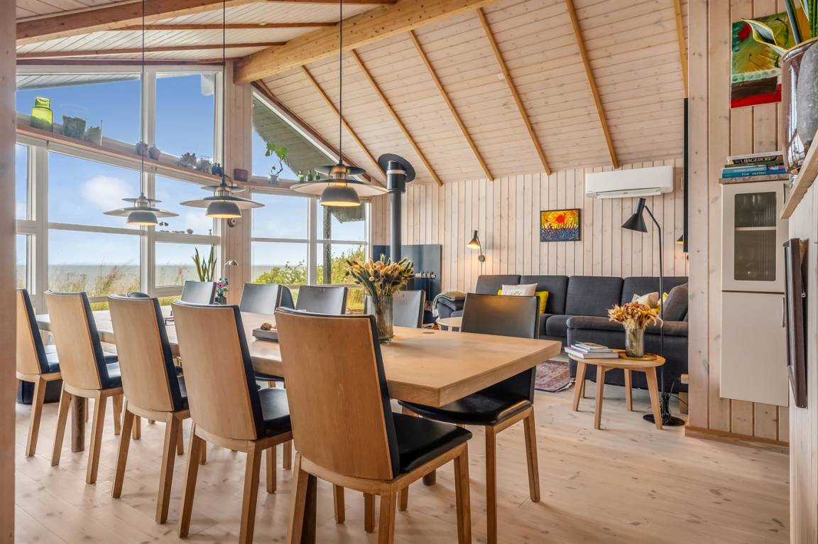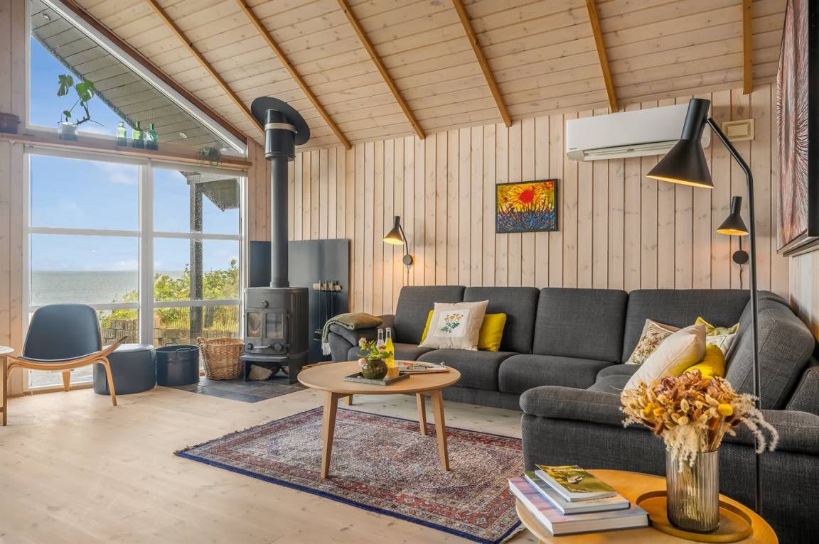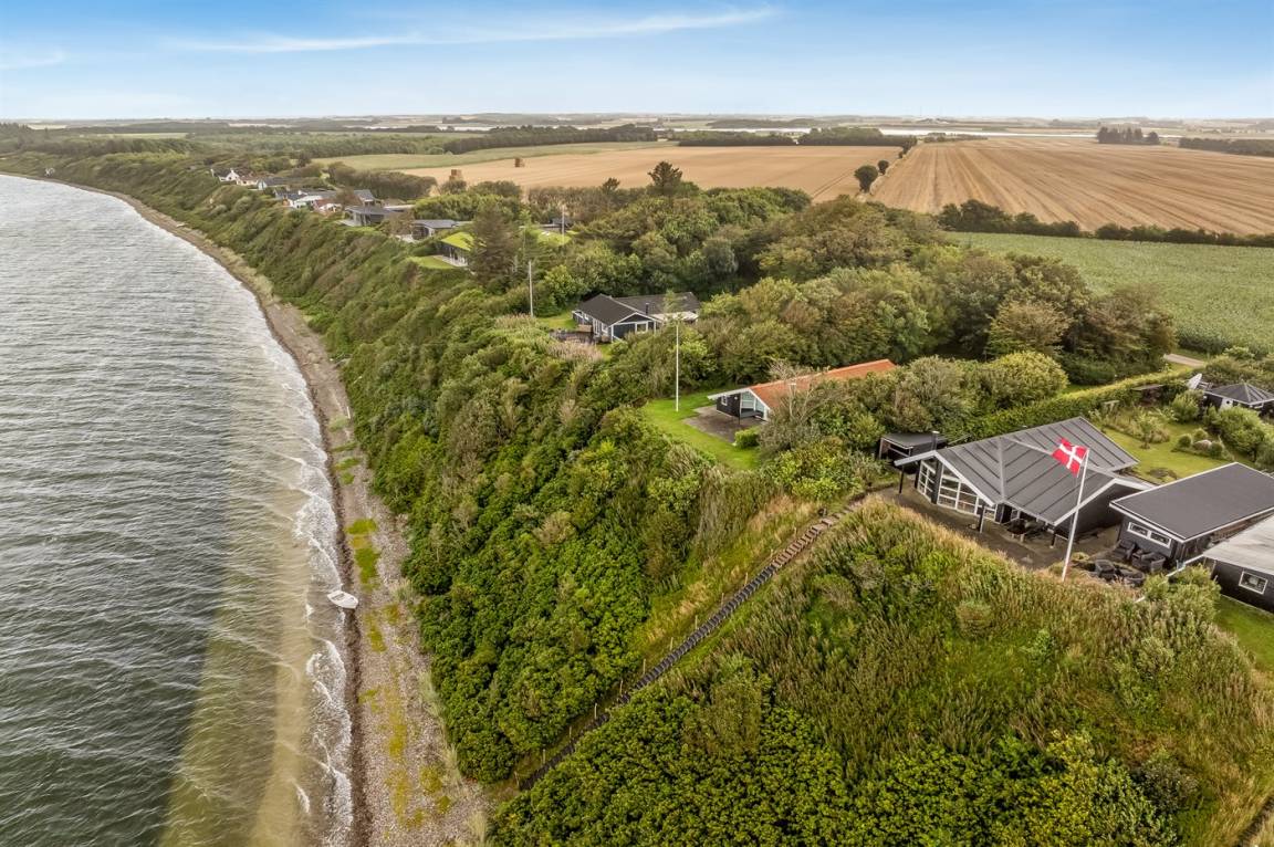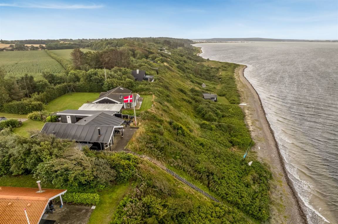 An einem Hang im Feriengebiet Grynderup Strand findest du dieses einzigartige und außergewöhnliche Ferienhaus – mit einem fantastischen Panoramablick über den Limfjord mit Nykøbing Mors im Hintergrund und Ausblick auf die Muschelbänke im Fjord.