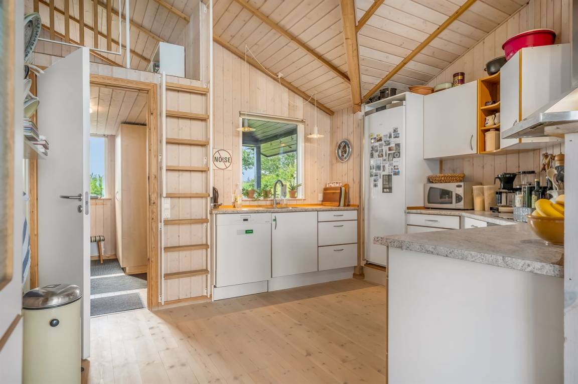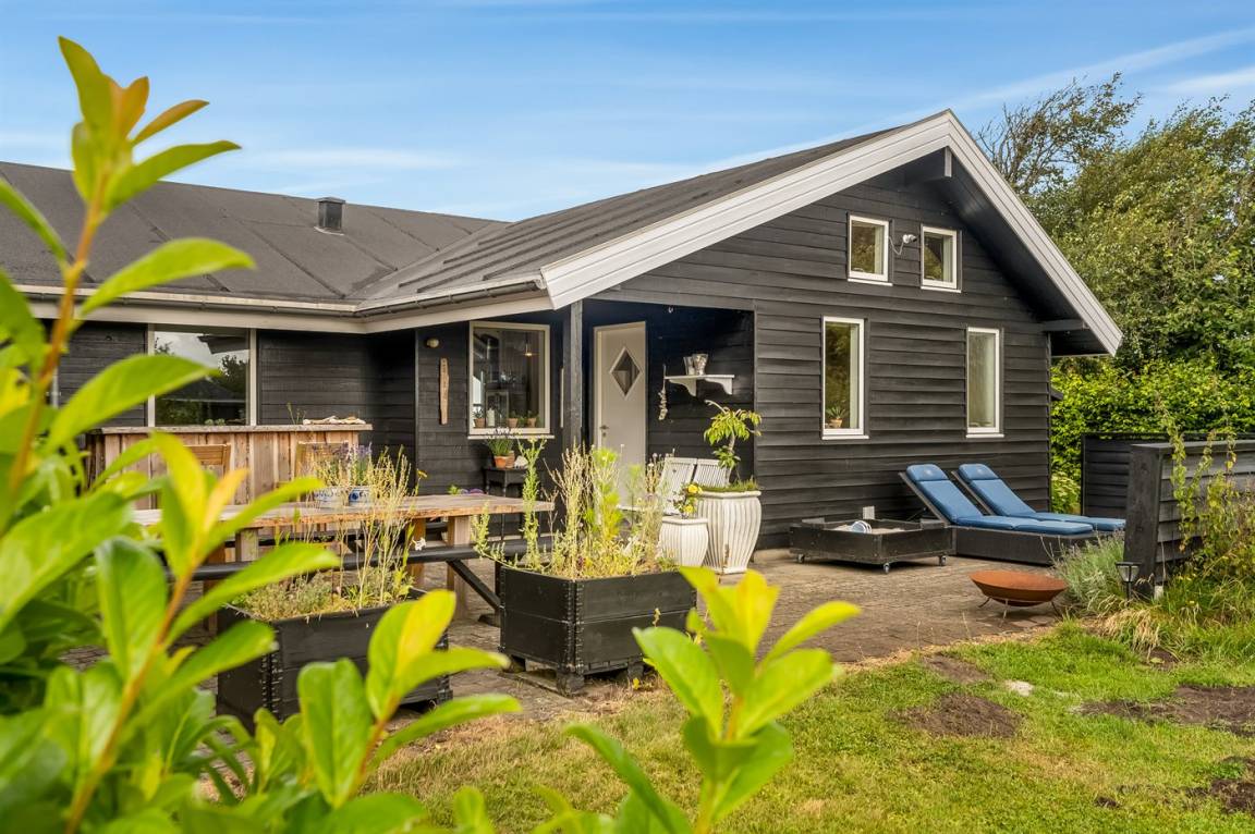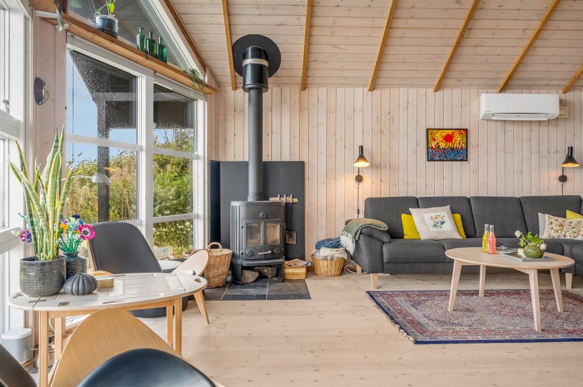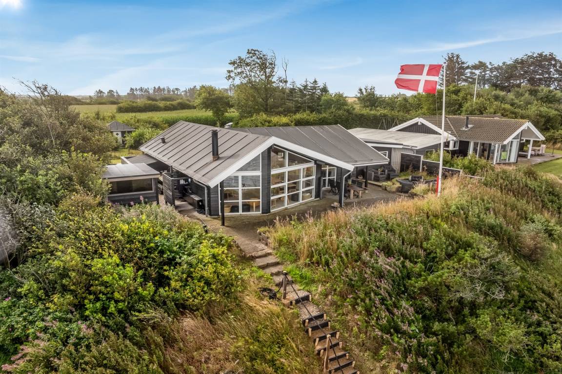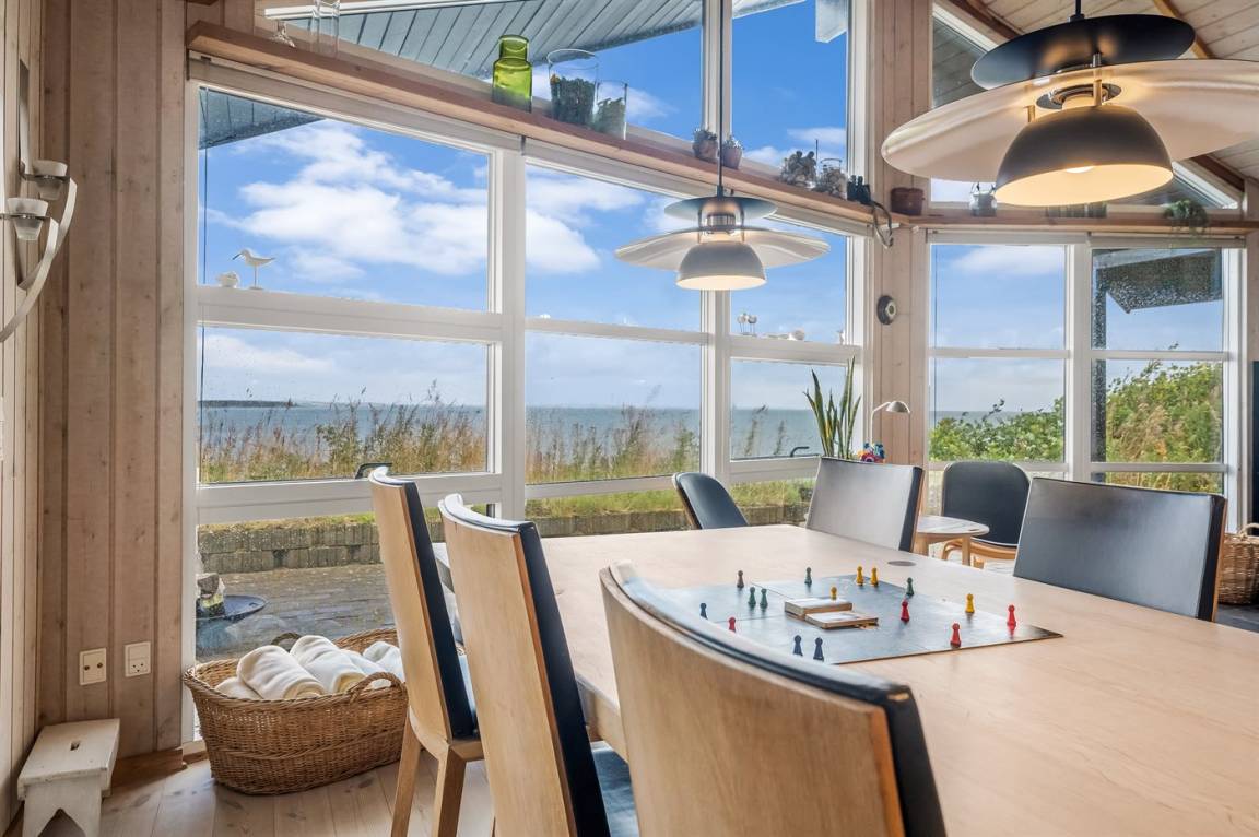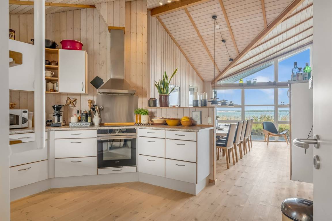 An einem Hang im Feriengebiet Grynderup Strand findest du dieses einzigartige und außergewöhnliche Ferienhaus – mit einem fantastischen Panoramablick über den Limfjord mit Nykøbing Mors im Hintergrund und Ausblick auf die Muschelbänke im Fjord.