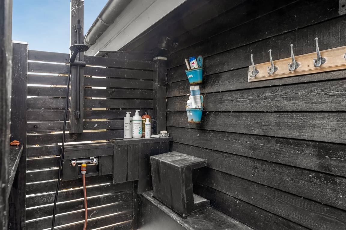 DraußenDie Ferienunterkunft liegt auf einem 1482 m² großen Die Entfernung zum Fjord beträgt 20 m. Die nächste Einkaufsmöglichkeit liegt 6000 m entfernt. In einem Abstand von 10000 m gibt es einen Golfplatz. Es steht ein offenes Terrassenareal zur Verfügung. Außerdem gibt es überdachte Terrasse. Die Entfernung zu einem Spielplatz beträgt 17000 m. Außensauna. Außendusche. Es steht ein Grill zur Verfügung. Parkplatz auf dem Grundstück.