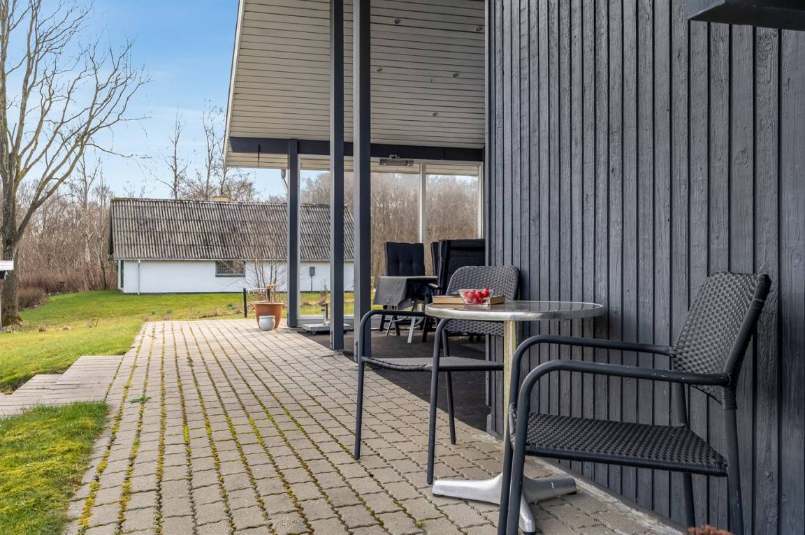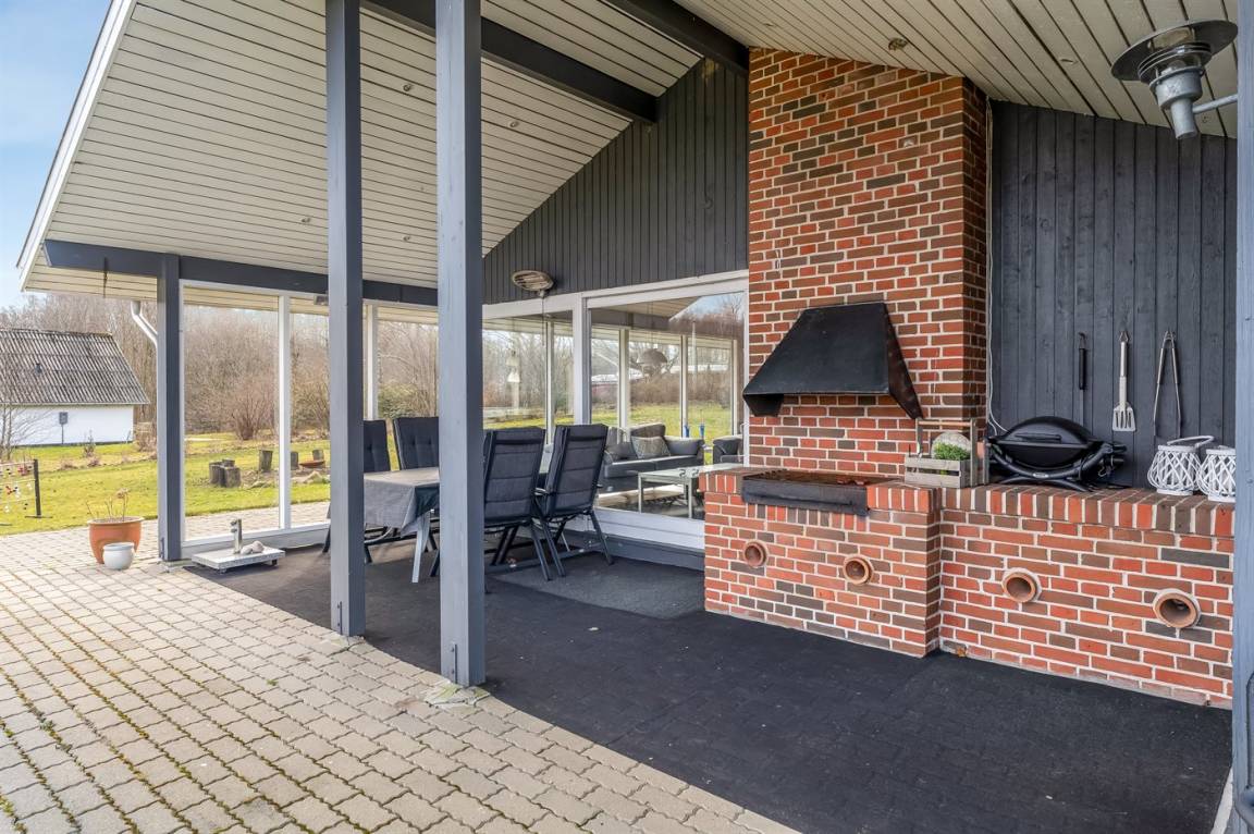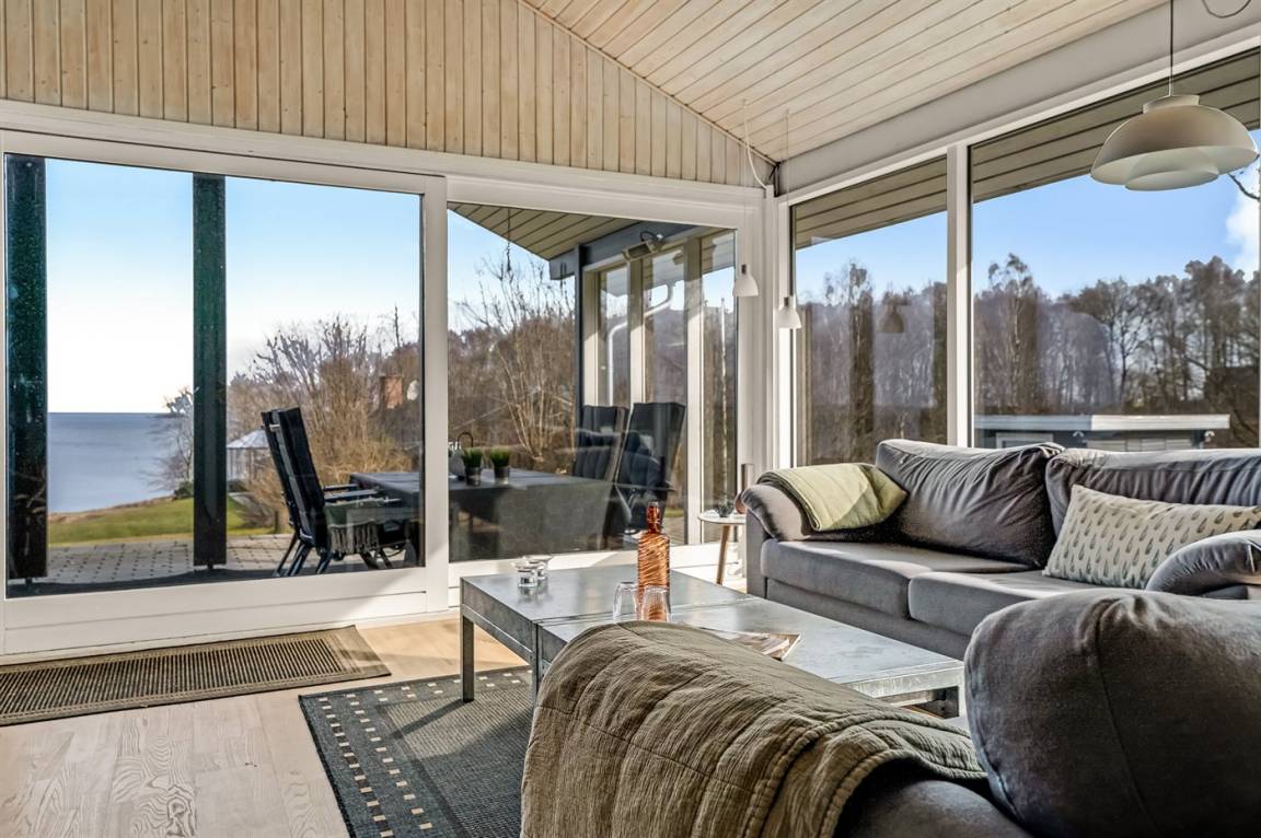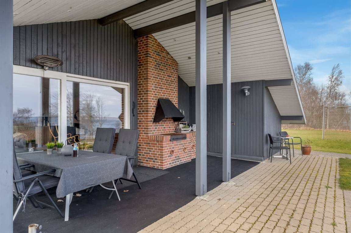 Von der schönen überdachten Terrasse des Hauses hast du einen wirklich schönen Ausblick auf den Fjord, und am Horizont kannst du die Sundsøre-Fähre bei ihren Überfahrten beobachten.