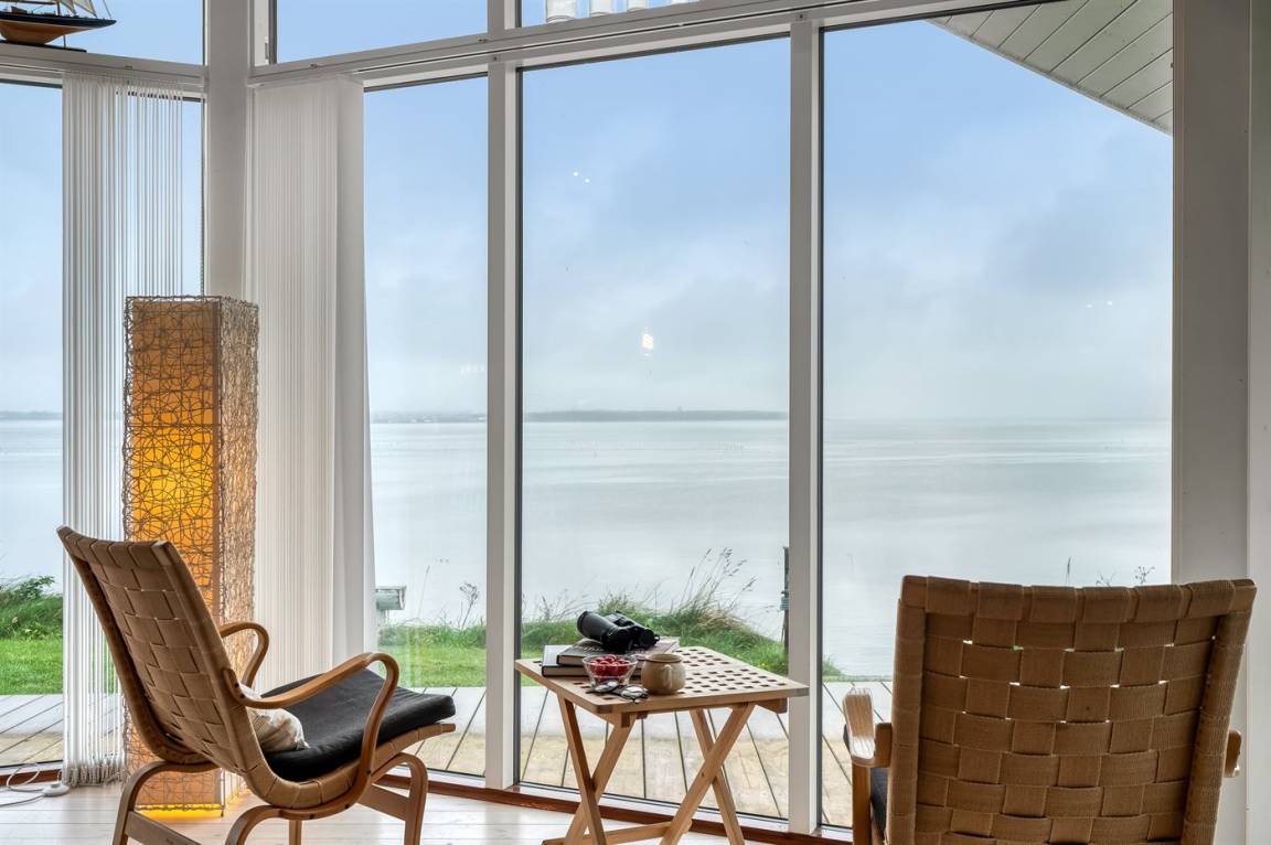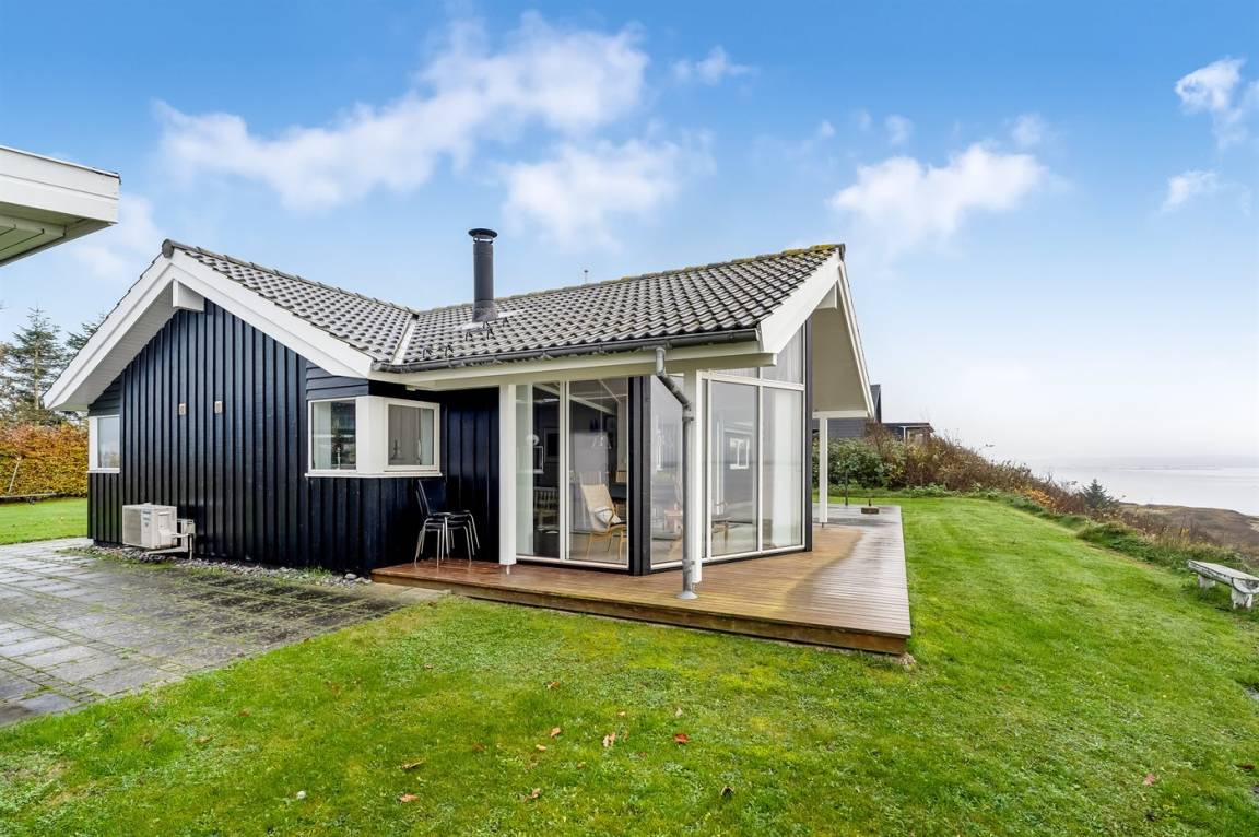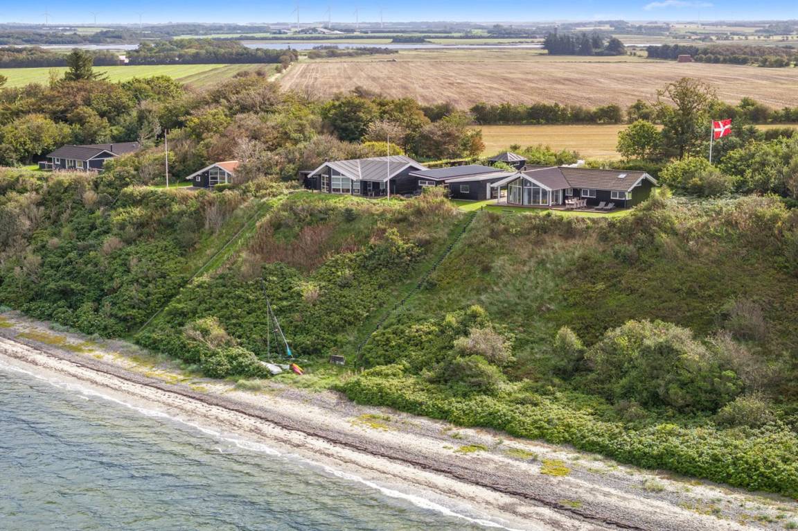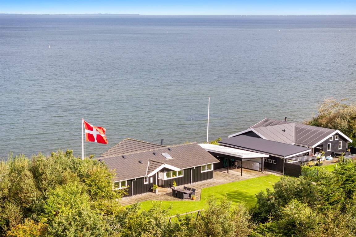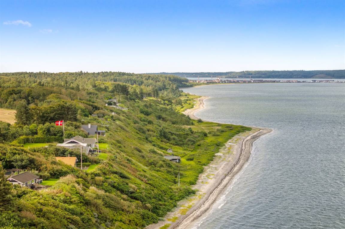 Hoch gelegen und mit wunderschönem Panoramablick über den Limfjord findest du dieses Ferienhaus, das an einem Hang liegt, von dem eine Treppe direkt zum Wasser führt.