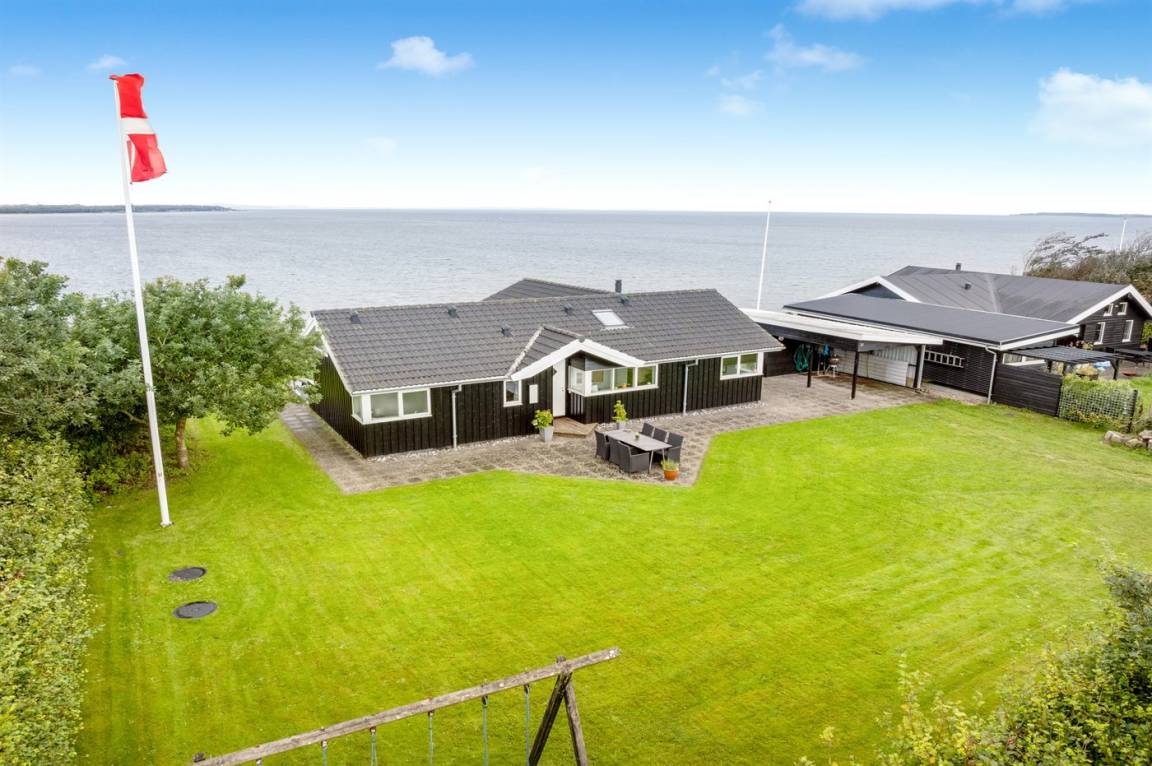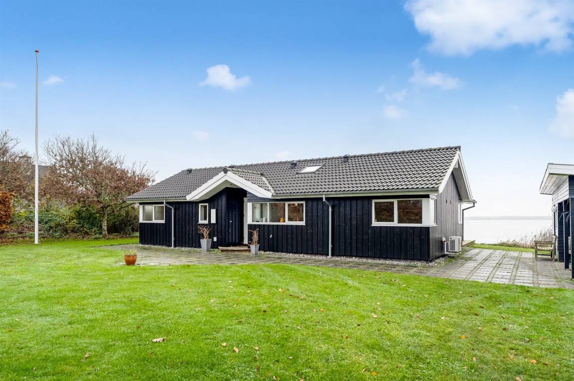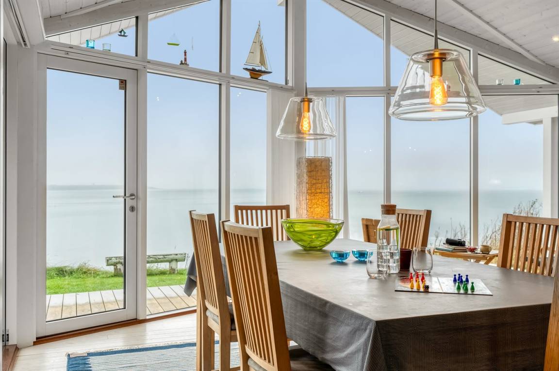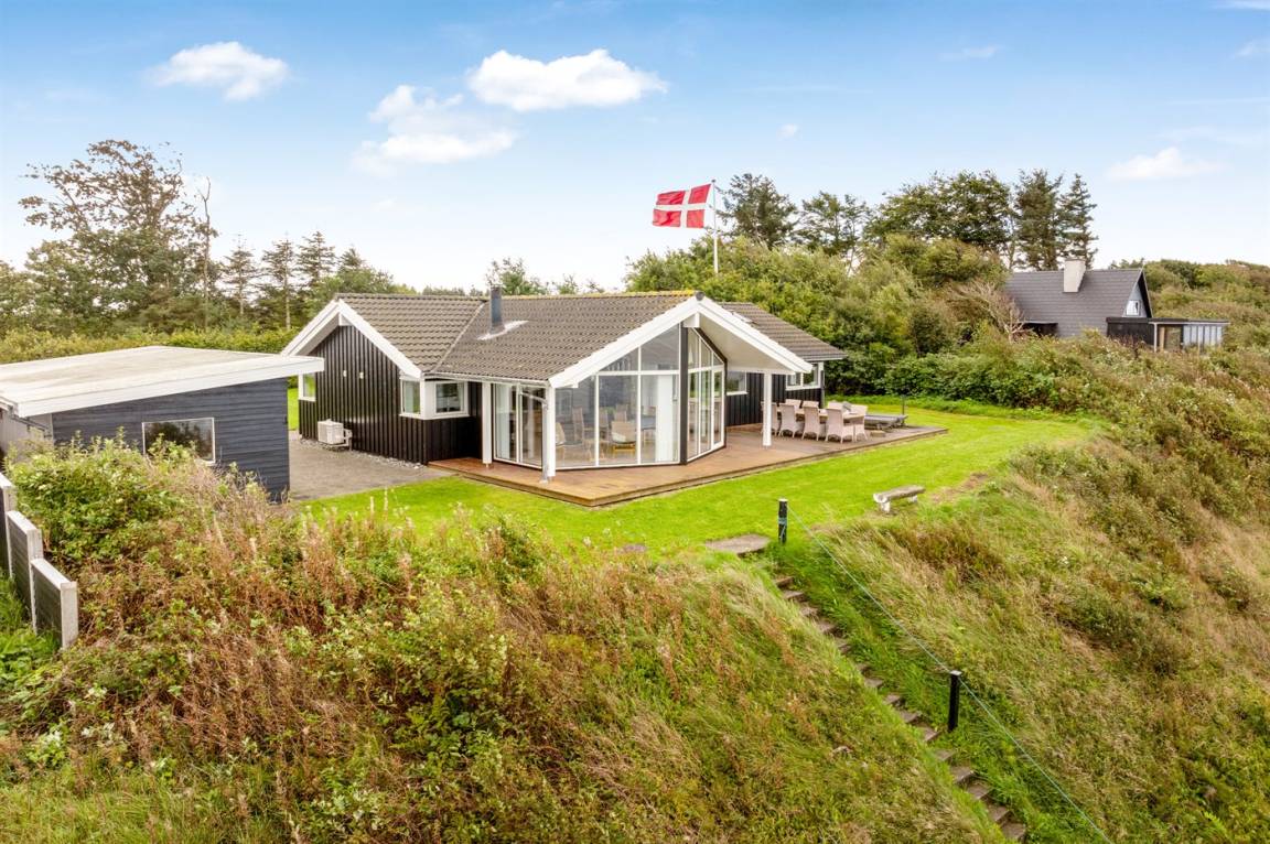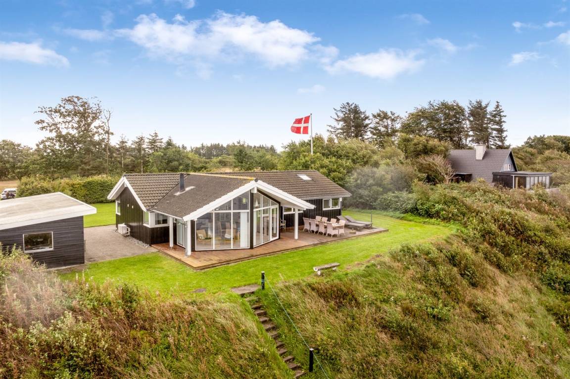 Hoch gelegen und mit wunderschönem Panoramablick über den Limfjord findest du dieses Ferienhaus, das an einem Hang liegt, von dem eine Treppe direkt zum Wasser führt.