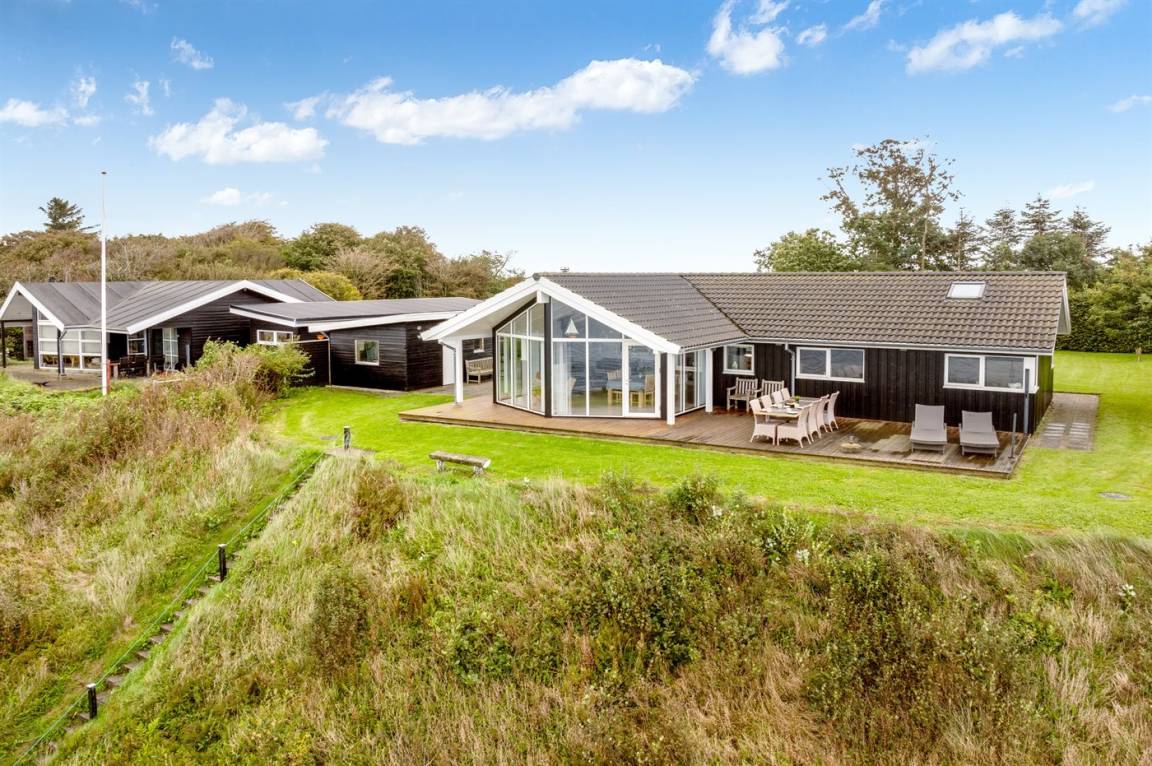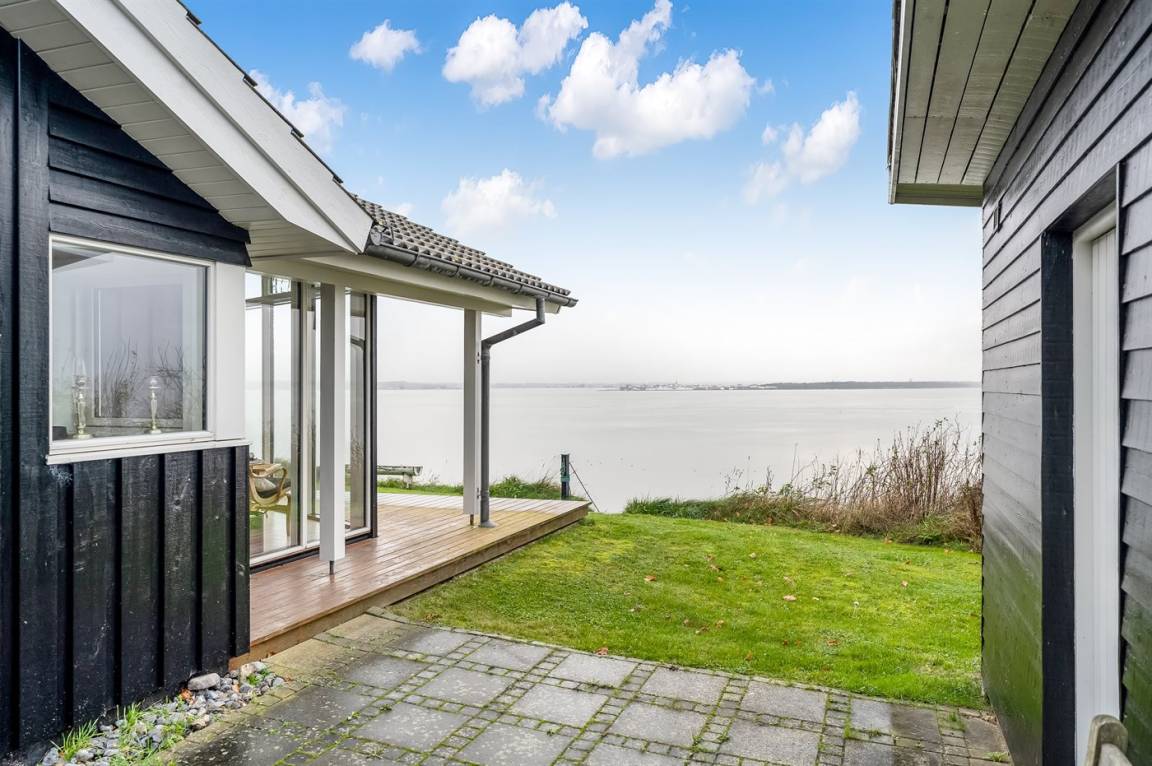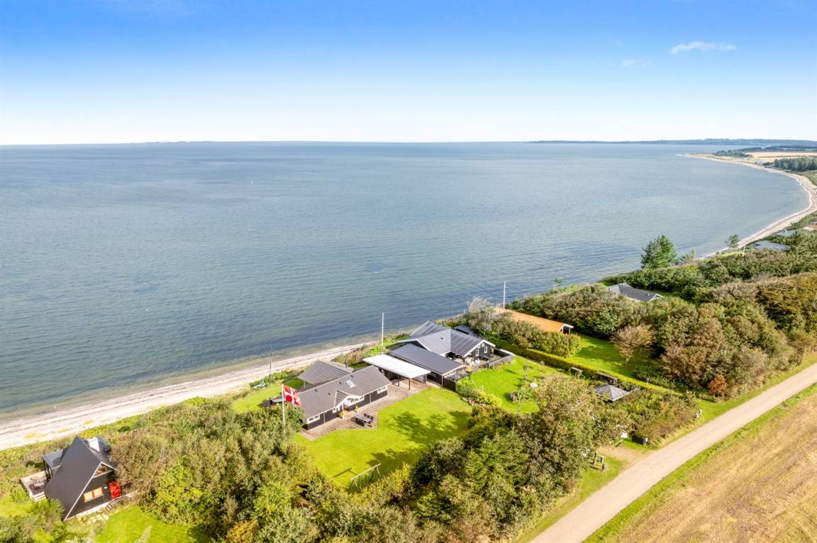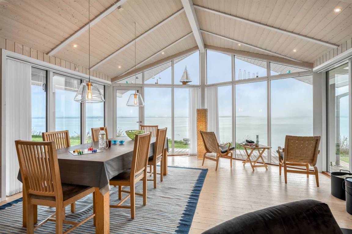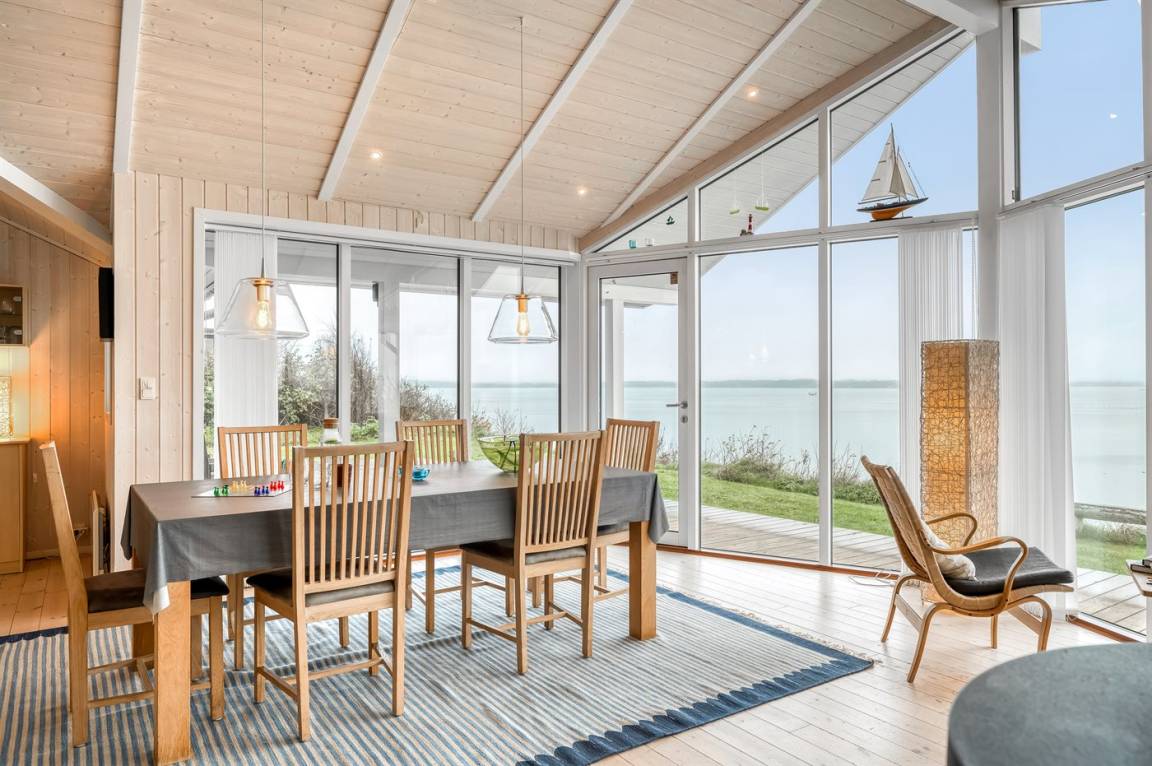 Hoch gelegen und mit wunderschönem Panoramablick über den Limfjord findest du dieses Ferienhaus, das an einem Hang liegt, von dem eine Treppe direkt zum Wasser führt.