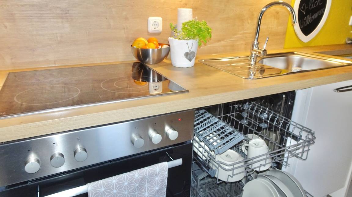 Die voll ausgestattete Küche lässt keine Wünsche offen. Cerankochfeld mit Bräterzone, Backofen mit Heißluft und Grillfunktion, Geschirrspüler, Mikrowelle, Kühlschrank mit Gefrierfach sowie Kaffeemaschine, Wasserkocher, Eierkocher und Toaster machen die Selbstversorgung unkompliziert und komfortabel. Geschirr und Besteck sind in großer Auswahl vorhanden.