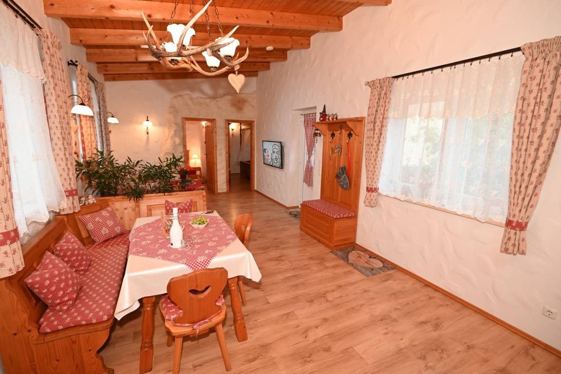 Der WOHN- und ESSBEREICH ist im Stile Sissis eingerichtet. Auf einem Ecksofa genießen Sie gemeinsame Abende vor dem Flachbild- TV. Der Essbereich bietet mit 2 Stühlen, einer Eckbank und einem Tisch Platz für ein herrliches Frühstück im Kreise der Familie.