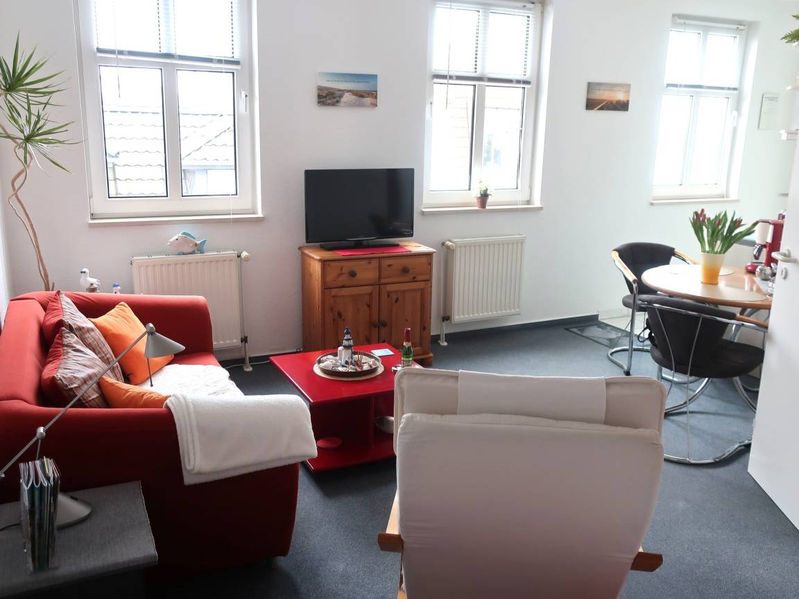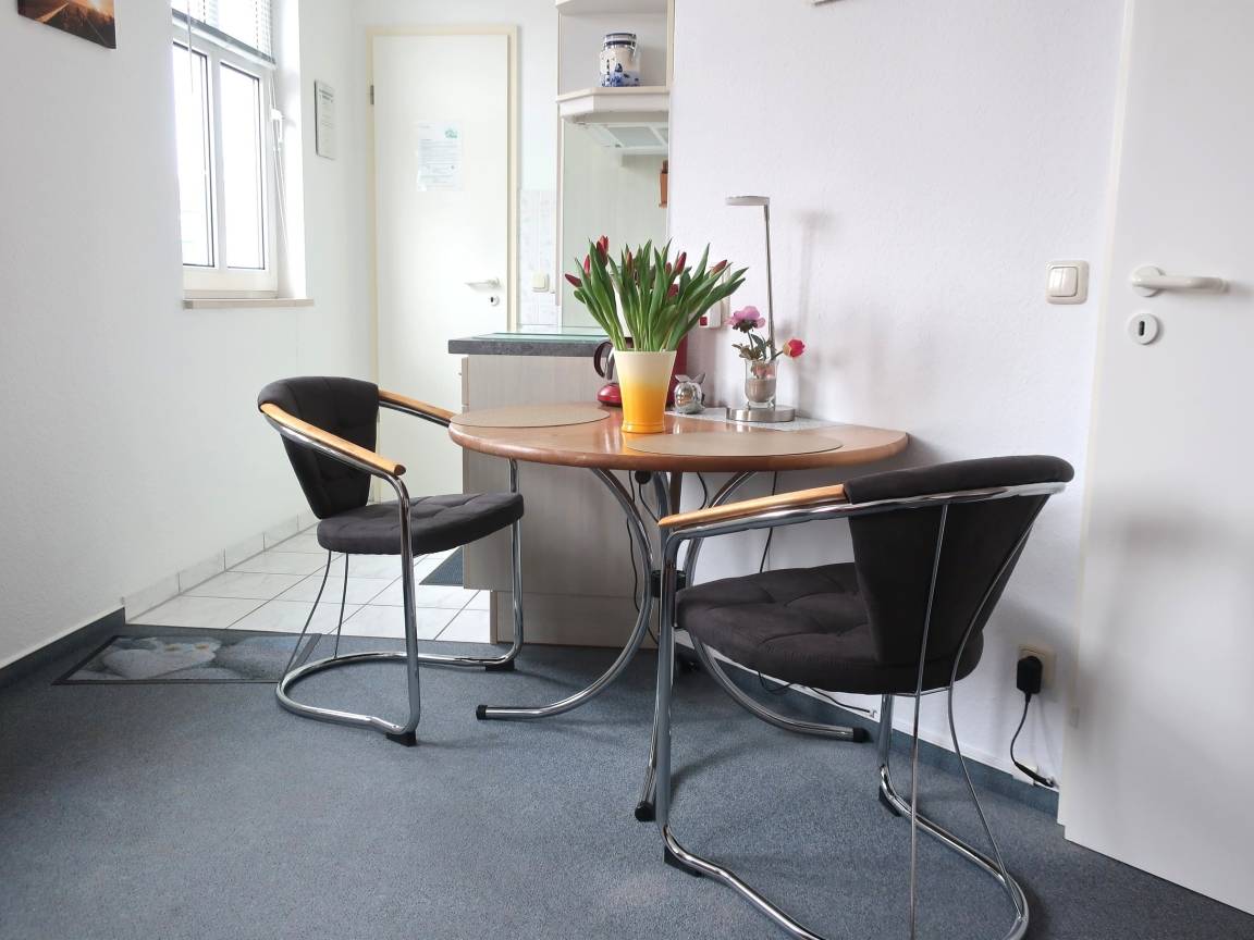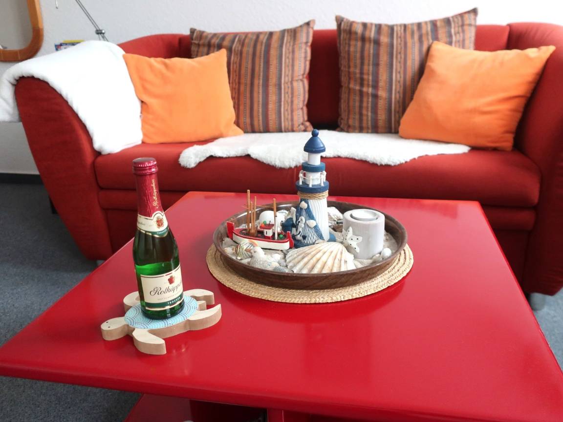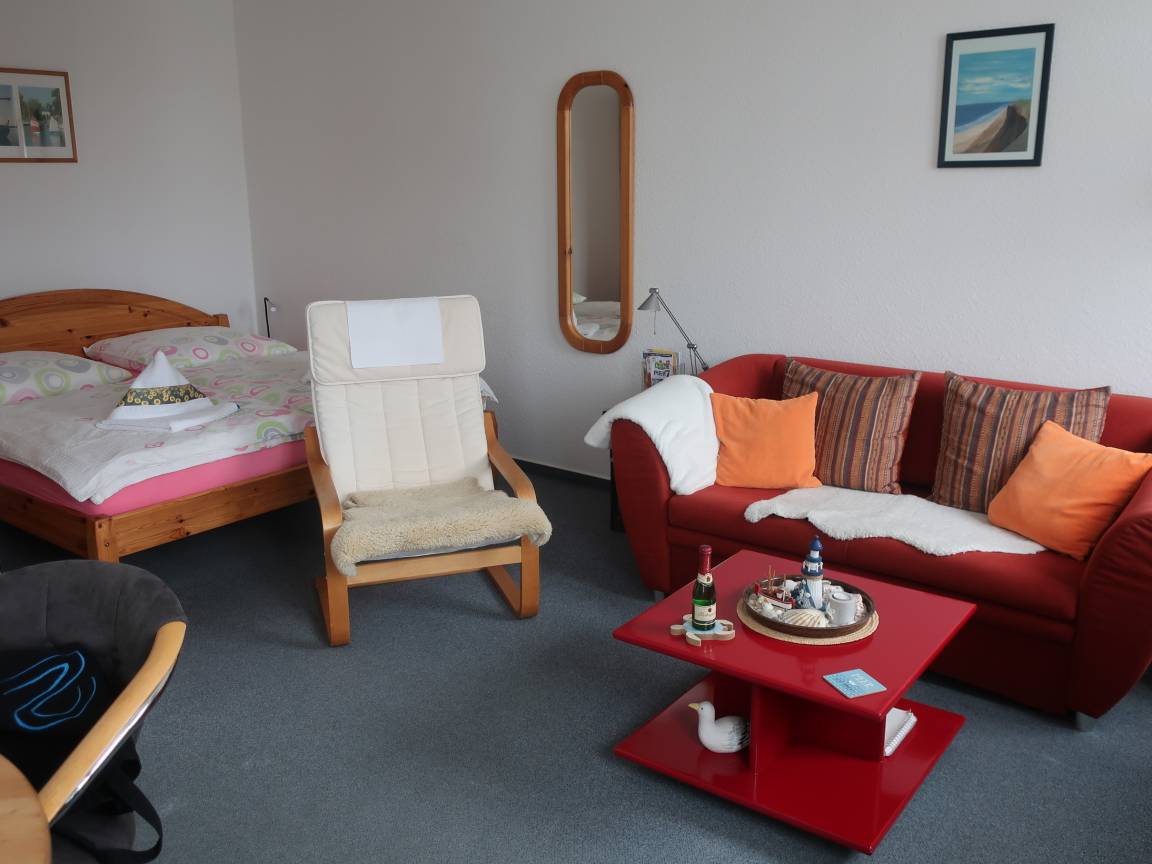 Die 1 Zimmer Ferienwohnung "Neptun 1" ist gemütlich eingerichtet. In der Wohnung befindet sich eine gut ausgestattete Küchenzeile mit Herd, Backofen, Geschirrspüler, Toaster, Kaffeemaschine, Kühlschrank und Geschirr. Auf dem Sofa kann man gemütlich den Abend zu zweit verbringen. Ein Flachbildfernseher gehört zur Ausstattung.