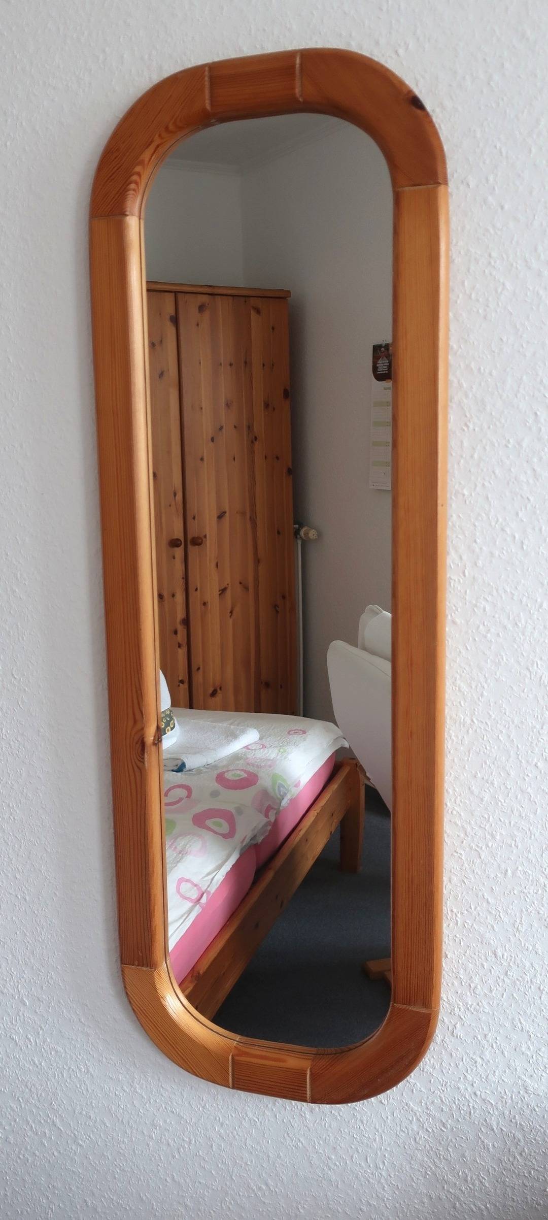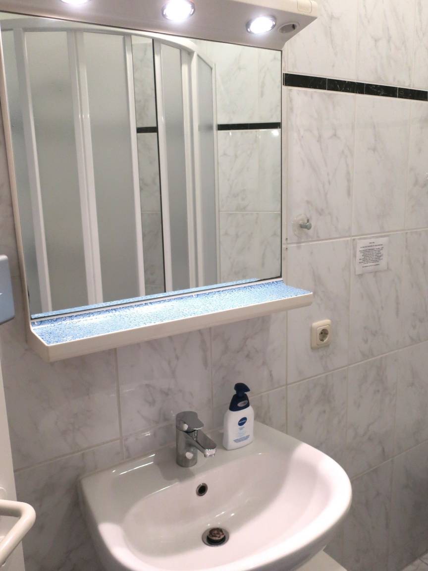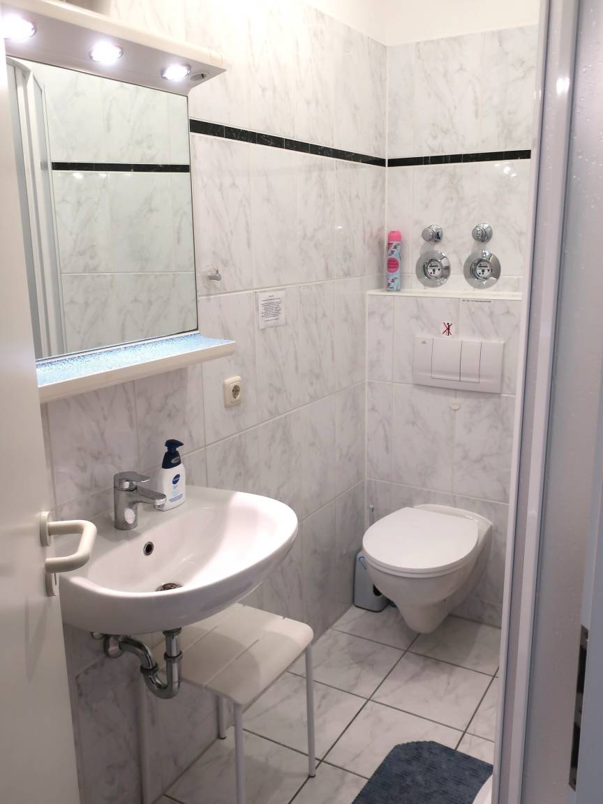 Das Doppelbett (180 cm x 200cm) und ein Kleiderschrank stehen separat im Zimmer. Das Bad ist mit einem Waschbecken, Toilette und Dusche ausgestattet. Seife und ein Fön sind vorhanden.