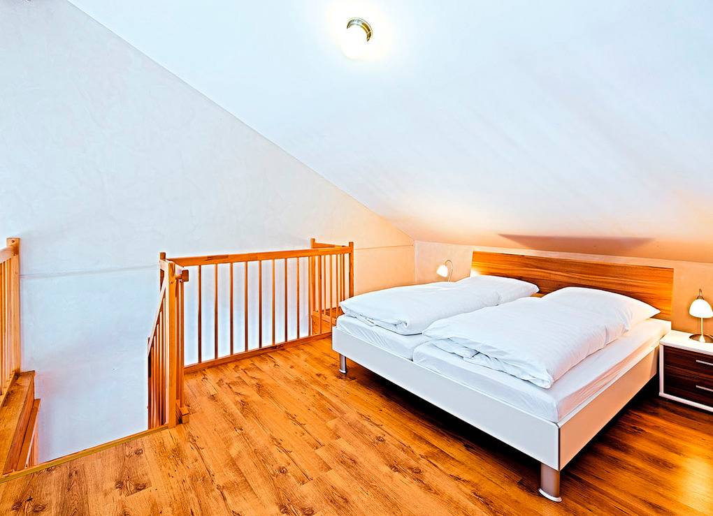 D 129.422 Wohnung 2-4 Pers.: Studio mit 60 qm Wohnfläche über 2 Etagen. 1. Etage: Großzügiger, bis zum Dachgiebel ausgebauter Wohn-/Essraum mit gemütlicher Sitzgruppe (Schlafsofa 2 Pers.), Sat-TV, Radio/CD, Esstisch, Pantryküche (Mikrowelle, Spülmaschine). Bad/WC. Vom Wohnraum aus, steile Stiege auf die hübsche Galerie: großzügiges Doppelzimmer, offen zum Wohnraum. 17 qm großer Balkon mit Sitzmöbeln, Strandkorb. Hinweis: Die Nutzung des Wellnessbereichs ist inklusive (2 Stunden/Tag, montags und dienstags geschlossen).