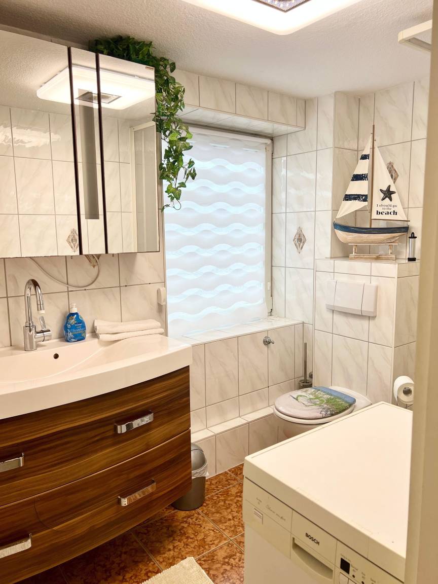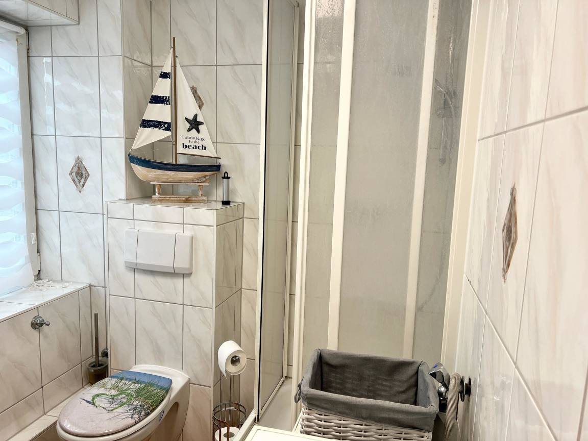 Die Wohnung ist zweckmäßig eingerichtet. Wir haben ein maritimes Schlafzimmer und einen größeren Dachgeschoss Raum, in dem 2 Schlaf-Recamieren stehen. Die Wohnung liegt in einer Doppelhaushälfte, Nahe am Waldrand