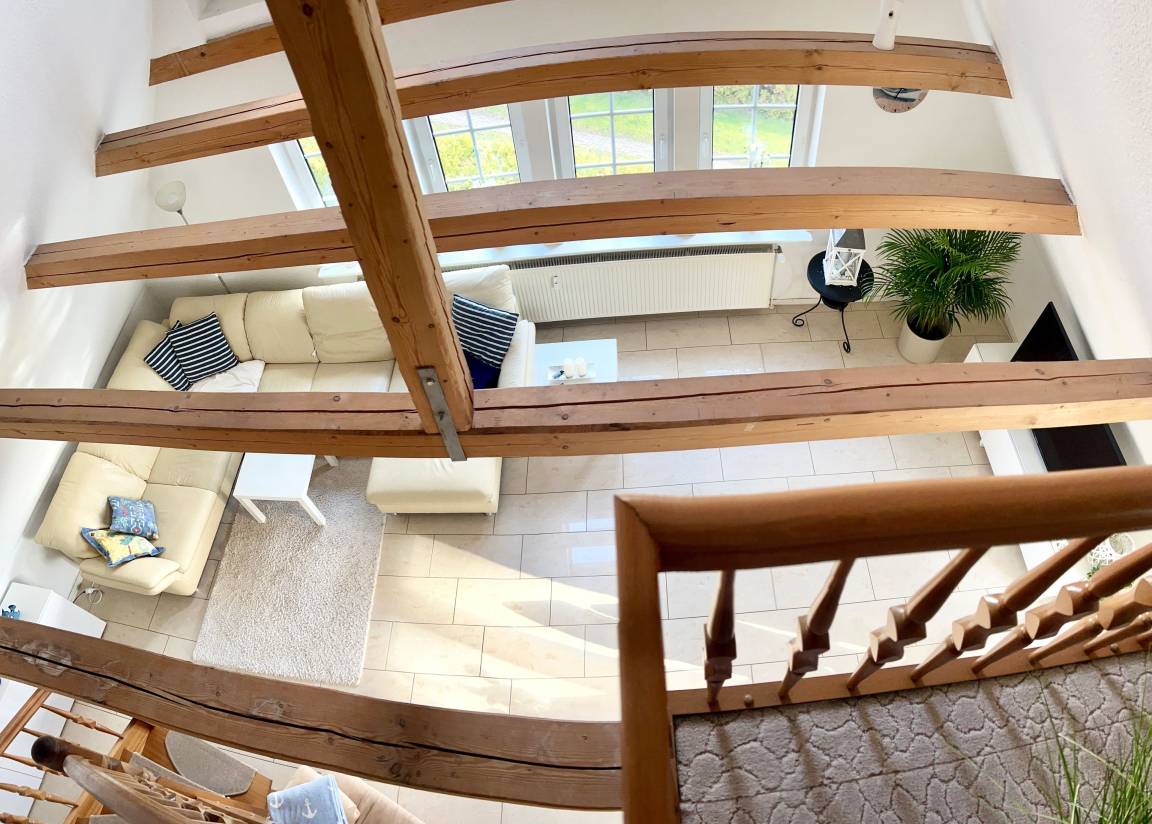 Der Flur erstreckt sich über eine offene Küche mit Esstisch hin zu einem großen Wohnzimmer mit offener Galerie und 6 m Deckenhöhe. Die Wohnung geht über 2 Etagen. Im Dachgeschoss ist ein Arbeits- und Schlafbereich.