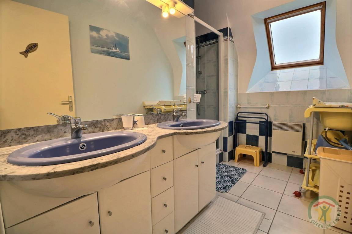 Dekor mit Meeresambiente. EG: Vorzimmer, Esszimmer-Wohnzimmer, Kamin, Einbau-Kochecke, WC/Handwaschbecken, 1 Zi. (1 Doppelbett, Bad mit Dusche und WC). Stockwerk: 1 Zi. (1 Doppelbett 160, 1 Babybett), 1 Zi.(1 Doppelbett 160), 1 Zi.(1 Doppelbett 160, 1 Kinderbett), 2 weitere Badezimmer mit Dusche und WC im Stockwerk. Elektrische Heizung und Nebenkosten im Mietpreis inbegriffen. Betten bei der Ankunft gemacht -kostenfrei. Fürs Baby: Stuhl, Bett, Badewanne, Wippe und Wagen. Kurzaufenthalte alles inklusive. Haustiere unter 15kg willkommen.