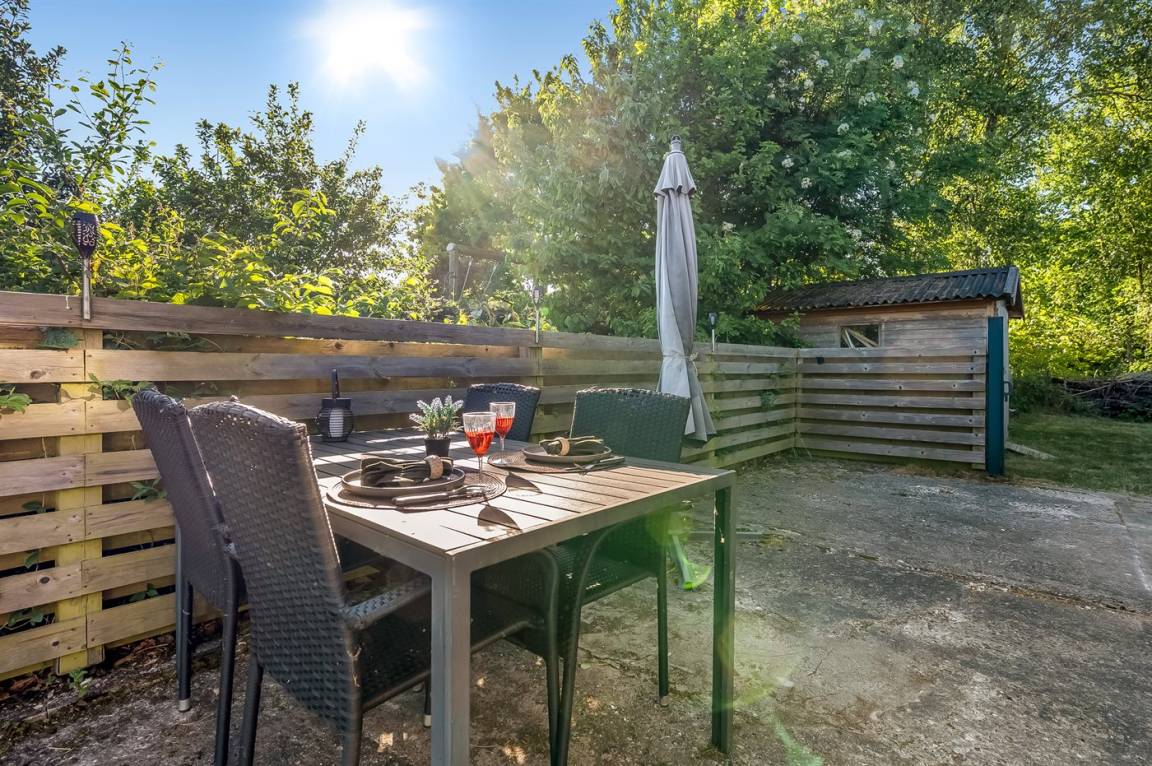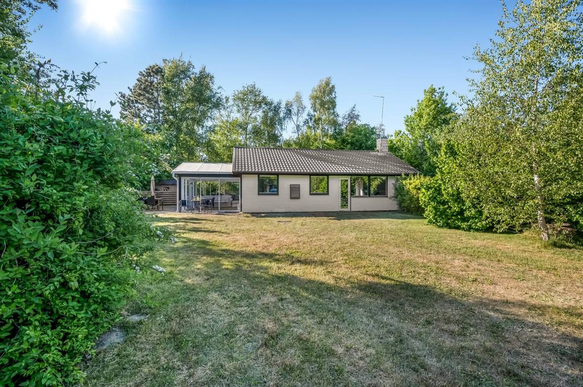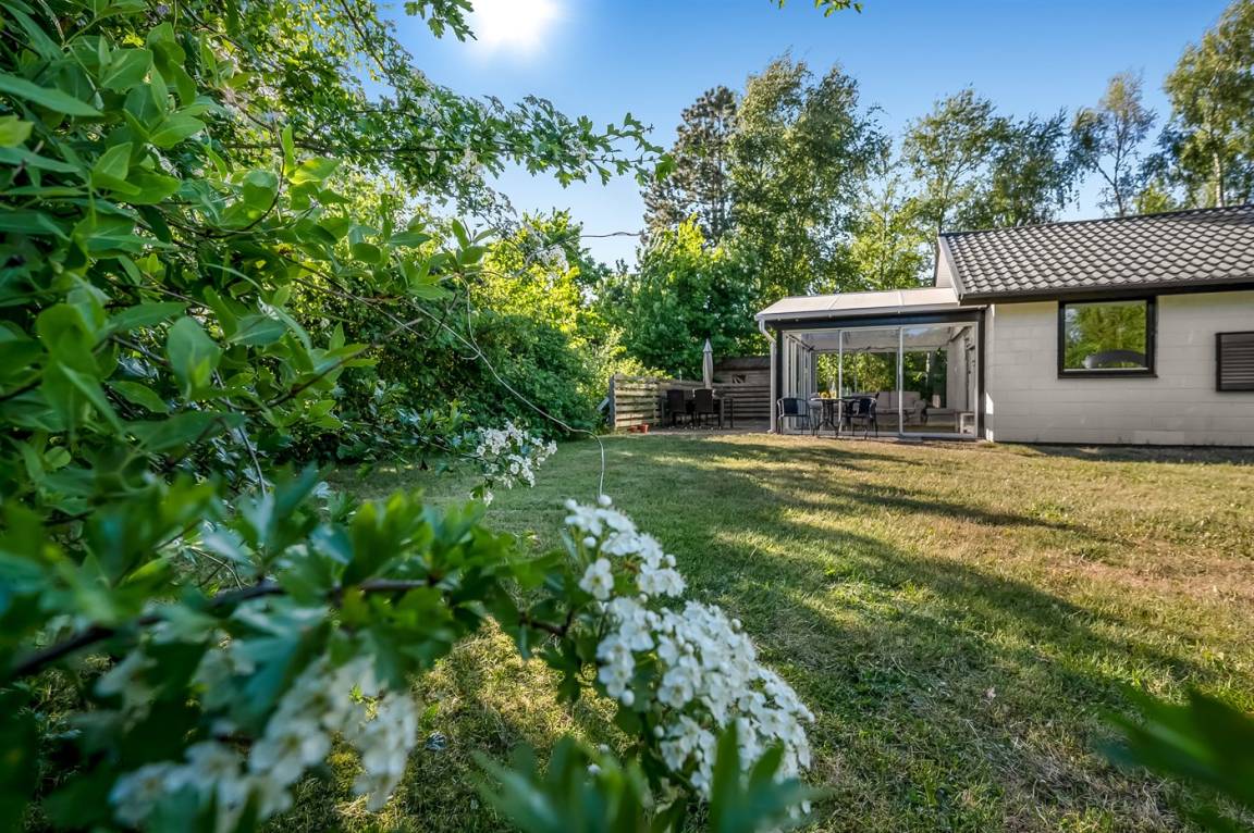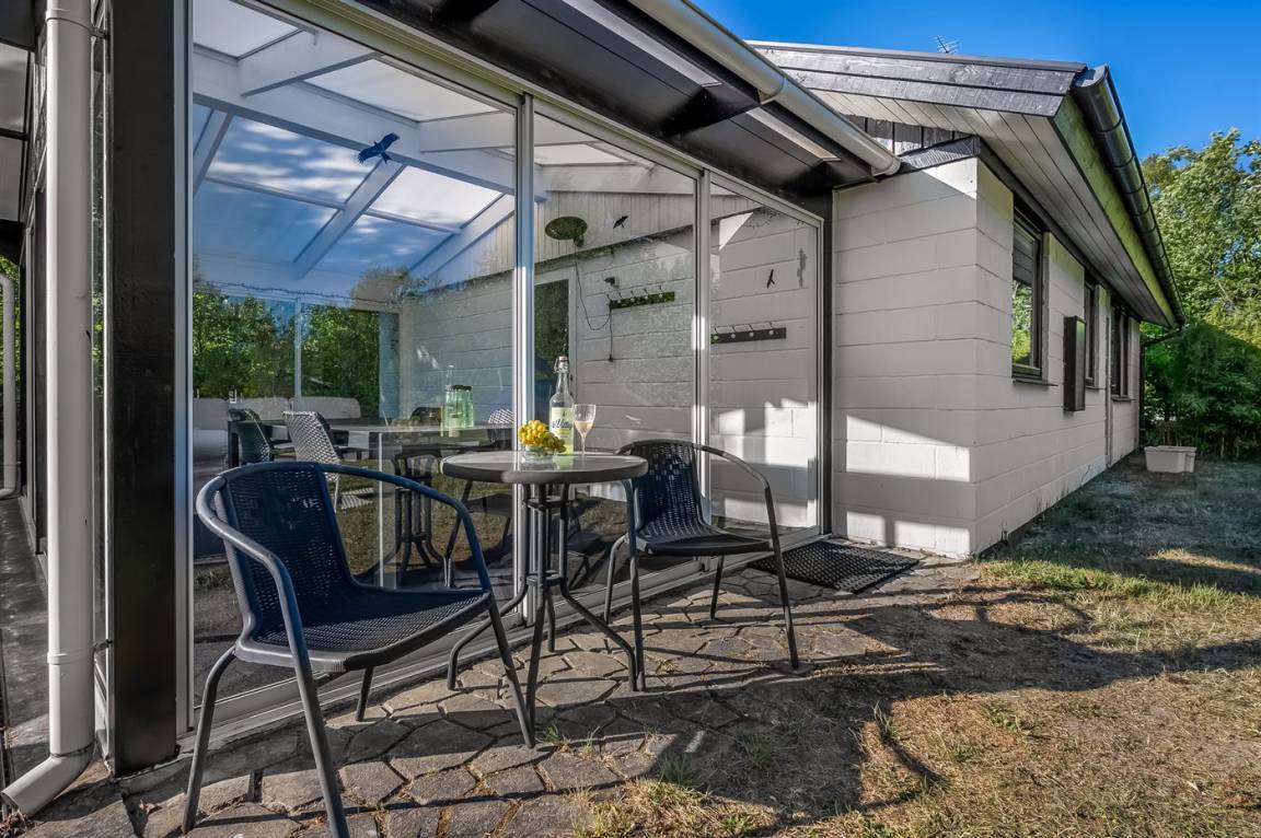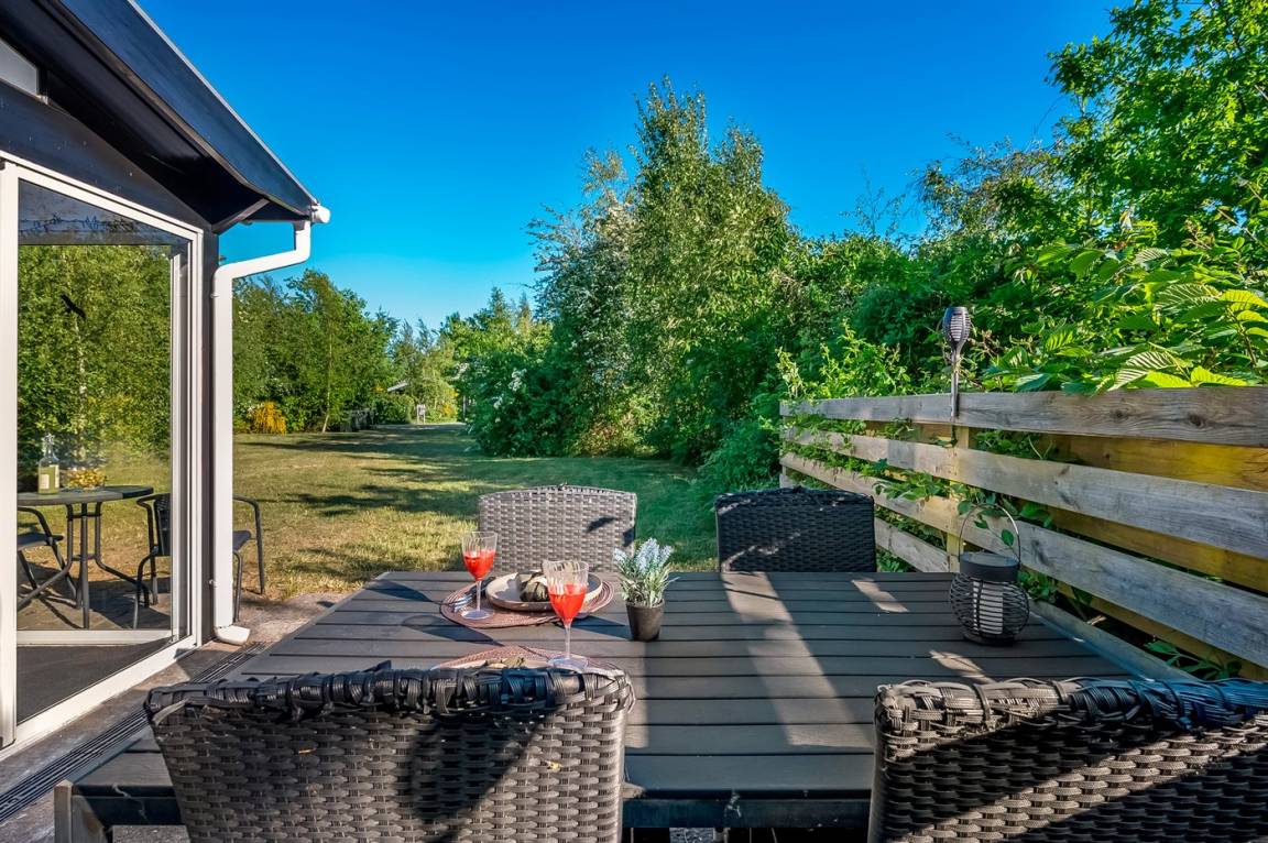 Das Ferienhaus liegt auf einem schönen Grundstück mit viel Platz zum Spielen und Entspannen. Es gibt eine herrliche Terrasse, auf der du die Sonne genießen und gleichzeitig einen guten Überblick über den Garten behalten kannst, während sich die Kinder spielen. Außerdem gibt es einen feinen Wintergarten, der die lauen Sommerabende verlängert. Das Ferienhaus liegt ungestört auf dem großen Grundstück – hier findest du immer eine windgeschützte Ecke, um die ruhige Umgebung in vollen Zügen zu genießen.