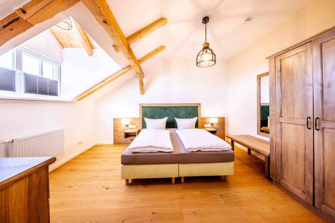 Der Ferienhof ist ein aus dem 19. Jh. stammender Vierseitenhof mit langer Geschichte. Die Ferienwohnung 21 bietet 1 Wohn- und 2 Schlafzimmer für 2 bis 5 Personen mit Küchenzeile, Bad und Balkon.