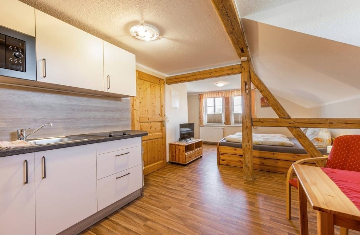 Der Ferienhof ist ein aus dem 19. Jh. stammender Vierseitenhof mit langer Geschichte. Das Ferienzimmer 10 ist besonders preiswert und richtig für zwei Personen. In der Küchenzeile finden Sie alles, was für eine Selbstversorgung wichtig ist.