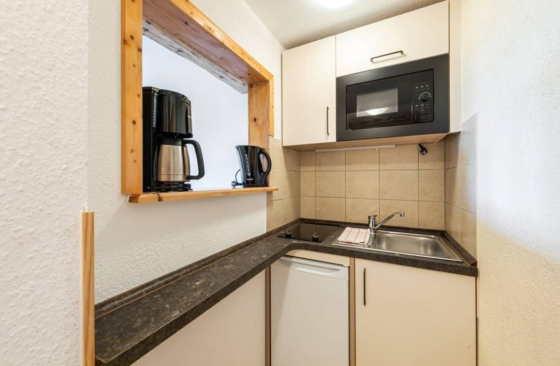 Küchenzeile mit Spüle, Geschirr, Kühlschrank, 2 Herdplatten