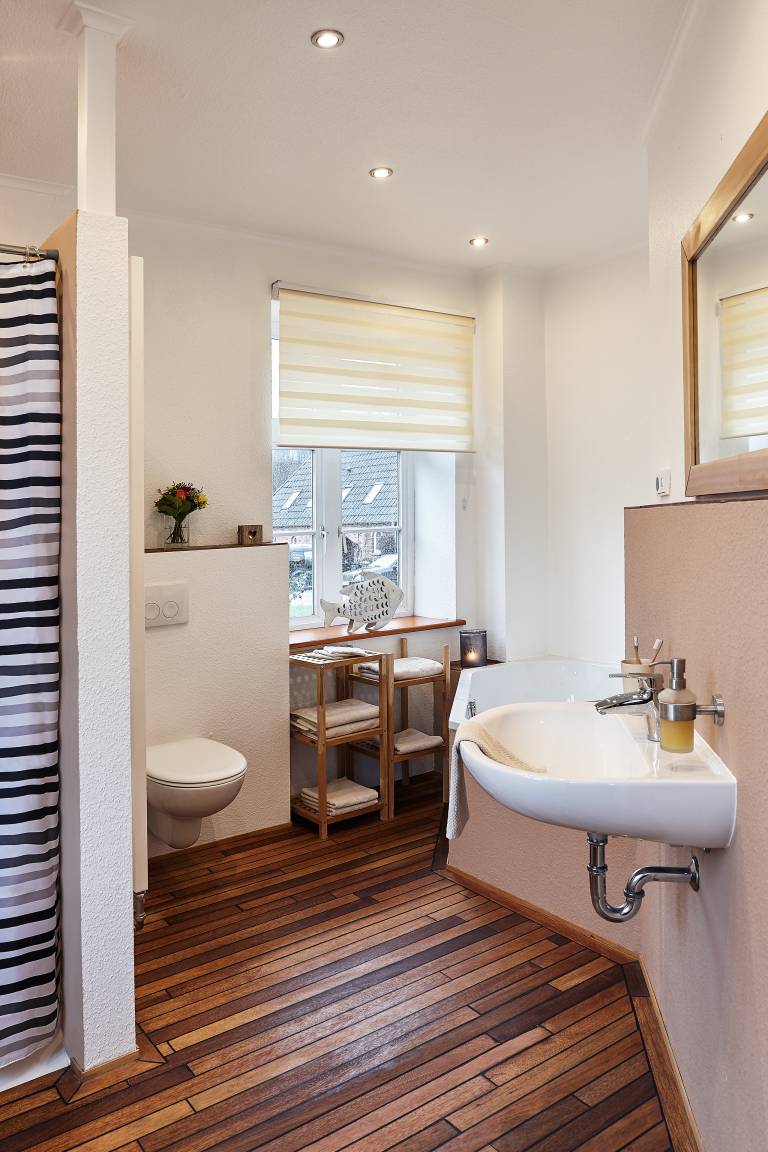Es gibt zwei Schlafzimmer mit Doppelbetten, eins mit zwei Einzelbetten und eins mit einem Einzel- und einem Etagenbett. Die Bäder sind geräumig und mit jeweils einer Dusche ausgestattet. In dem größeren Bad befindet sich sogar eine Badewanne für erholsame Stunden.
