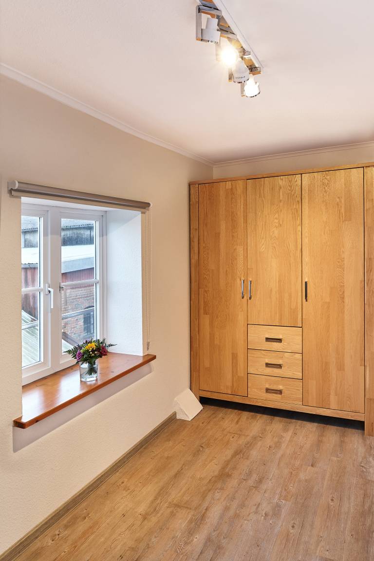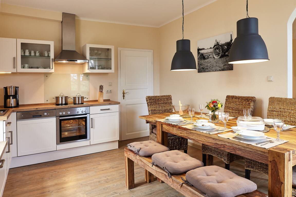 Die Ferienwohnung "Nielück" ist für bis zu neun Personen ausgelegt. Sie befindet sich in einem Teil des Haupthauses des Dreiseitenhofes in Fraulund. In der großzügigen Stube sorgt der Kamin für kuschelige Stunden. Die Küche glänzt durch ihre gute Ausstattung von Toaster, Wasserkocher und Kaffeemaschine bis hin zur Mikrowelle und Spülmaschine. An dem großen Esstisch finden alle Familienmitglieder Platz, sei es für lustige Spieleabende oder entspannte Mahlzeiten.
