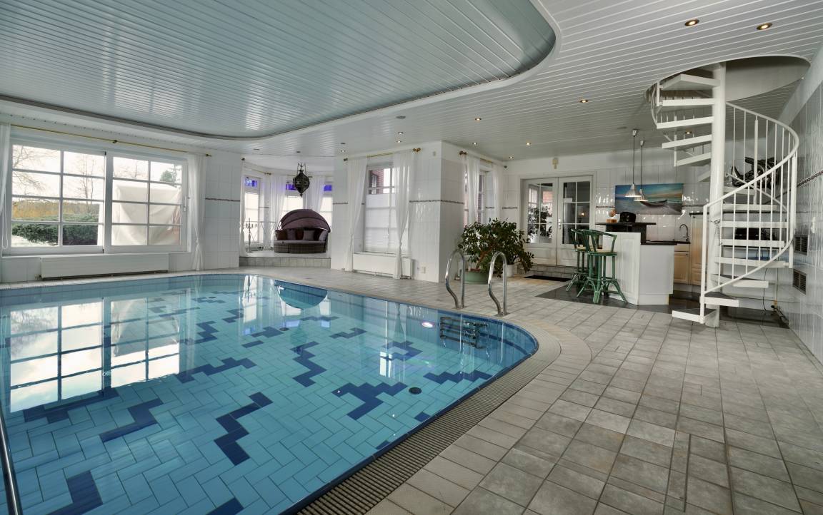 Willkommen in unserer luxuriösen Sterne-Villa, einem Paradies der Entspannung und des Komforts. Mit einem Indoor-Pool, einer Sauna und einem gemütlichen Kamin bietet dieses elegante Anwesen auf 570 Quadratmetern Wohnfläche alles, was das Herz begehrt. Die umfangreichen Annehmlichkeiten umfassen auch ein voll ausgestattetes Fitnessstudio mit ca. 20 Geräten.